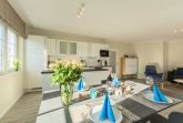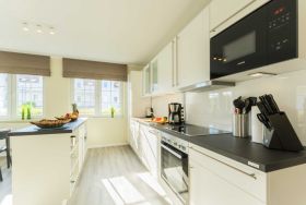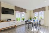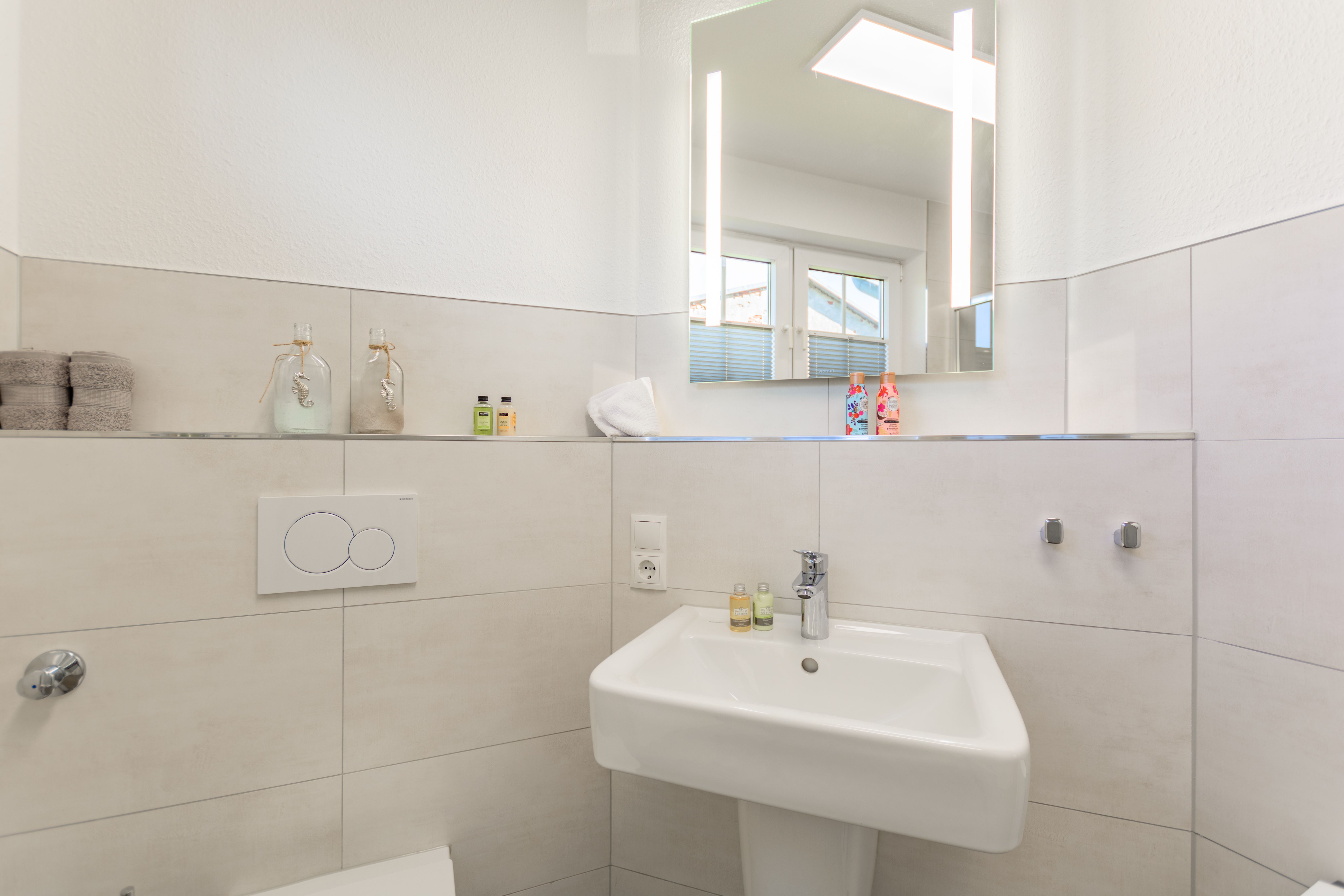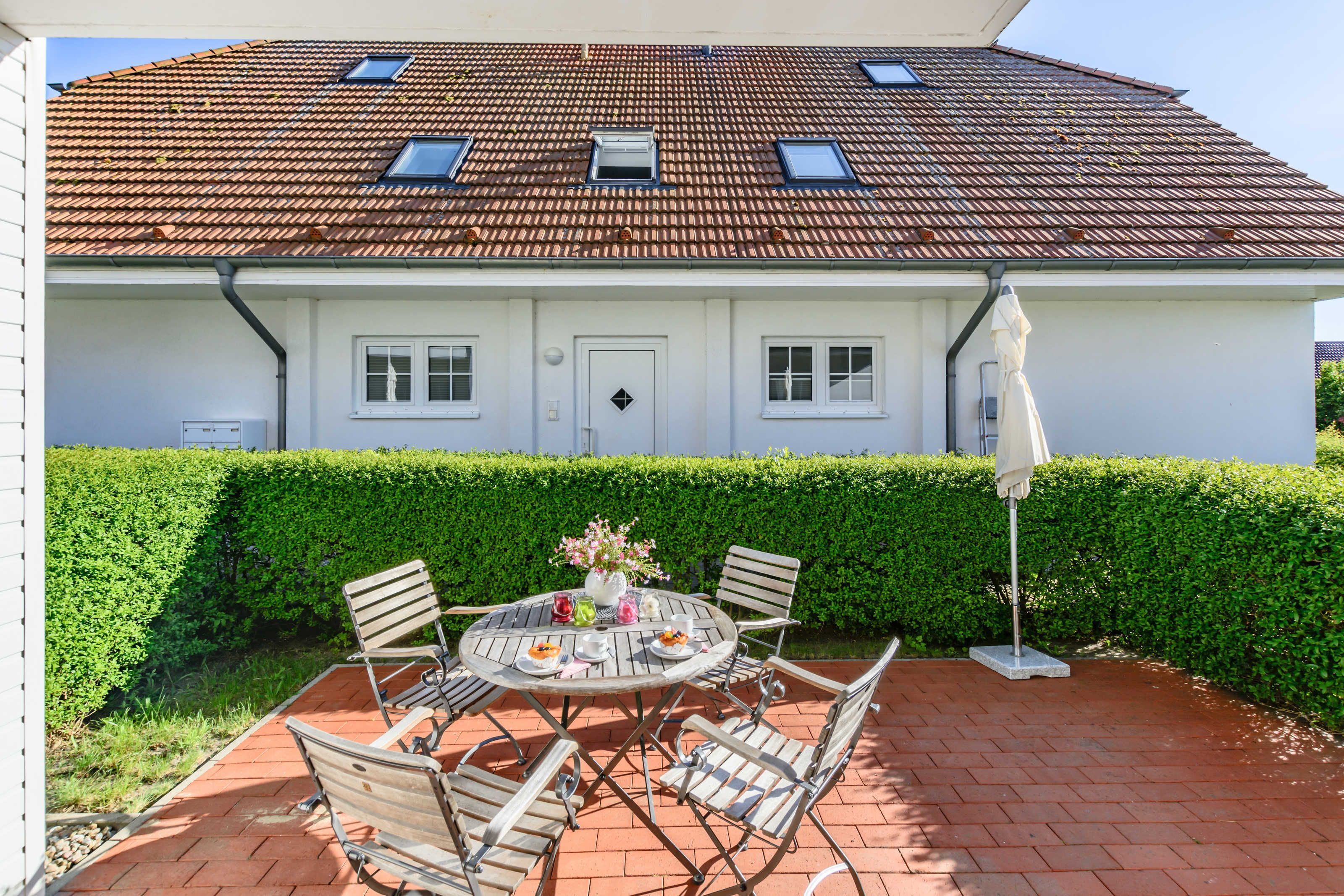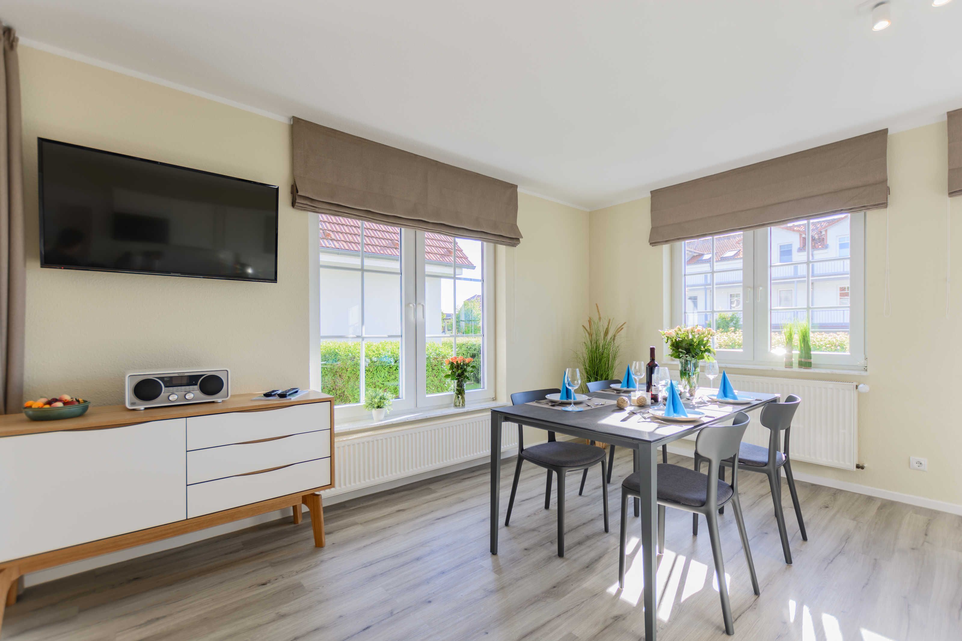 Die Nichtraucherferienwohnung befindet sich im Erdgeschoss und erstreckt sich über ca. 60 qm, wo sich max. 4 Erwachsene wohlfühlen können. Der großzügige und helle Wohn- Essbereich ist mit einer modernen Küchenzeile ausgestattet. Mit einem Kühlschrank mit Eisfach, Geschirrspüler, Cerankochfeld, Backofen, Mikrowelle, Wasserkocher, Kaffeemaschine, Toaster, Mixer, Waffeleisen können Sie Ihre gemütlichen Kochabende ganz individuell gestalten. Ein passender Essbereich rundet die Gemütlichkeit ab. Im angrenzenden Wohnbereich trägt eine bequeme Couch (Aufbettungsmöglichkeit für 3./4.Person, 1,50m x 1,95m) mit Couchtisch, ein Lesesessel mit Hocker sowie ein TV-Board zu Ihrer Entspannung bei. Die technische Ausstattung umfasst einen Smart-TV, ein DAB-Bluetooth-Radio sowie einen WLAN-Anschluss. Vom Wohnbereich gelangen Sie auf Ihre bestuhlte Terrasse (Süd) mit Sonnenschirm, von wo Sie aus Ihren Tag entspannt bei einem Glas Wein ausklingen lassen können. Hell und freundlich eingerichtet erwartet Sie ein gemütliches Schlafzimmer, mit einem komfortablen Boxspring-Bett (1,80m x 2,00m) mit 5 Zonen Tonnen-Taschenfederkern-Matratzen, Nachttischablagen, einen großzügigen Kleiderschrank sowie ein Smart-TV. Der Schlafbereich verfügt zudem über Vorhänge, die nahezu lichtundurchlässig sind und einen guten Sicht- und Sonnenschutz bieten. Für einen angenehmen Schlaf sorgen zusätzlich Insektenschutzgitter im Wohn- & Schlafbereich. Das Tageslicht-Badezimmer ist mit einer ebenerdigen Dusche, einem WC, einem Fön sowie einem Waschtisch ausgestattet. In der Wohnung finden Sie zusätzlich ein Staubsauger, ein Besen mit Kehrset, ein Wäscheständer sowie ein Wäschekorb. Im Nachbarhaus C können Sie eine Waschmaschine sowie einen Trockner gegen Gebühr nutzen. Hier stehen auch ein Bügelbrett und ein Bügeleisen zur Verfügung. Haustiere sind nicht erlaubt. Das Grillen auf dem ausgewiesenen Gemeinschaftsplatz lädt zu gemütlichen Abenden ein. Zur Entspannung lädt eine münzbetriebene Sauna mit kleinem Ruheraum im Untergeschoss von Haus B ein. Ihre Fahrräder können Sie begrenzt im Gemeinschaftskeller oder auf dem Grundstück abstellen. Ein PKW-Stellplatz steht Ihnen inklusive zur Verfügung. Die Erstausstattung eines Wäschepaketes (komplette Bettwäsche, 1 Duschhandtuch, 2 kleine Handtücher) können Sie bis 14 Tage vor Anreise gegen einen Aufpreis dazu buchen oder durch eigene ergänzen. Ab 2 gebuchten Paketen erhalten Sie einmalig 1 Geschirrhandtuch und 1 Duschvorleger hinzu.