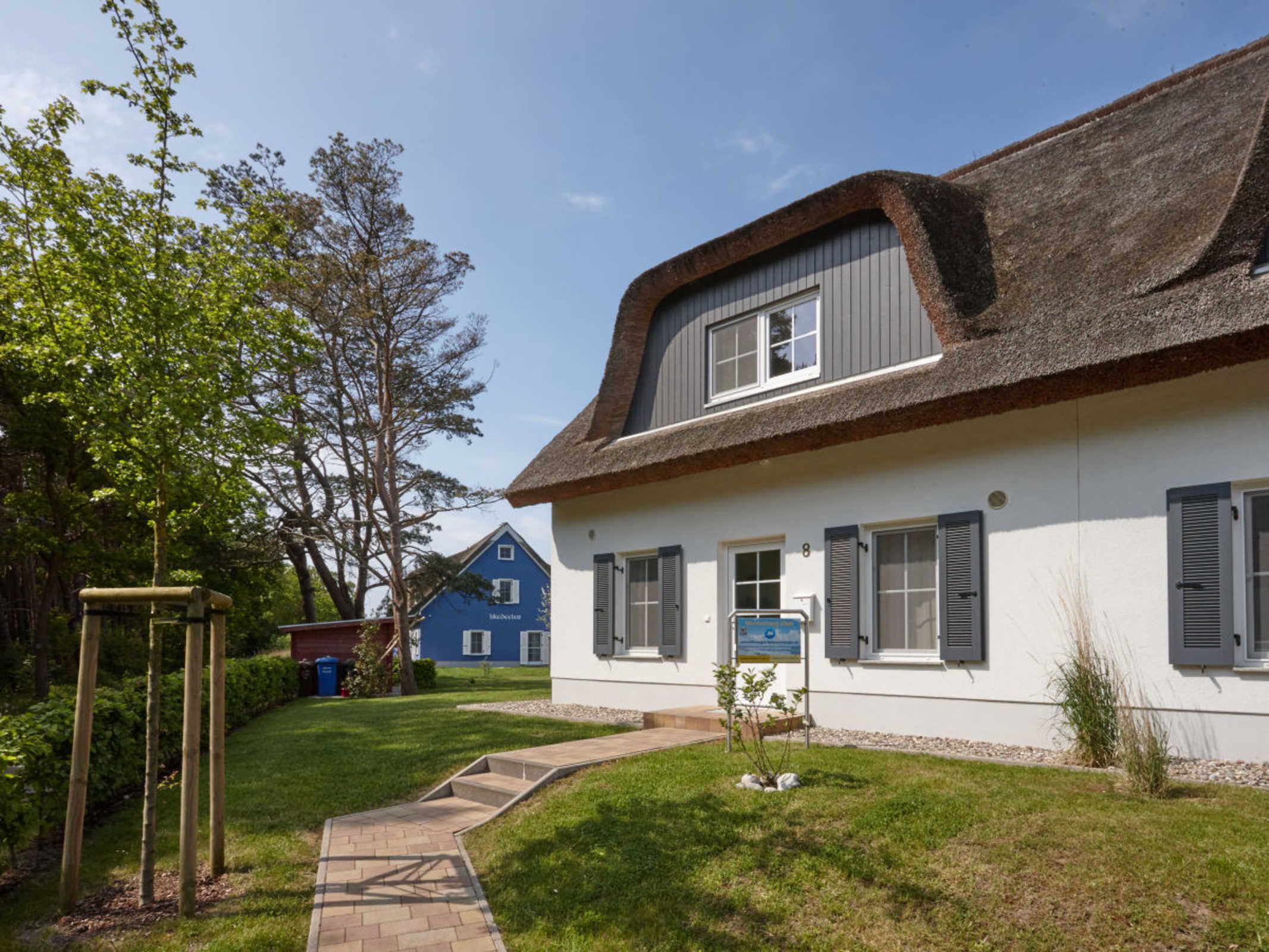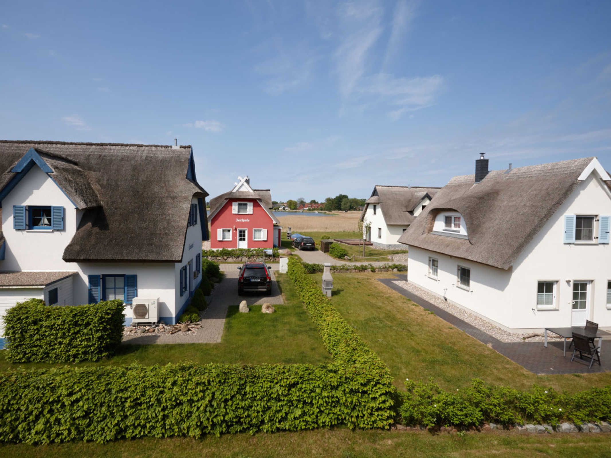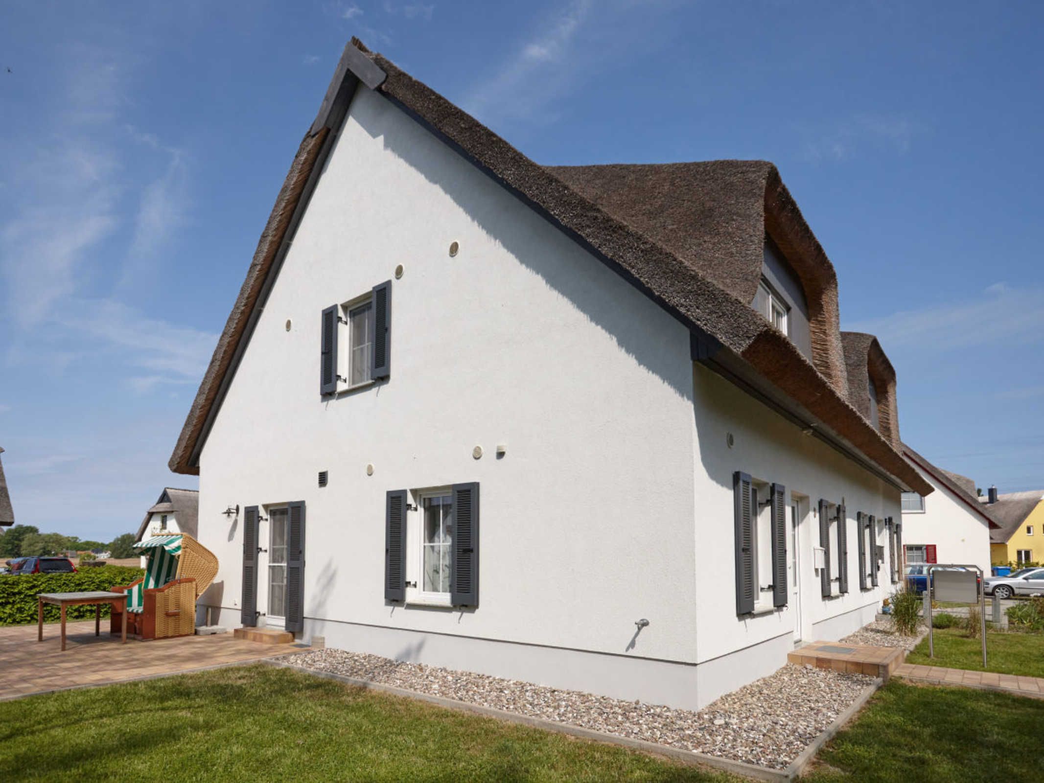 Die reetgedeckte Doppelhaushälfte Wellenläufer liegt in ruhiger Lage zwischen Breeger Bodden (80m) und der Ostsee (400m).