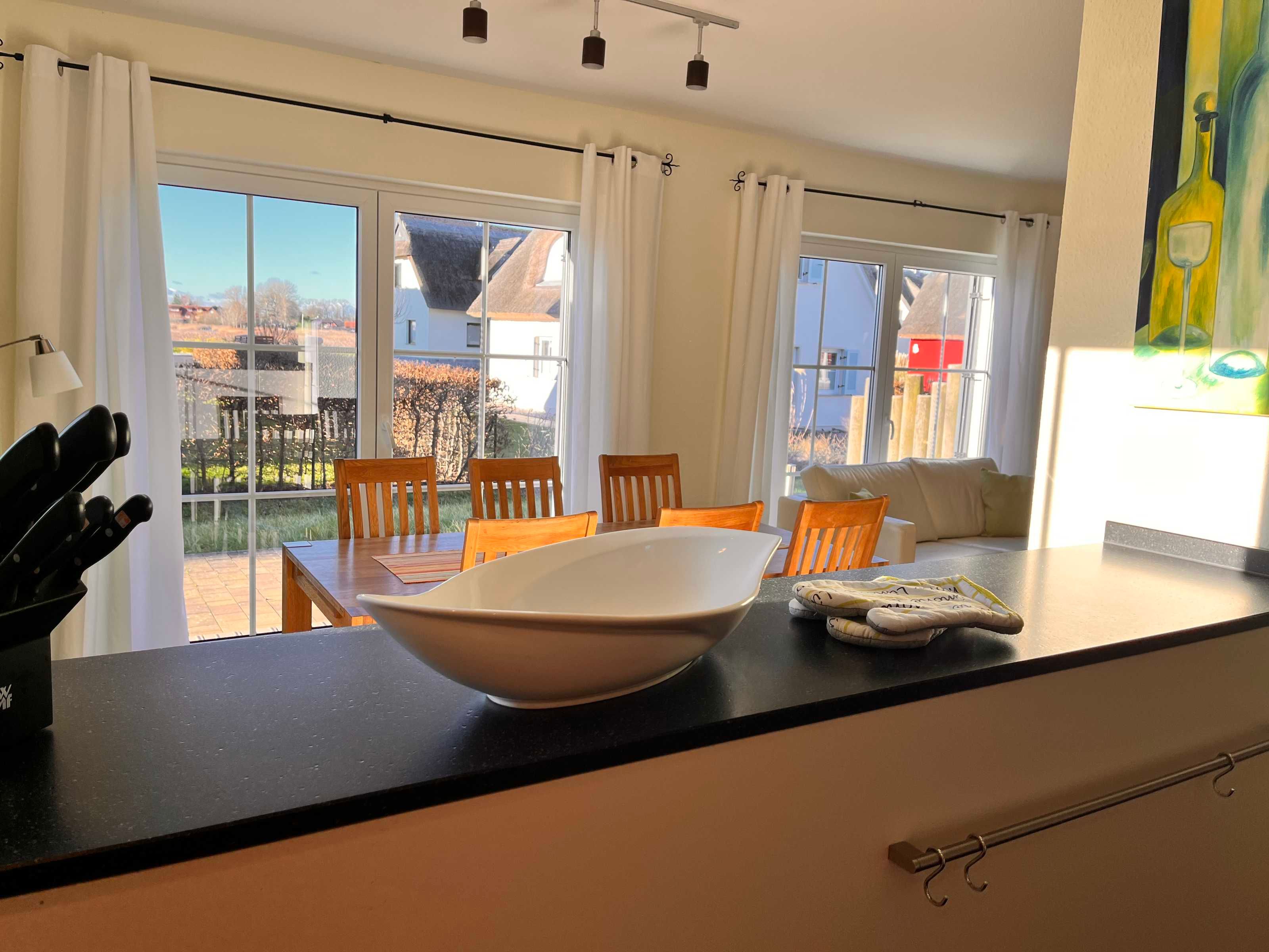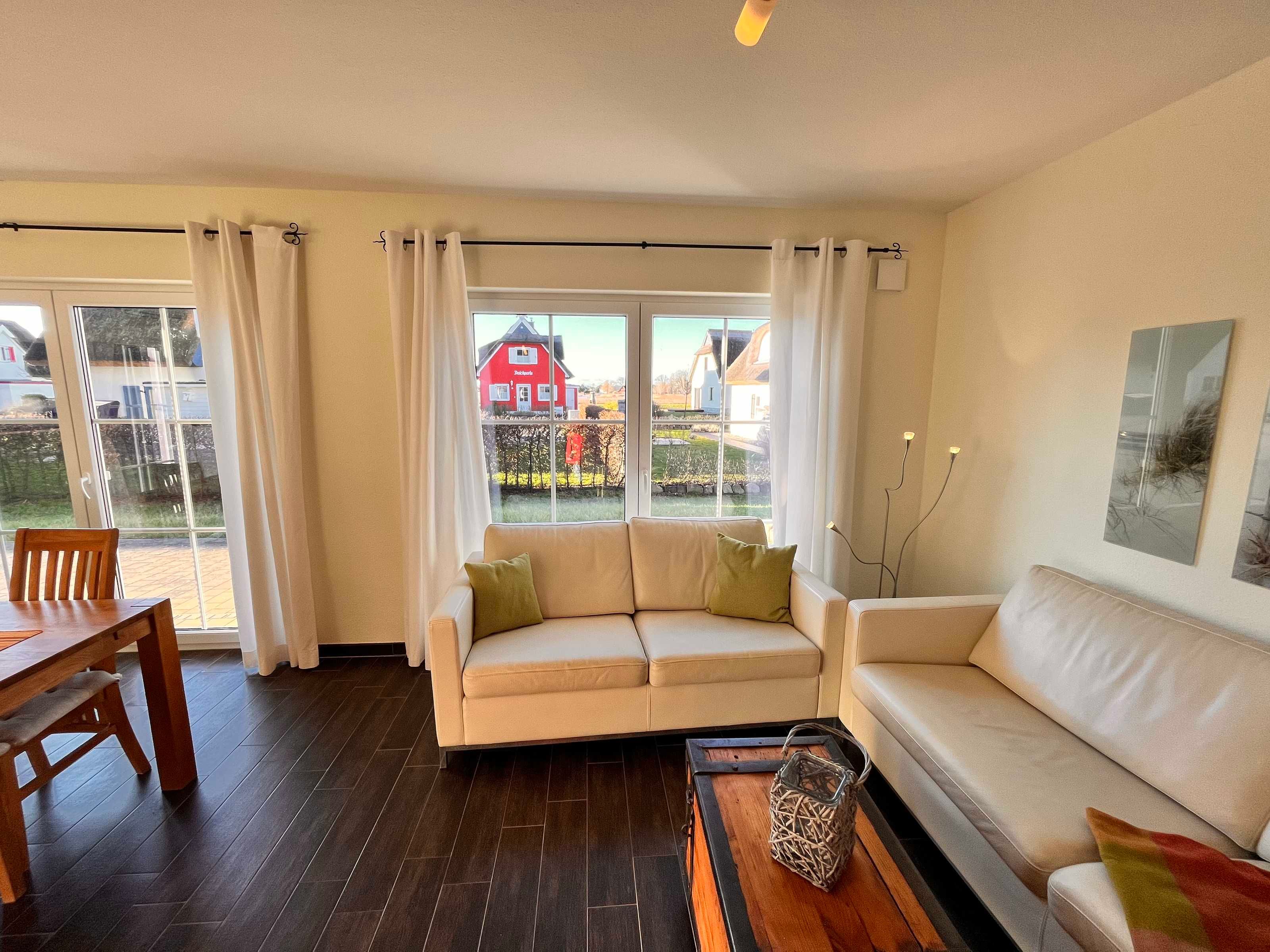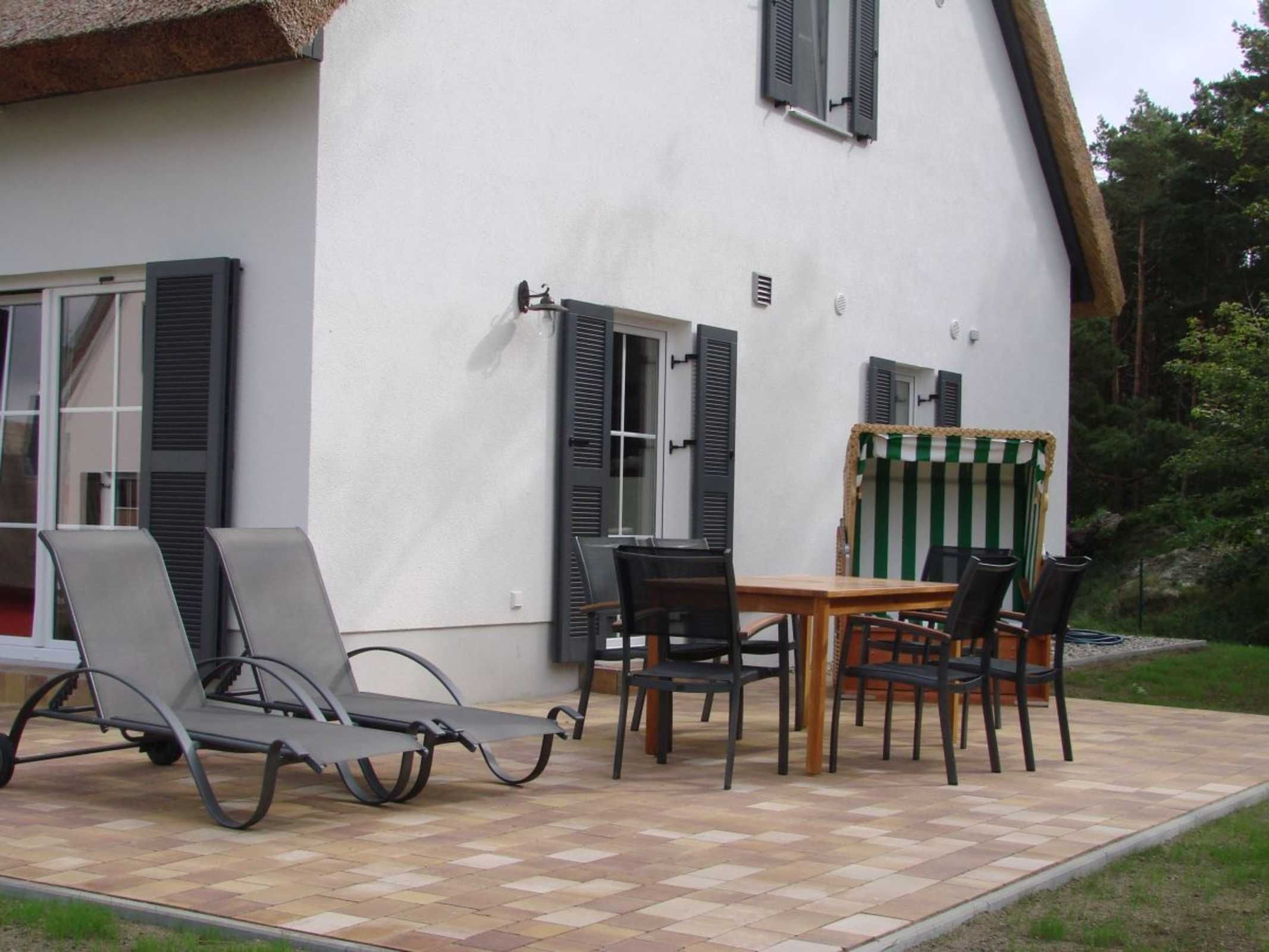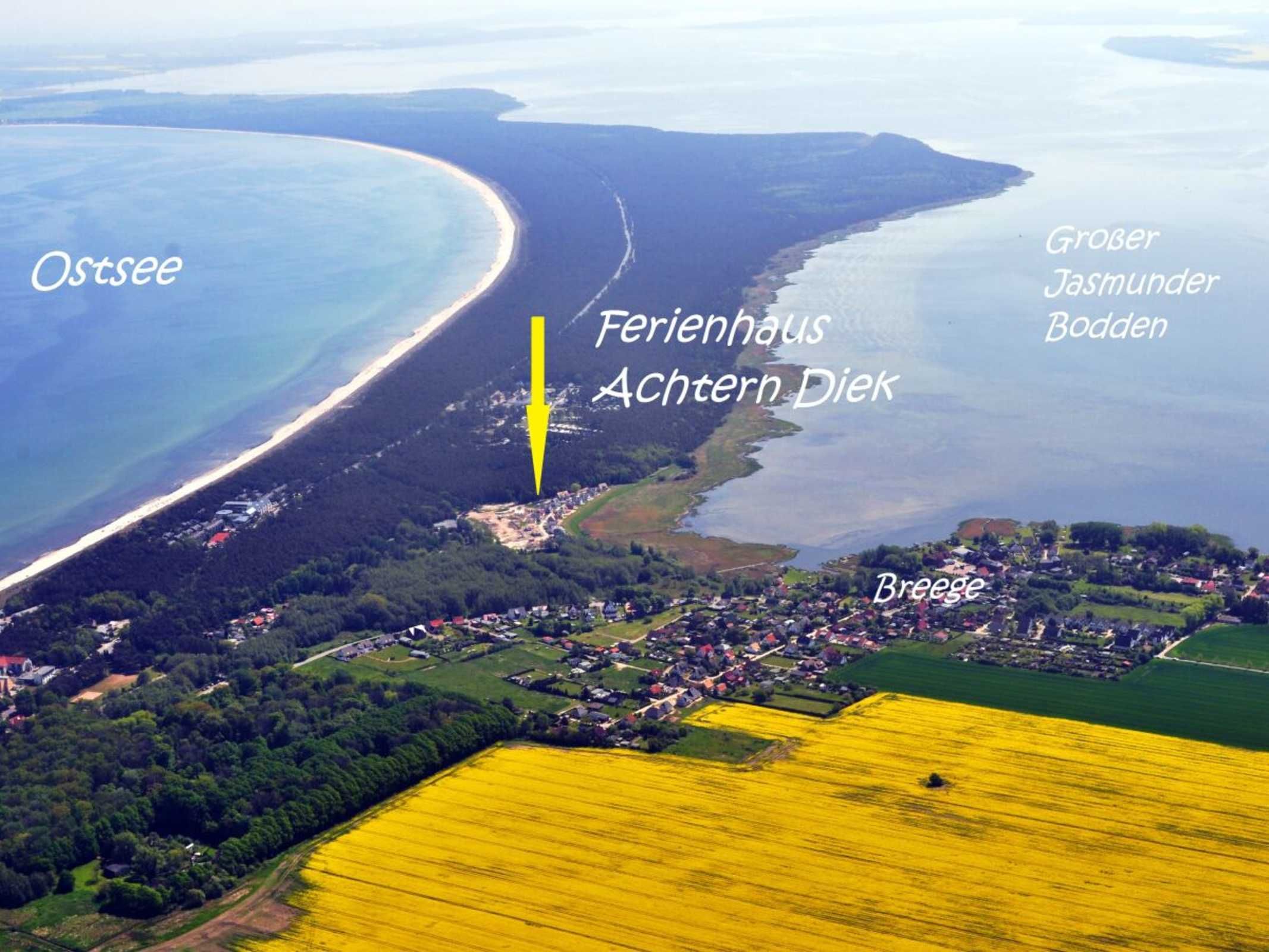 Die reetgedeckte Doppelhaushälfte Wellenläufer liegt in ruhiger Lage zwischen Breeger Bodden (80m) und der Ostsee (400m).