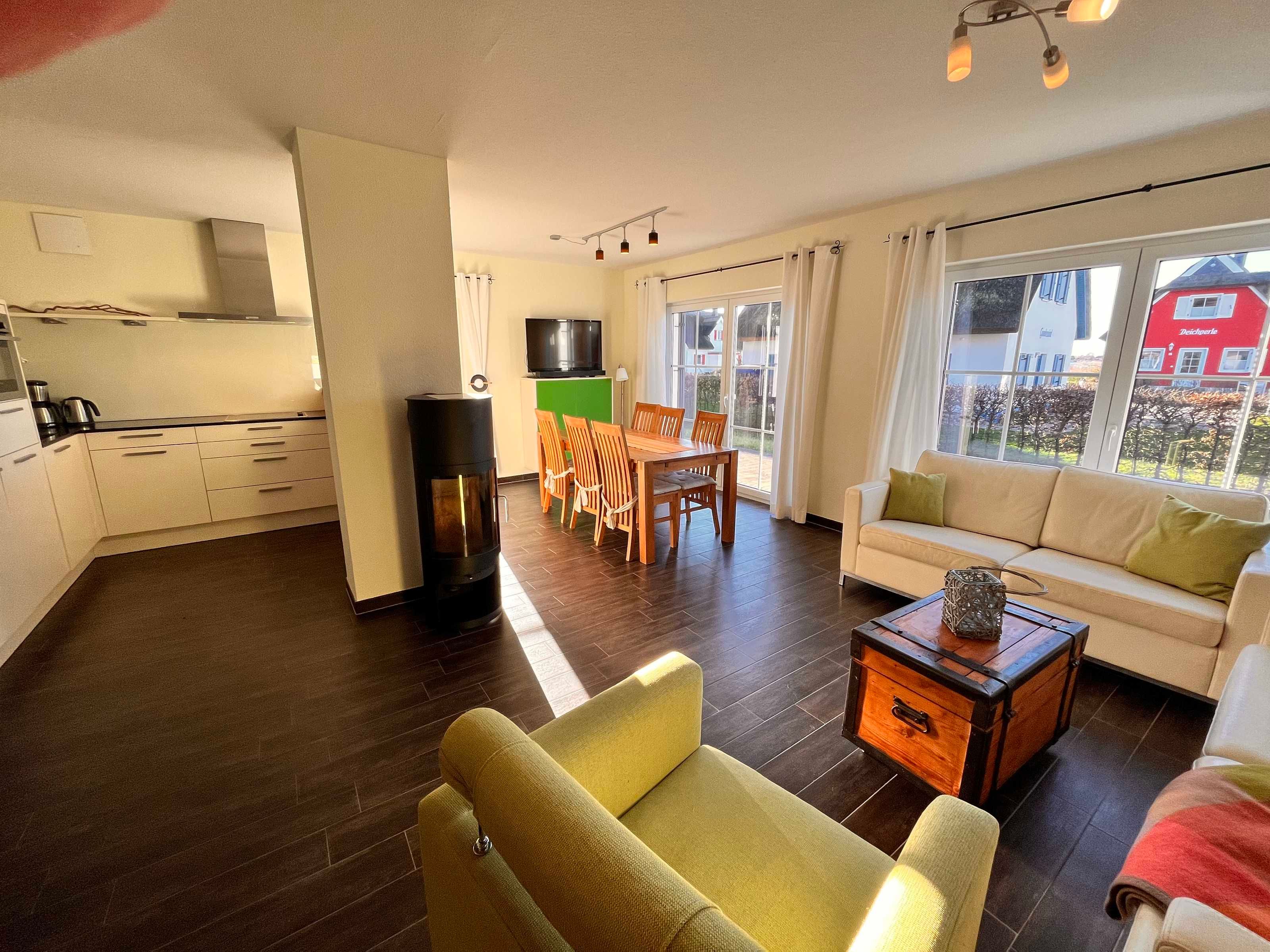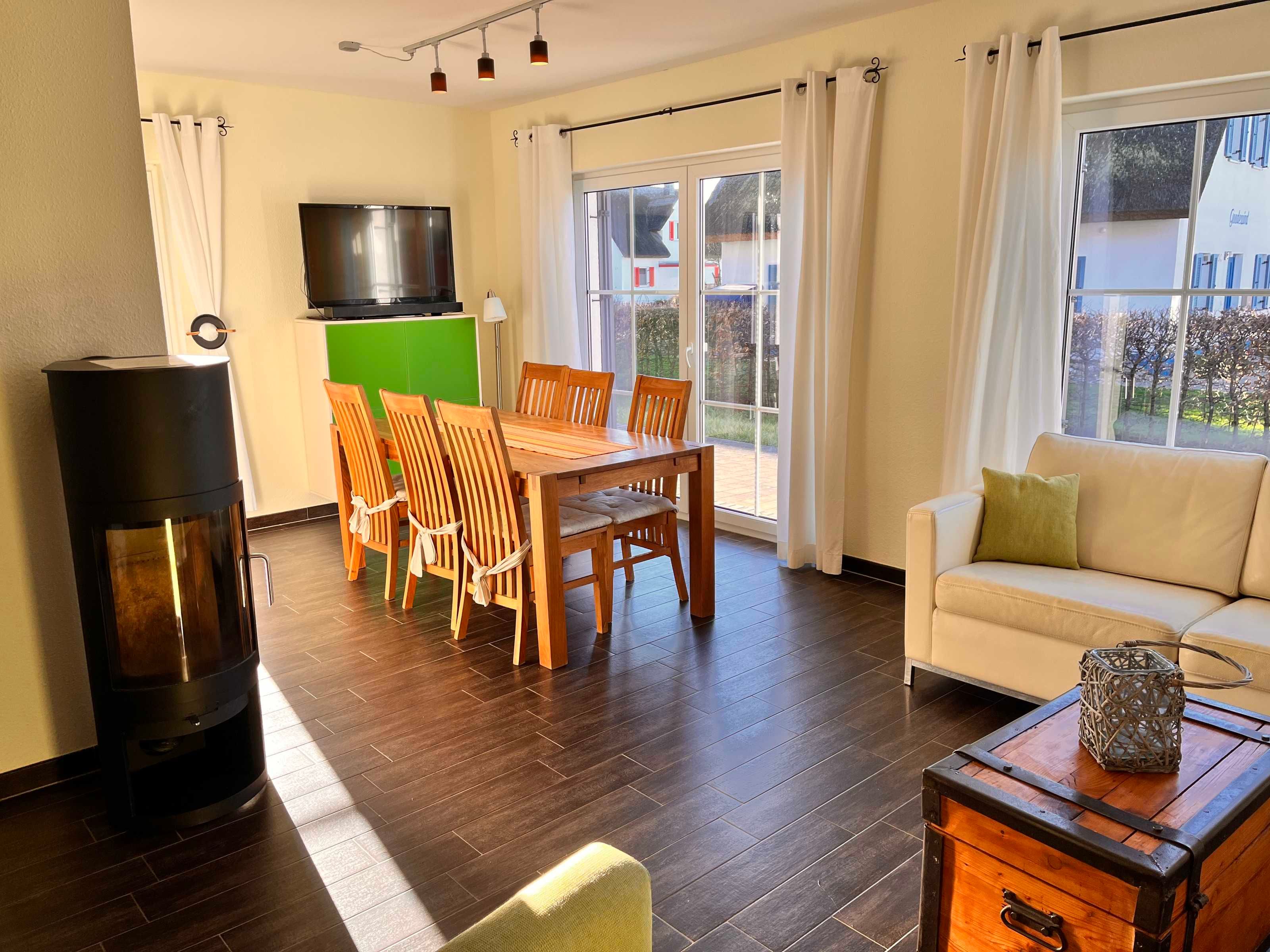 In der oberen Etage des ca. 110 m² großen Reetdachhauses mit Fußbodenheizung befinden sich zwei Schlafzimmer (1x Doppelbett und 1x 2 Einzelbetten + 1 Babybett) und ein Badezimmer mit Dusche und Badewanne. Im Erdgeschoss ist ein drittes Schlafzimmer mit Etagenbett zu finden. Der Wohn- und Essbereich mit Kamin und integrierter Küche ist gemütlich und lichtdurchflutet. Außerdem beherbergt das Erdgeschoss ein weiteres Bad mit Dusche und Waschmaschine. Die große Süd-West ausgerichtete Terrasse mit Strandkorb (500m² Grundstück) lädt zum Relaxen ein.