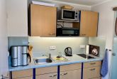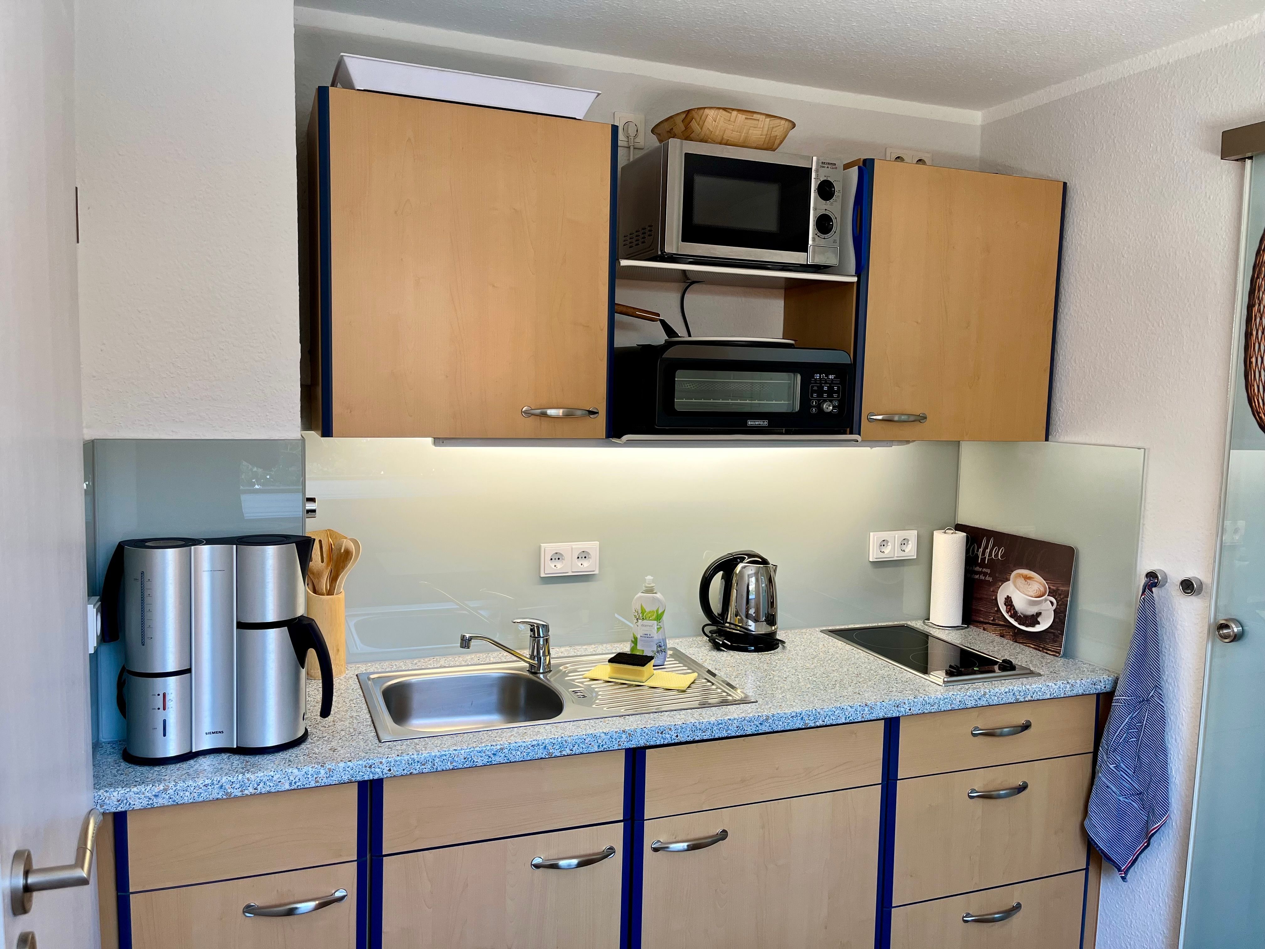Die Küche ist mit Kühlschrank, Mirkowelle, 2-Plattenkochfeld und diversen Kleinstutensilien ausgestattet.