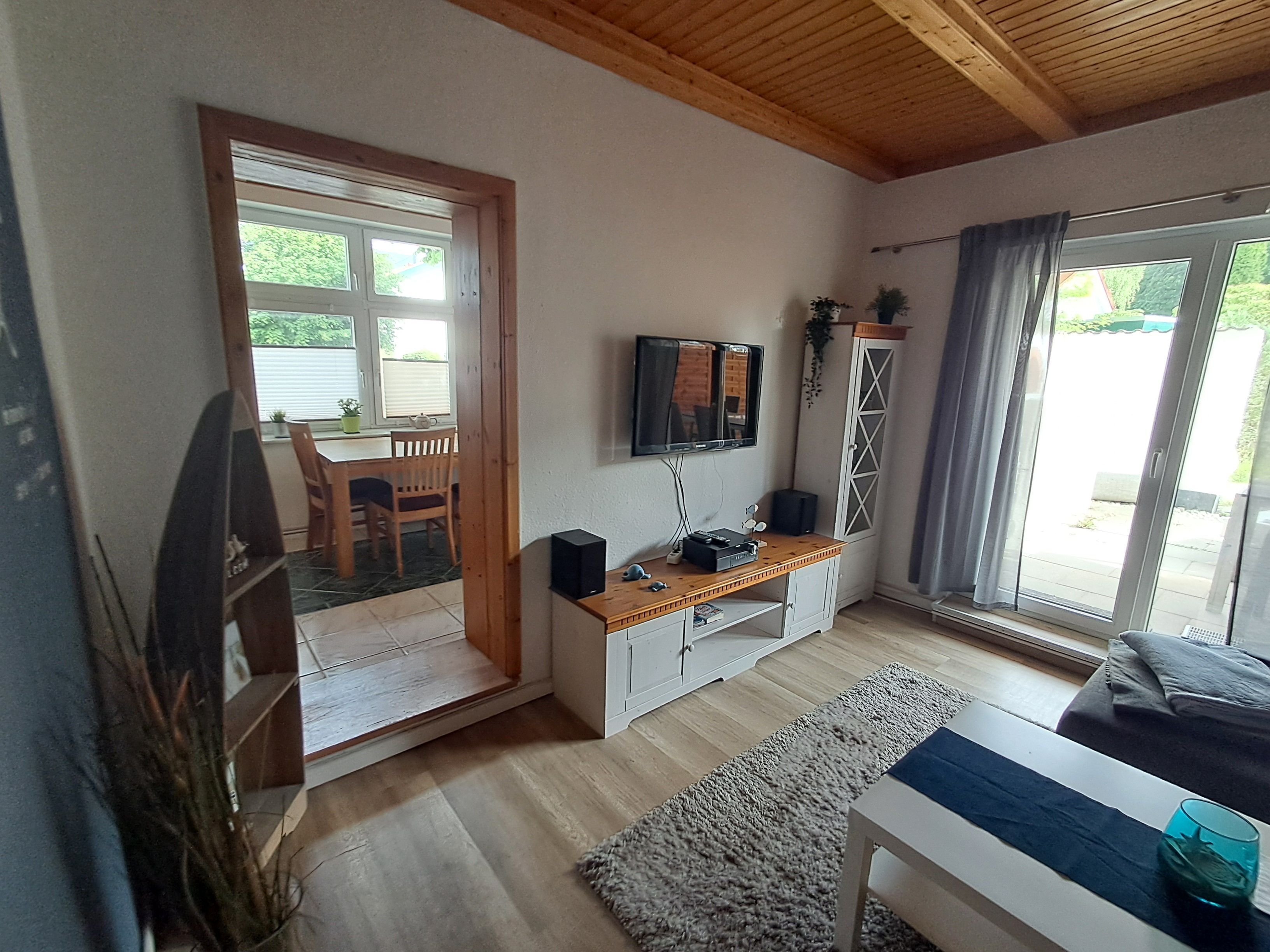 Die Ferienwohnung befindet sich im Erdgeschoss des Hauses. Die Wohnung ist 56 qm groß und verfügt über ein Schlafzimmer mit Doppelbett, einem Badezimmer mit Dusche, einer separat abgetrennten Küche, einem Wohnzimmer mit Schlafcouch sowie einer schönen, 14 qm großen Terrasse in südwestlicher Richtung.