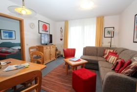 Ein Schlafzimmer mit Doppelbett (180 cm x 200 cm), Wohn-Schlafraum mit bequemer Doppelbettcouch (180 cm x 200 cm oder 120 cm x 200 cm für eine Person), separater Essplatz, voll ausgestatteter Küchenzeile mit Geschirrspüler und Mikrowelle, Dusche/WC und Waschmaschine.