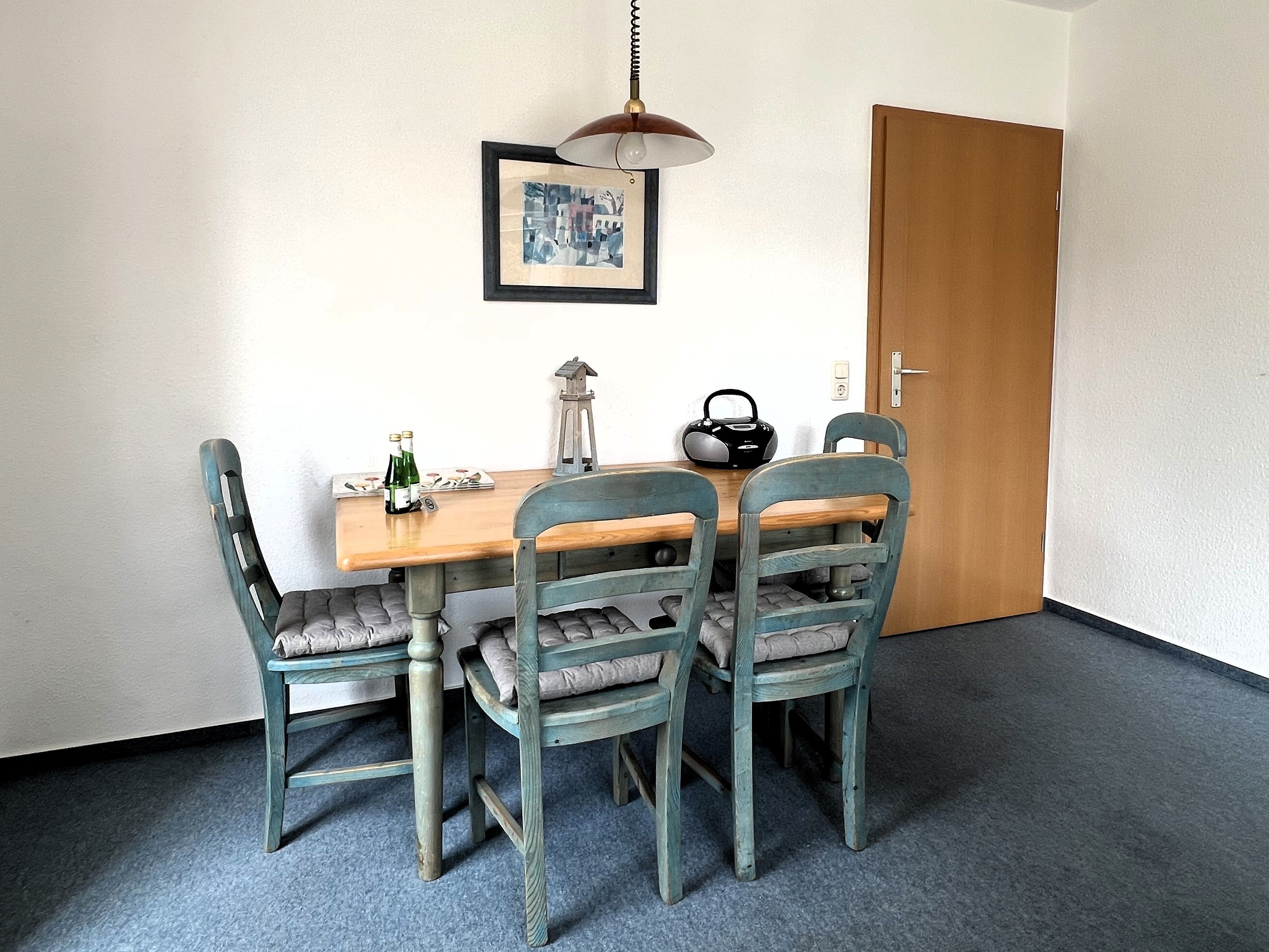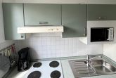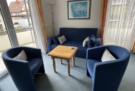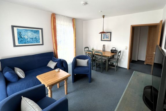 Sie wohnen in einem großzügigen 2-Zimmer-Appartement für bis zu 4 Personen auf 57 m² Wohnfläche im Erdgeschoss. Ein Schlafzimmer mit Doppelbett, Wohn-/Schlafraum mit bequemer Doppelbettcouch, separater Essplatz, voll ausgestatteter Küchenzeile mit Geschirrspüler und Mikrowelle, Dusche/WC, Balkon mit Elektrogrill, SAT-Farb-TV und Telefon. Außenstellplatz für PKW.