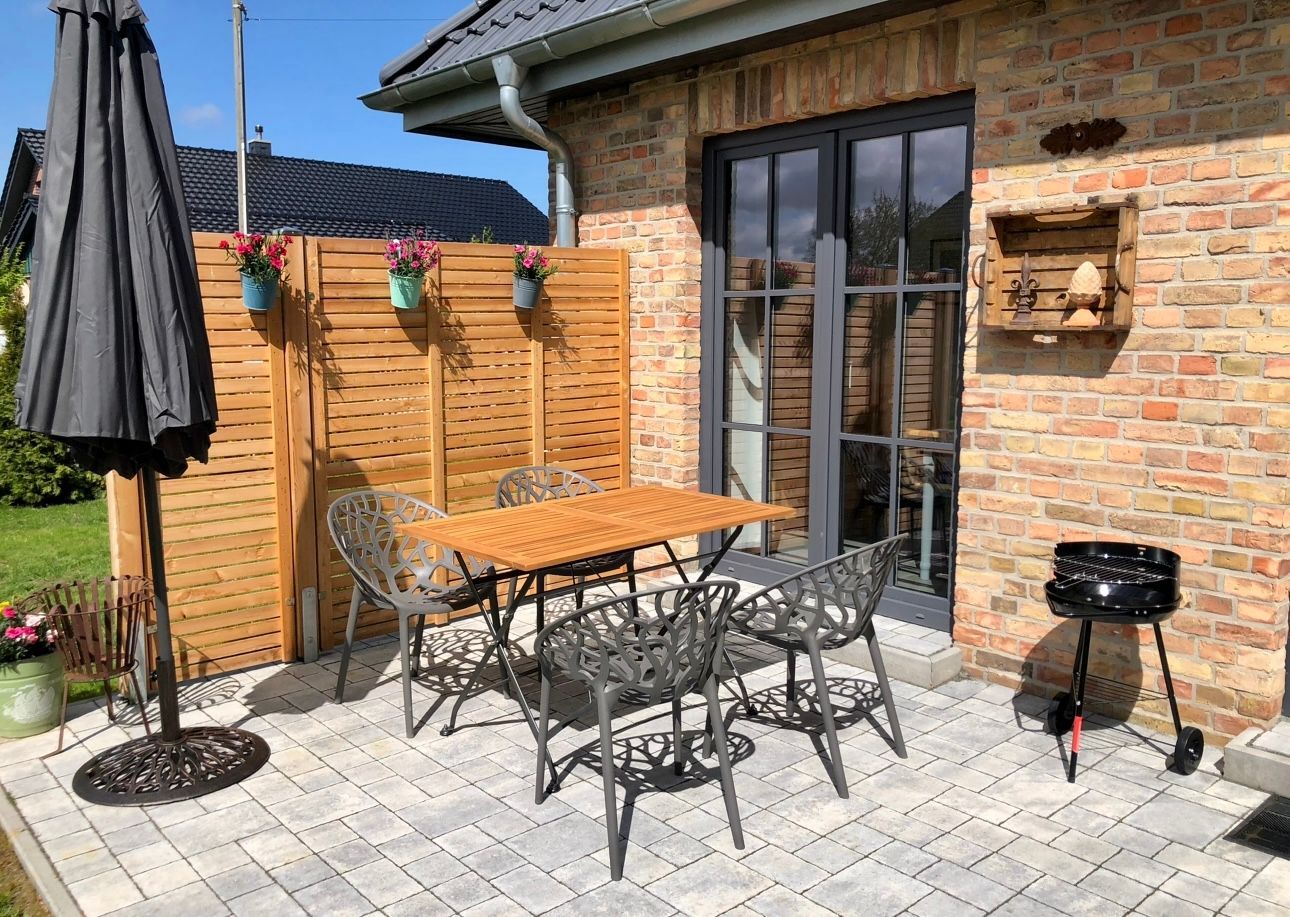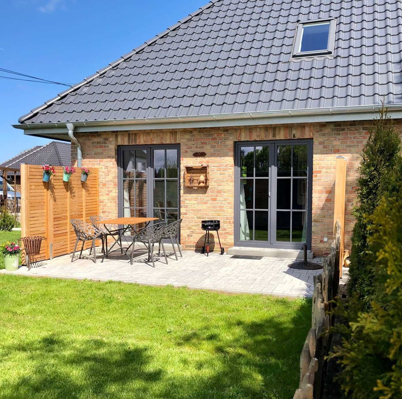 Der gemütliche Wohnbereich eröffnet einen herrlichen und freien Blick in die Natur und in den Garten. Von hier aus gelangen die Gäste direkt auf die ruhige Terrasse und ins Grüne. Hier stehen ein Esstisch, Grill und Liegestühle für die Gäste bereit. Der Gartenbereich ist mit einem 1m hohen Staketenholzzaun eingezäunt.
