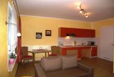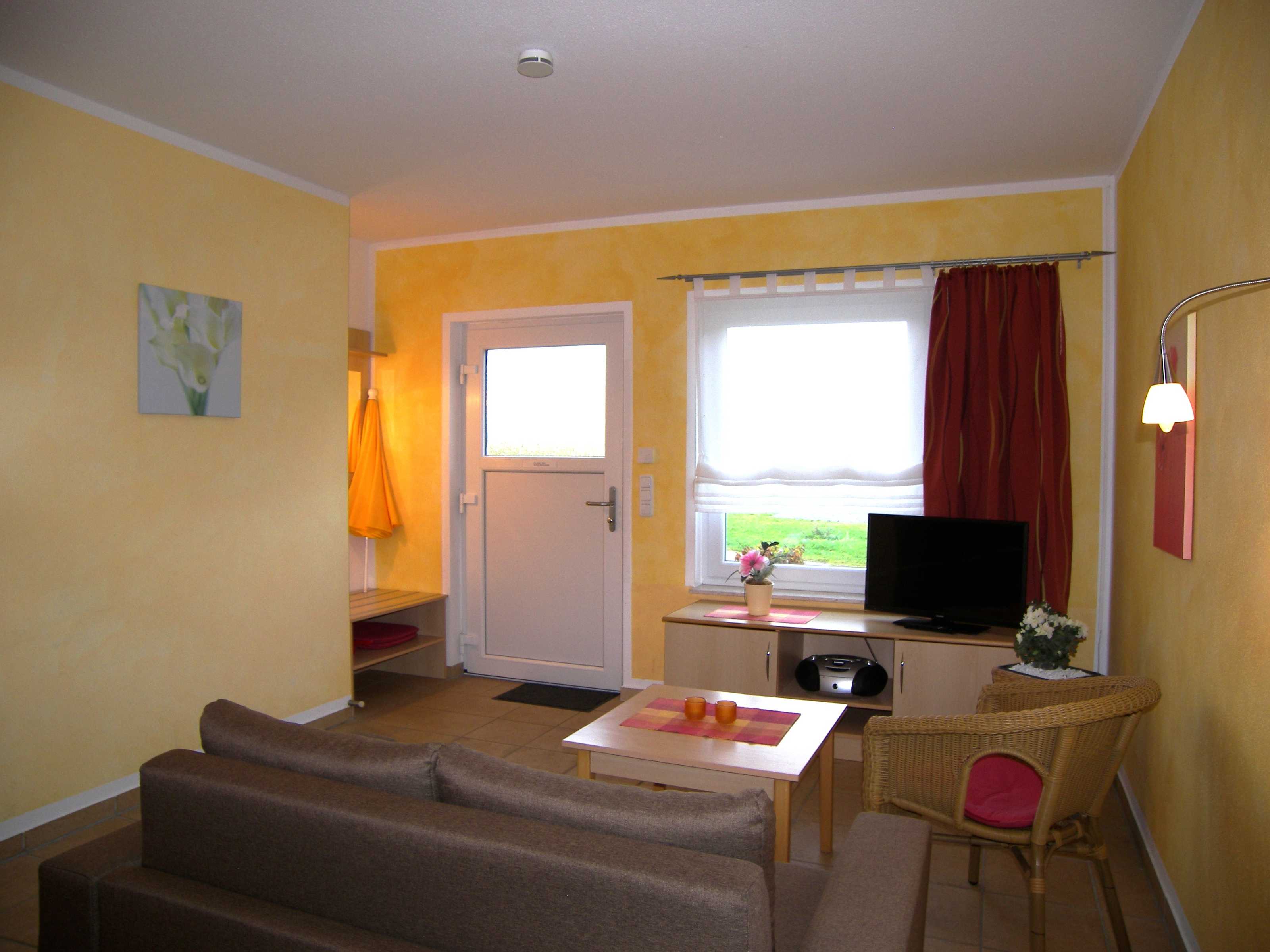 Die moderne, komfortable und barrierefreie Nichtraucher- Ferienwohnung ist für Rollstuhlfahrer geeignet. Sie liegt in parterre und ist stufenlos zu erreichen. Der kombinierte Wohnraum verfügt über eine Schlafcouch (Aufbettung für eine 3. Person), TV und Radio. Die integrierte Küchenzeile ist mit einer Mikrowelle, 4 Platten Cerankochfeld, Kühlschrank mit Gefriermöglichkeit, Geschirr, Wasserkocher, Toaster und Kaffeemaschine ausgestattet.