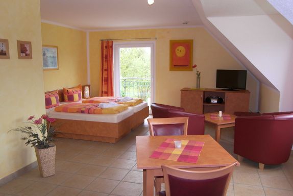 Im Haus gibt es: 6 komfortable, barrierefreie Ferienwohnungen mit Terrassen, 2 kleine Appartements in der oberen Etage mit Außensitzmöglichkeit und 1 großzügige Maisonett Wohnung in der oberen Etage