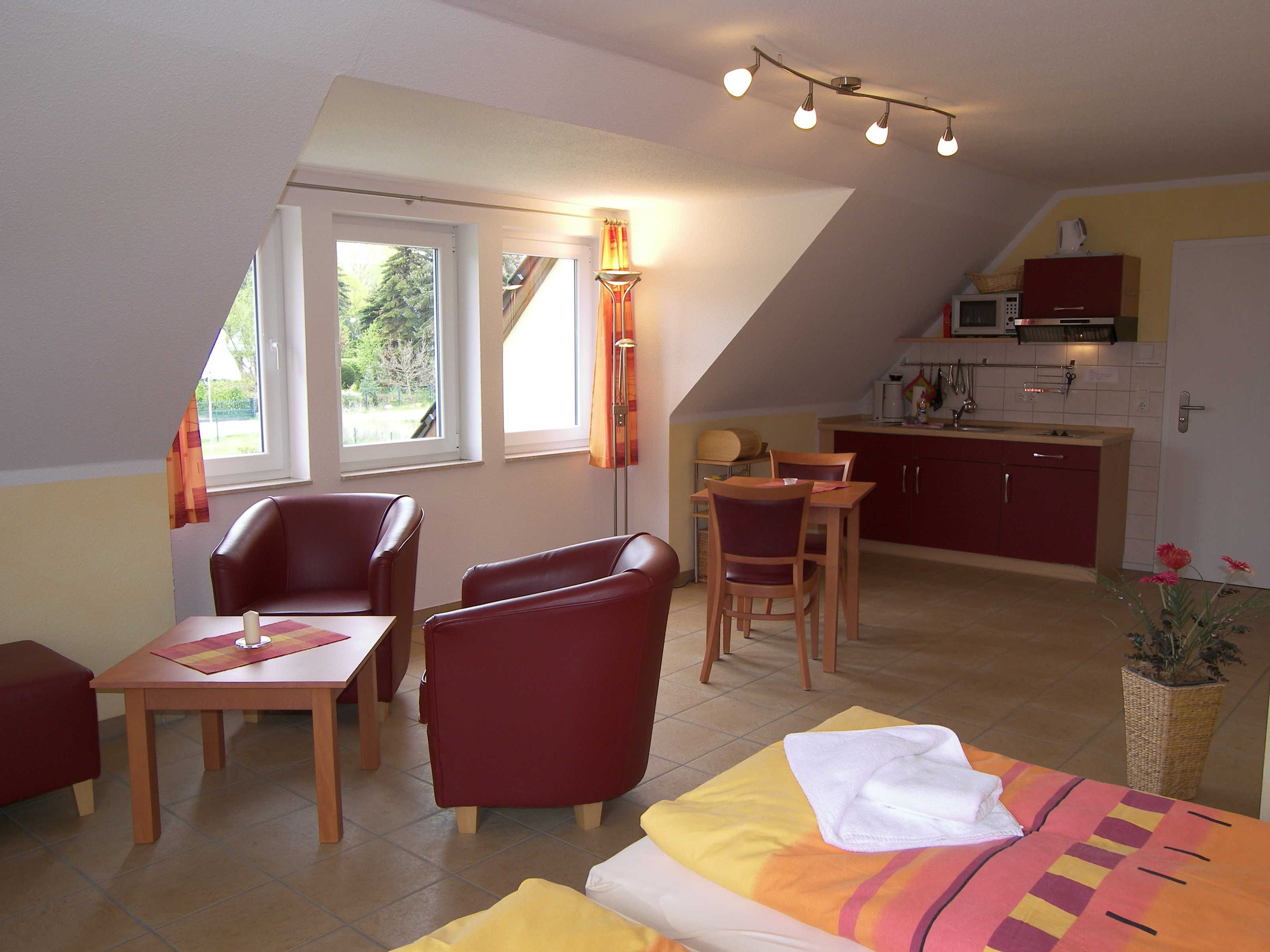 Der kombinierte Wohn- Schlafraum ist ausgestattet mit einem Doppelbett, sowie mit einer Sitzecke mit TV und Radio. Die integrierte Küchenzeile ist mit einem 2 Platten Kochfeld, Mikrowelle, Kühlschrank mit Gefriermöglichkeit, Geschirr, eine Kaffeemaschine, Wasserkocher und Toaster ausgestattet. Die Erstausstattung Bettwäsche und Handtücher sind inklusive. Eine Sitzgelegenheit für draußen befindet sich auf dem Grundstück des Hauses.