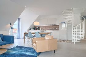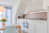 Ebenfalls in dieses offene Konzept ist die Küchenzeile integriert, die mit vielen Geräten wie Geschirrspüler, Mikrowelle, Thermoskaffeemaschine, Induktionsmilchaufschäumer und vielen Küchenutensilien ausgestattet ist. Kaffeeliebhaber werden sich an der Espressomaschine von Nespresso erfreuen.