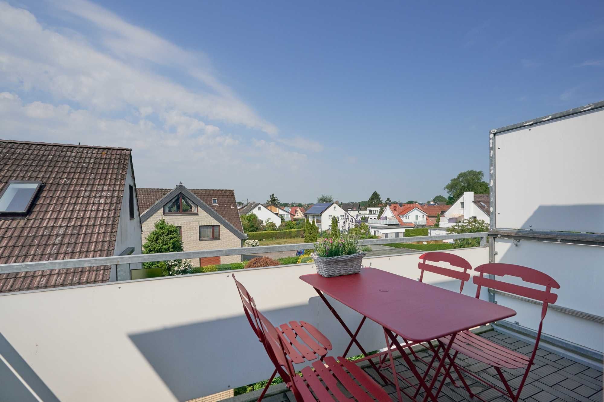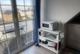 Vom Essbereich aus besteht der Zugang zum neu möblierten Balkon mit Sonnenschirm und in Südwestausrichtung. Ebenfalls auf dieser Ebene gelegen ist das komfortable Schlafzimmer und das hell geflieste Bad mit Wannen/Dusch-Kombination und Waschmaschine (Münzautomat).