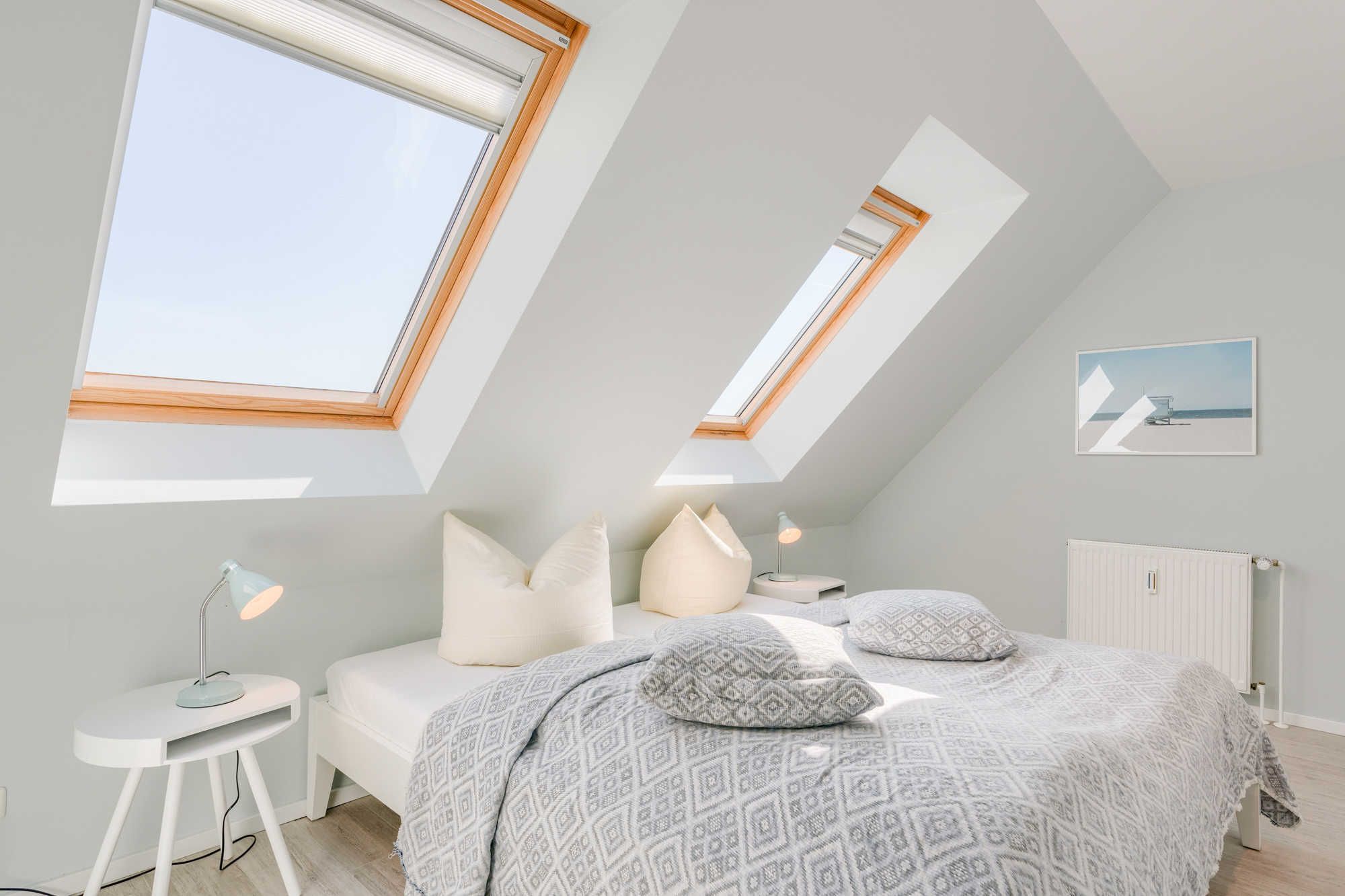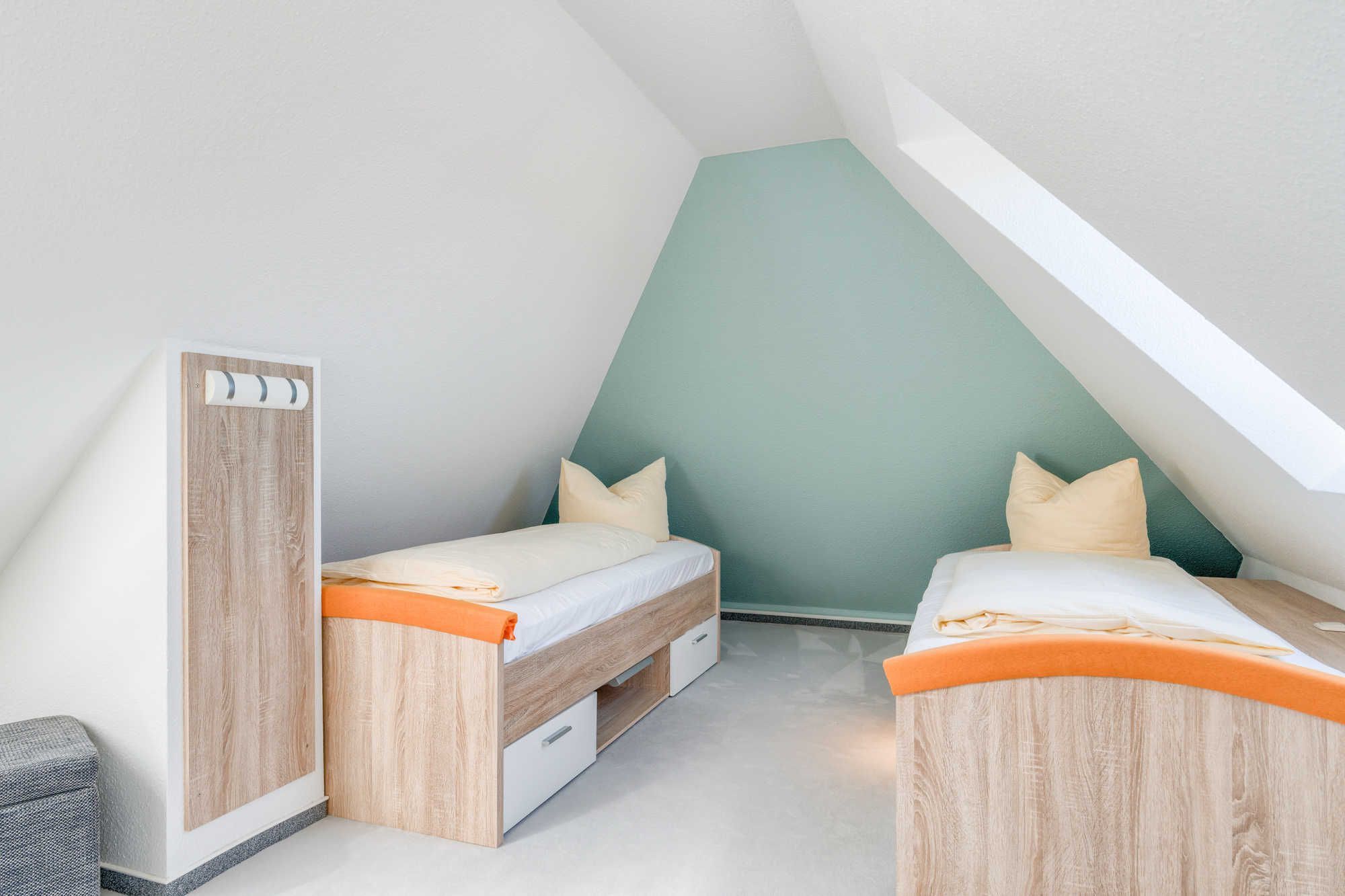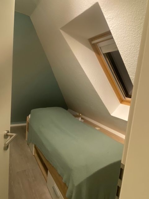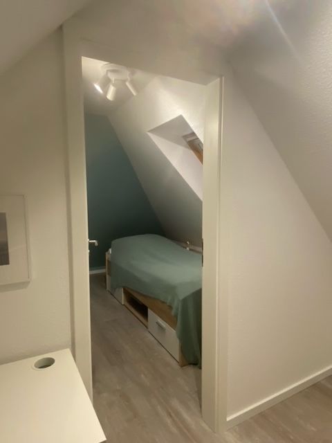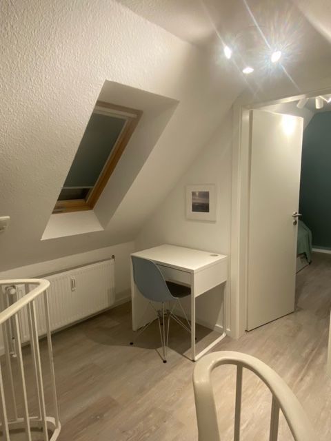 Eine raumsparende Wendeltreppe führt auf die zweite Ebene, wo sich ein weiterer separater Schlafraum mit 2 Einzelbetten (je 0,90 m x 2,00 m) auf der Galerie befindet. Ein kleiner Arbeitsplatz mit einem Schreibtisch ist im offenen Teil der Galerie neu geschaffen worden. Es gibt ausreichend Stauraum für alles Mitgebrachte. Die beiden Dachfenster verfügen auch über Plisseerollos. Es ist einfach nur kuschelig hier!