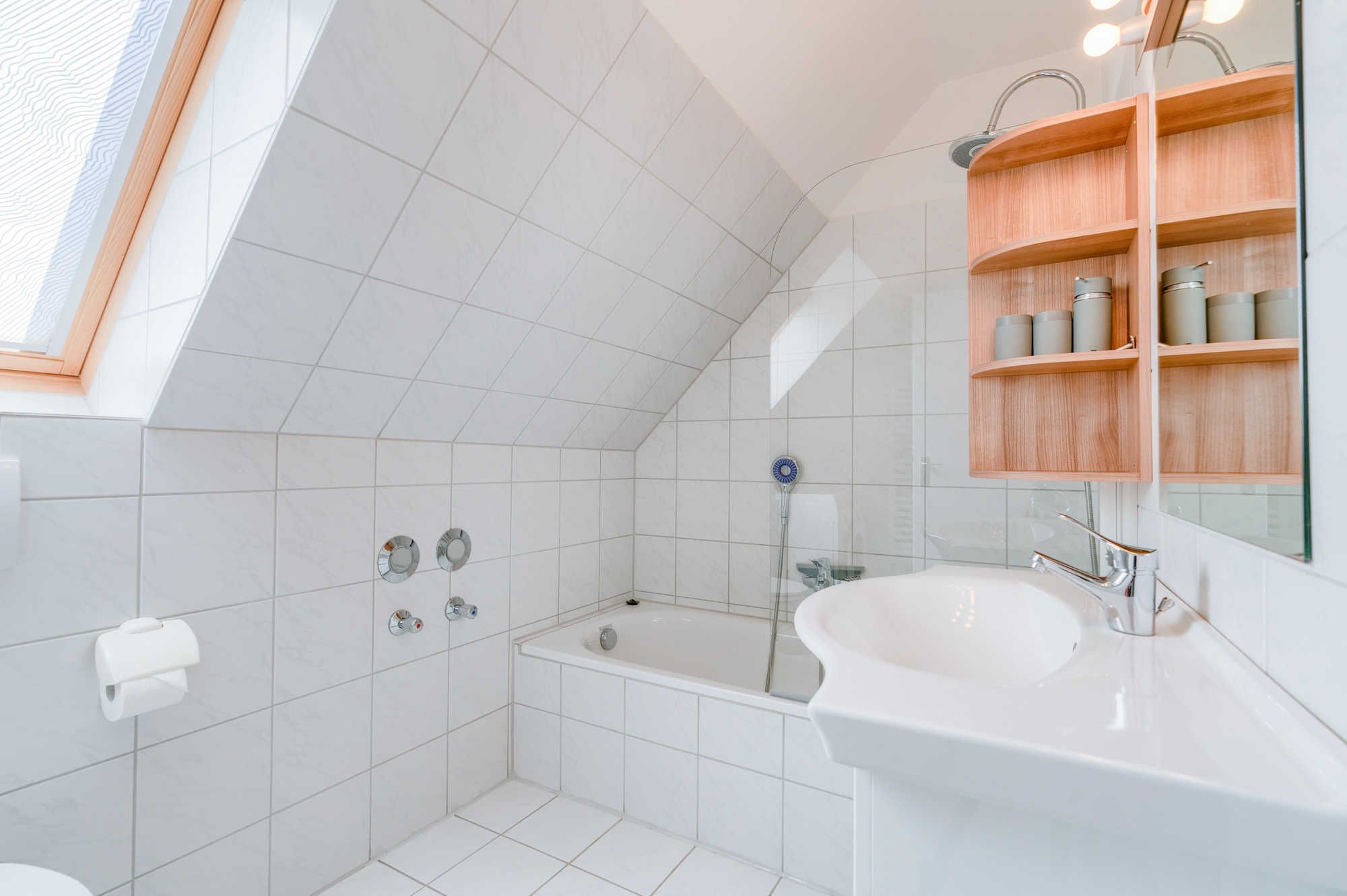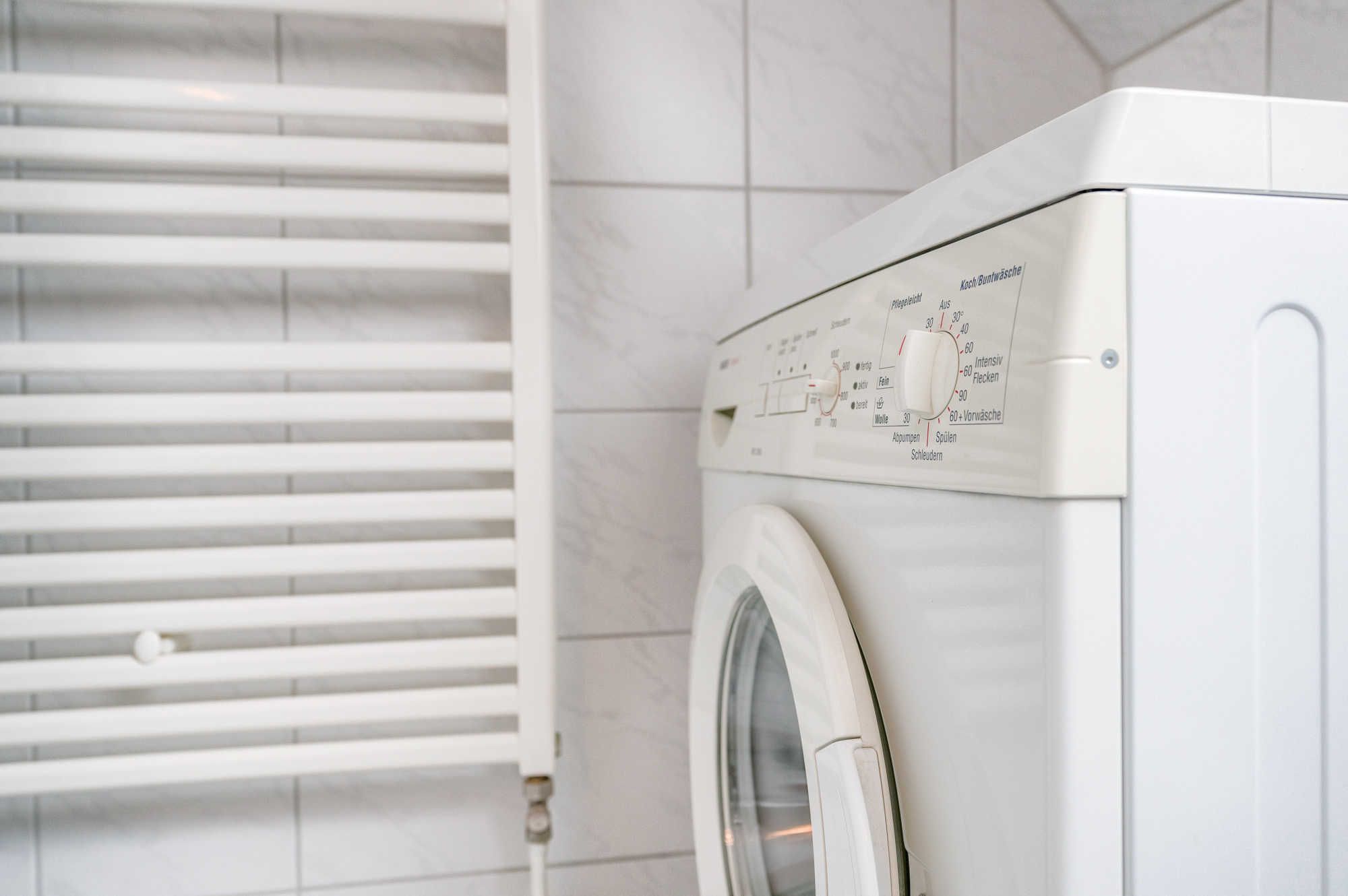Das hell geflieste Bad mit Wannen/Dusch-Kombination ist eine echte Wohlfühloase, zusätzlich ausgestattet mit Handtuchheizkörper, großem beleuchteten Spiegel und Waschmaschine (Münzautomat).