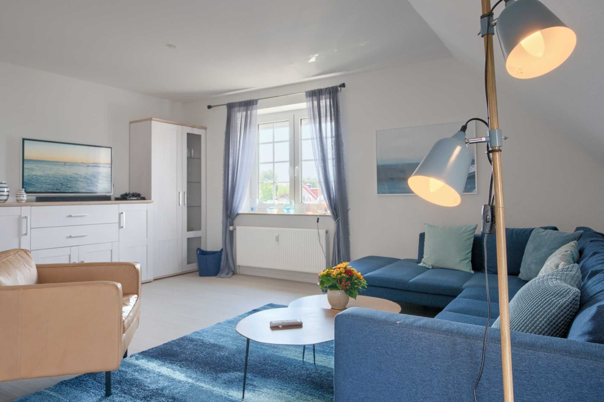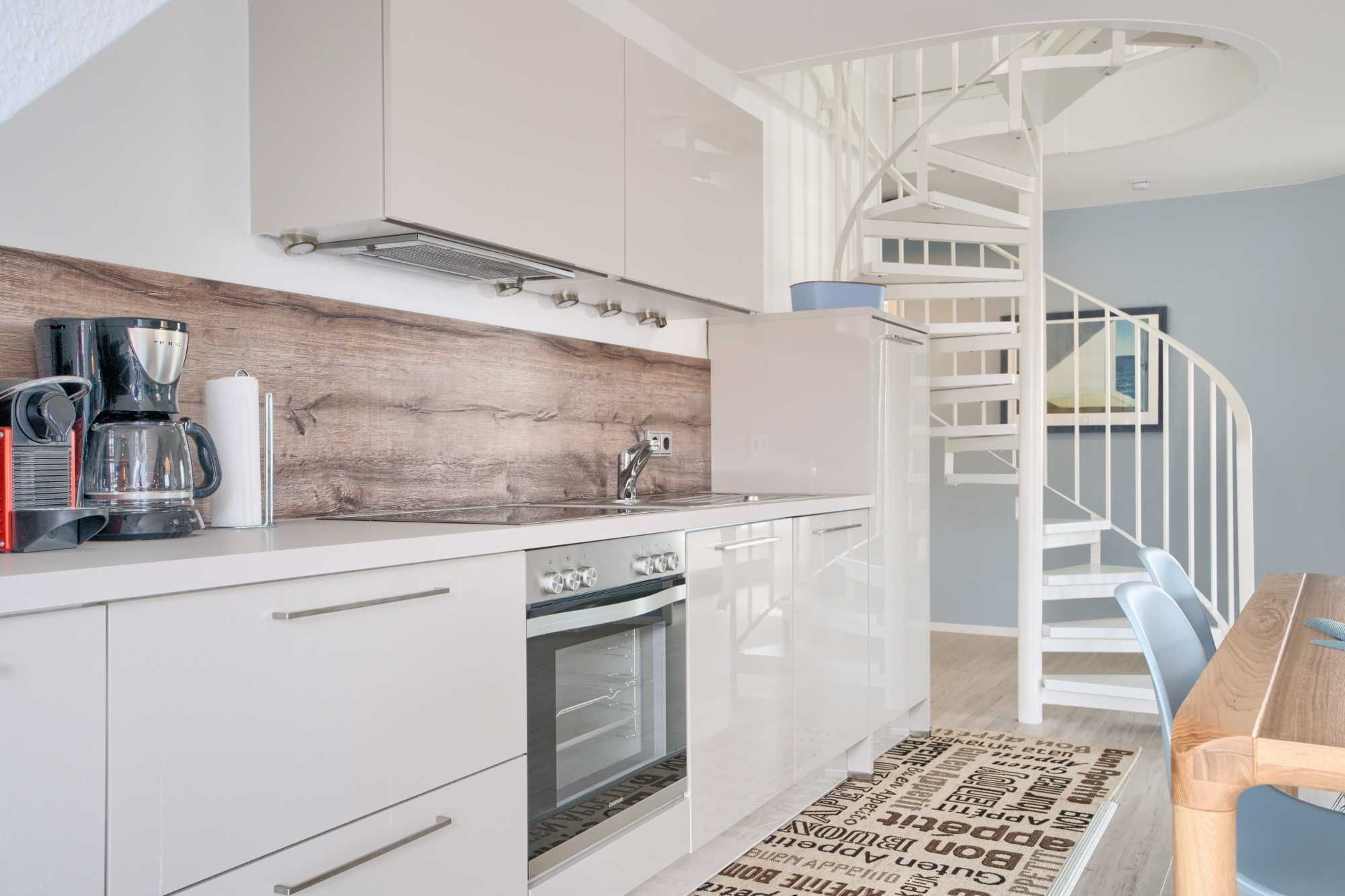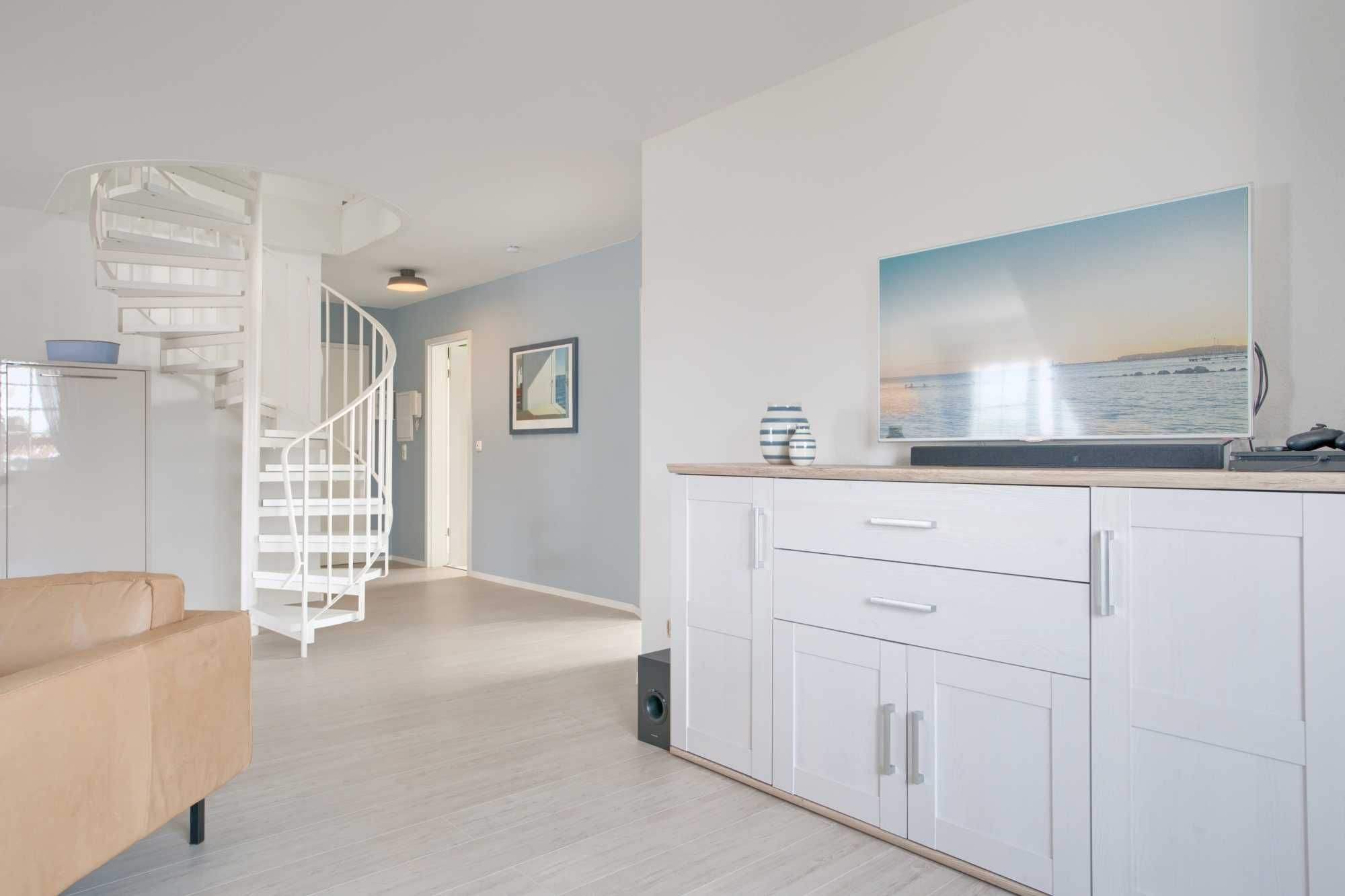 Das hell und geschmackvoll eingerichtete Appartement erstreckt sich über 2 Ebenen und ist erst Anfang 2023 zum größten Teil renoviert worden. Auf der größeren unteren Ebene befindet sich der offene, moderne Wohnbereich mit gemütlicher Couch, internetfähigem Flachbildfernseher und einer Spielekonsole Playstation PS4 zur Unterhaltung, sowie auch der Essplatz für bis zu 6 Personen.