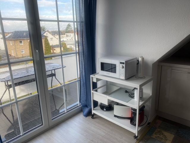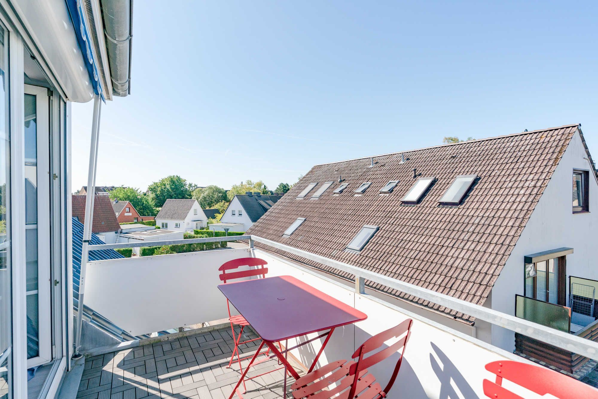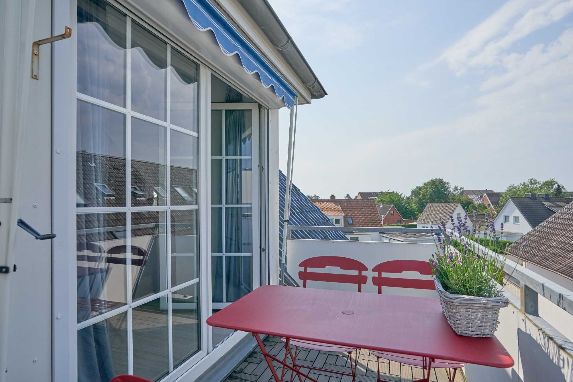 Vom Essbereich aus besteht der Zugang zum neu möblierten Balkon mit Sonnenschirm und in Südwestausrichtung. Die Balkonmöbel stehen den Gästen vom Frühjahr bis in den Herbst für genussvolle Urlaubszeit zur Verfügung. Schnuppern Sie die frische Ostseebrise auch? Außenrollos an der Balkontür und am Wohnzimmerfenster sind als Abdunkelung und Sonnenschutz vorhanden.