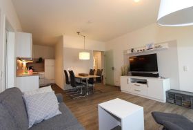 Der Wohnbereich ist mit einer gemütlichen ausklappbaren Schlafcouch (zwei Schlafplätze) ausgestattet. Der Essplatz im Vorbereich der hochwertigen Küche ist optisch vom Wohnbereich getrennt.