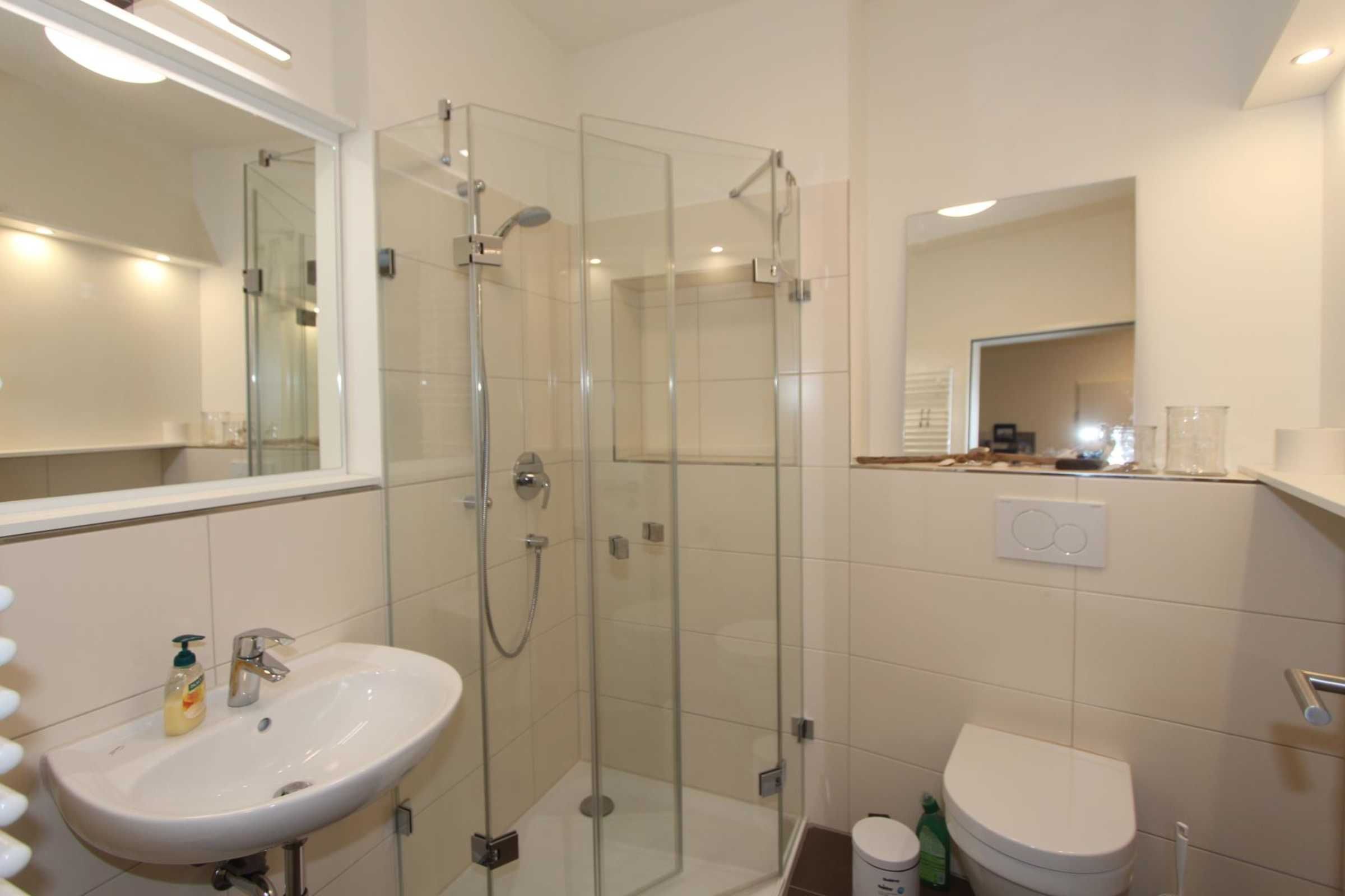 Das Duschbad mit WC verfügt über eine Klarglasduschkabine sowie eine beleuchtete, großzügige Spiegelanlage über dem Waschbecken. Ein im Duschbad eingebautes Radiogerät rundet den Komfort ab.