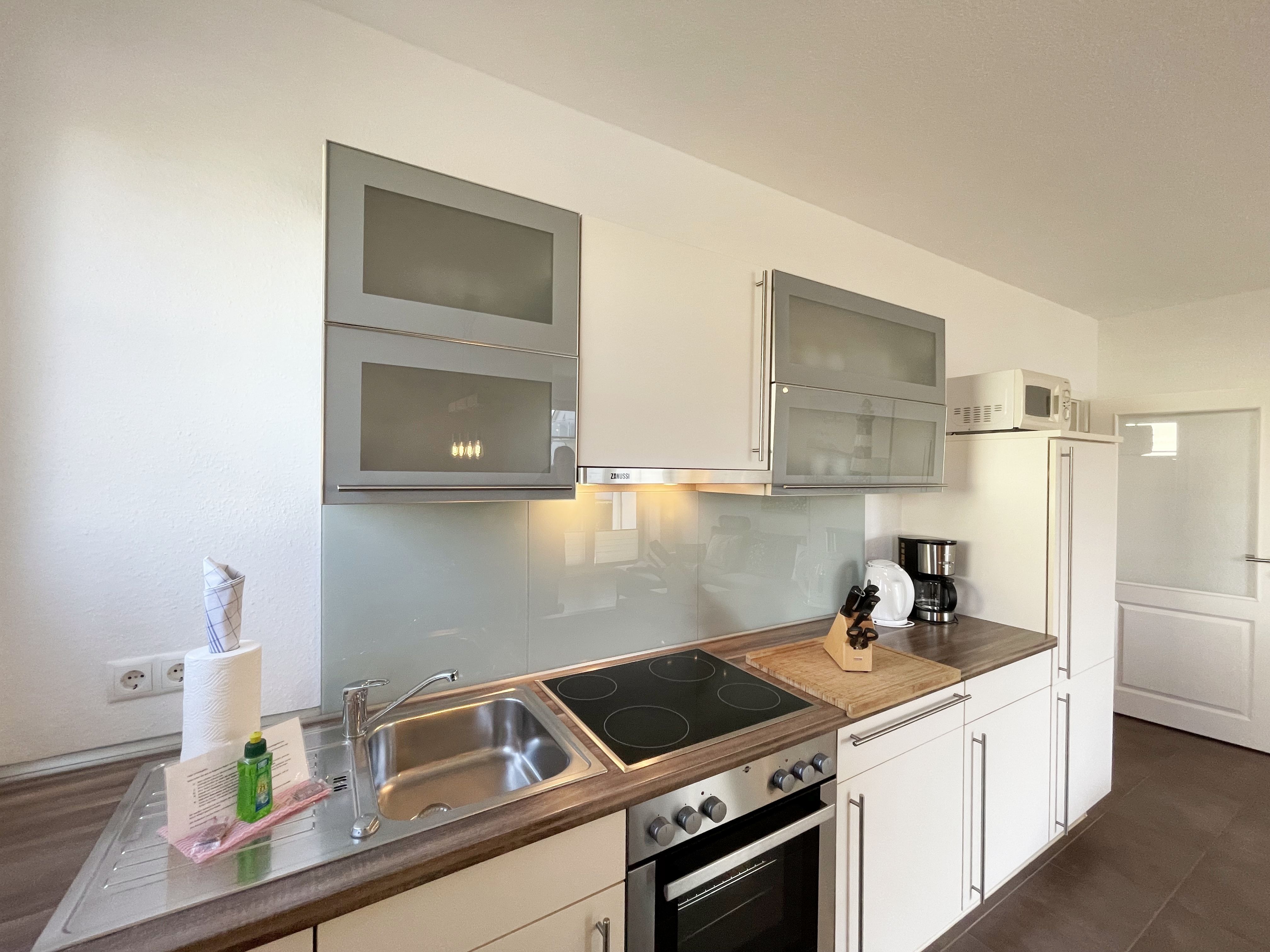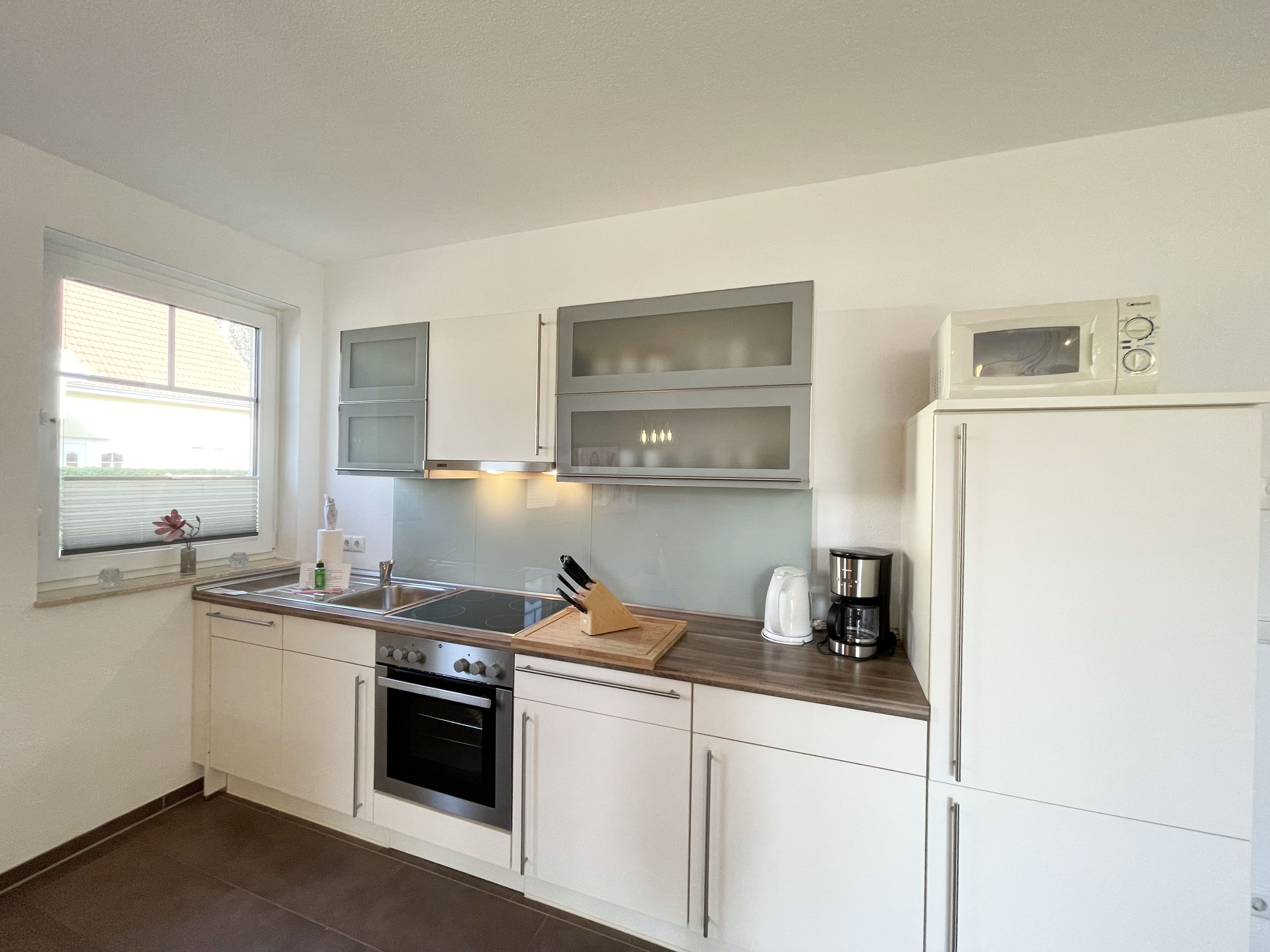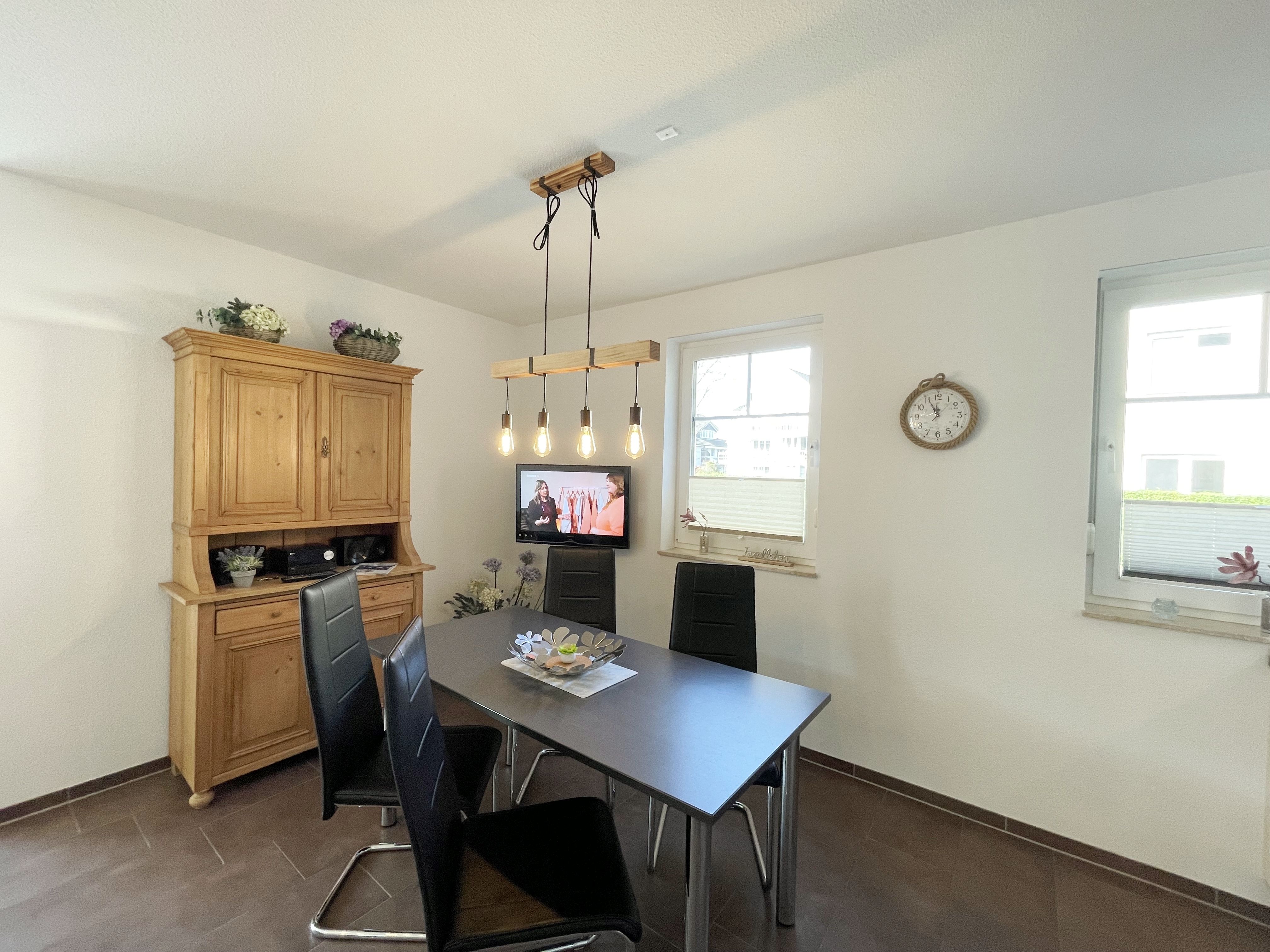 Die Nichtraucherferienwohnung Nr. 05 LEON befindet sich im Erdgeschoss des Hauses und verfügt über eine Wohnfläche von ca. 54 qm. Die Ferienwohnung ist für 2 bis max. 4 Personen ausgelegt. Im kombinierten Wohn- und Essbereich befindet sich eine integrierte Küchenzeile. Die komplett ausgestattete Küchenzeile verfügt über ein Cerankochfeld, Backofen, Dunstabzugshaube, Kühlschrank mit Gefrierfach, Spülmaschine, Kaffeemaschine, Mikrowelle, Wasserkocher, Toaster und weitere diverse Küchenutensilien. Der Esstisch mit Bestuhlung ist für 4 Personen geeignet. Das im Wohnbereich vorhandene Schlafcouch verfügt über eine Ausziehfunktion und kann von 2 Personen gut genutzt werden (1,48m x 1,95m). Ein kleiner Couchtisch, eine Mini-Stereoanlage mit DAB-Radio, USB-Anschluss, Bluetooth und ein Flachbildfernseher runden den Wohnbereich ab. Von hier aus gelangen Sie auf die nach Süd/West ausgerichtete Terrasse mit Tisch und 4 Stühlen. Die Terrassenfenster haben Außenjalousien. Auch im Urlaub brauchen Sie auf einen Internetanschluss (WLAN) nicht verzichten. Dieser ist für Sie inklusive. Das im Schlafbereich vorhandene Doppelbett hat eine Größe von 1,80 m x 2,00 m mit H2/H3 Matratzen sowie verstellbare Lattenroste. Außerdem verfügt das Zimmer über Nachttischkonsolen und einen Kleiderschrank, zur Unterbringung der Kleidung. Das komfortable Bad rundet mit einem WC, Waschtisch, Fön, Dusche und Handtuchwärmeheizkörper die Wohnung komplett ab. In allen Räumen sorgt eine Fußbodenheizung für angenehme Wärme. Die bestuhlte Terrasse erreichen Sie vom Wohnbereich, welche zusätzlich mit einem Sonnenschirm ausgestattet ist. Insektenschutzgitter sind vorhanden. Ein eigener PKW-Stellplatz (Nr.05) befindet sich auf dem Grundstück. Mitgebrachte oder gemietete Fahrräder können im wohnungseigenen Abstellraum untergestellt werden. Haustiere sind nicht erlaubt. Die Erstausstattung eines Wäschepaketes (komplette Bettwäsche, 1 Duschhandtuch, 2 kleine Handtücher) können Sie bis 14 Tage vor Anreise gegen einen Aufpreis dazu buchen oder durch eigene ergänzen. Ab 2 gebuchten Paketen erhalten Sie einmalig 1 Geschirrhandtuch und 1 Duschvorleger dazu.