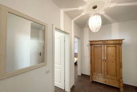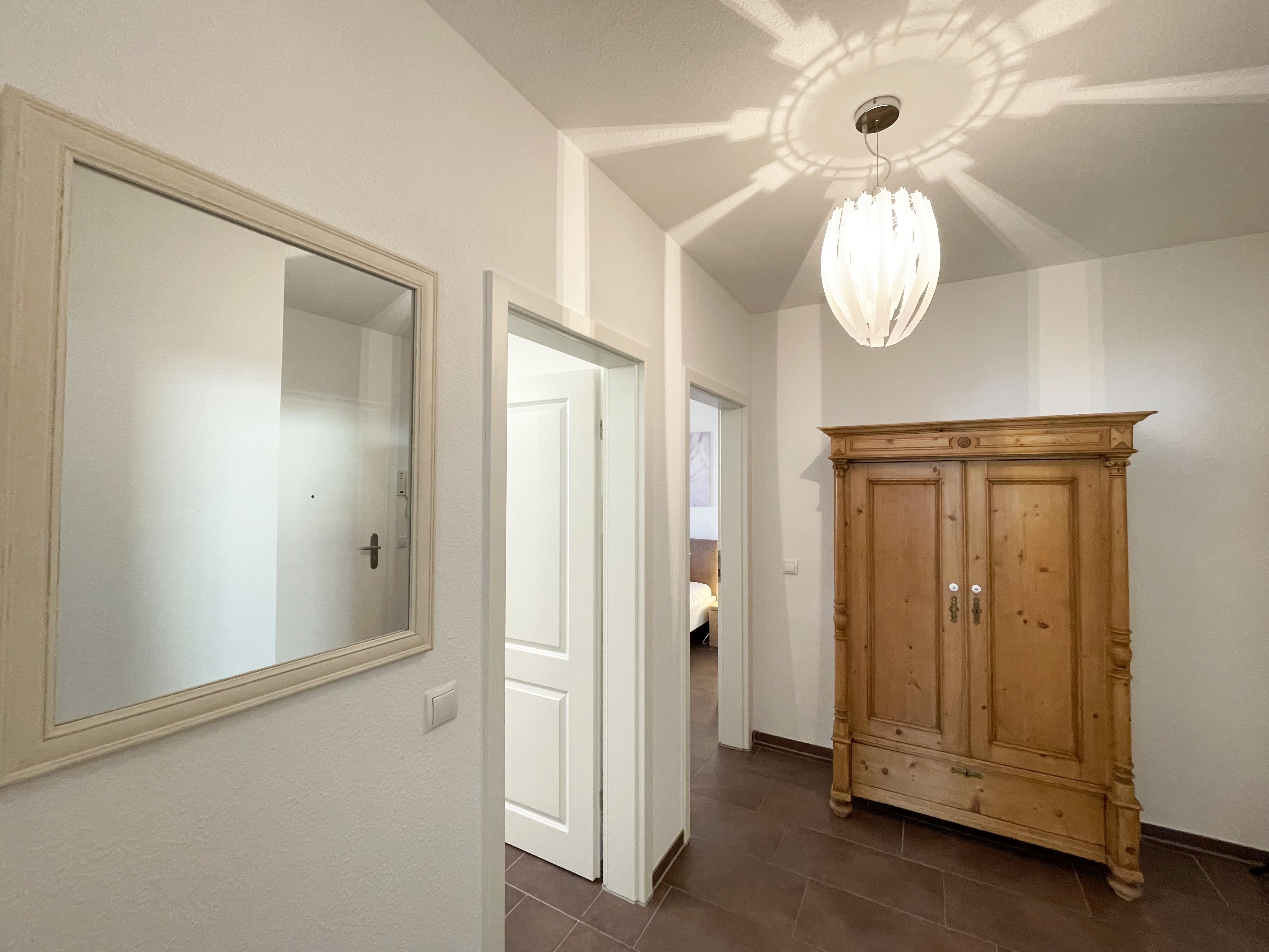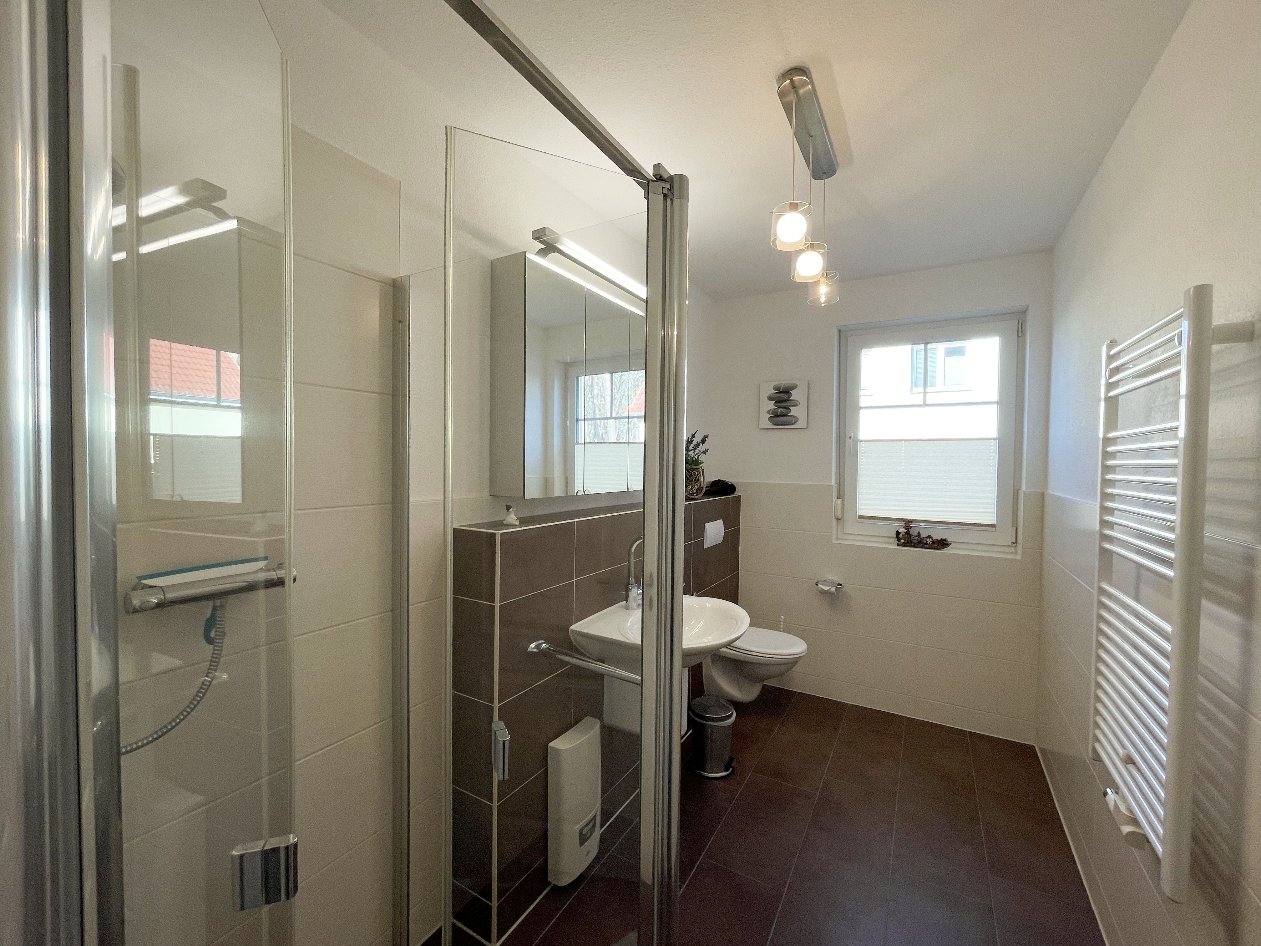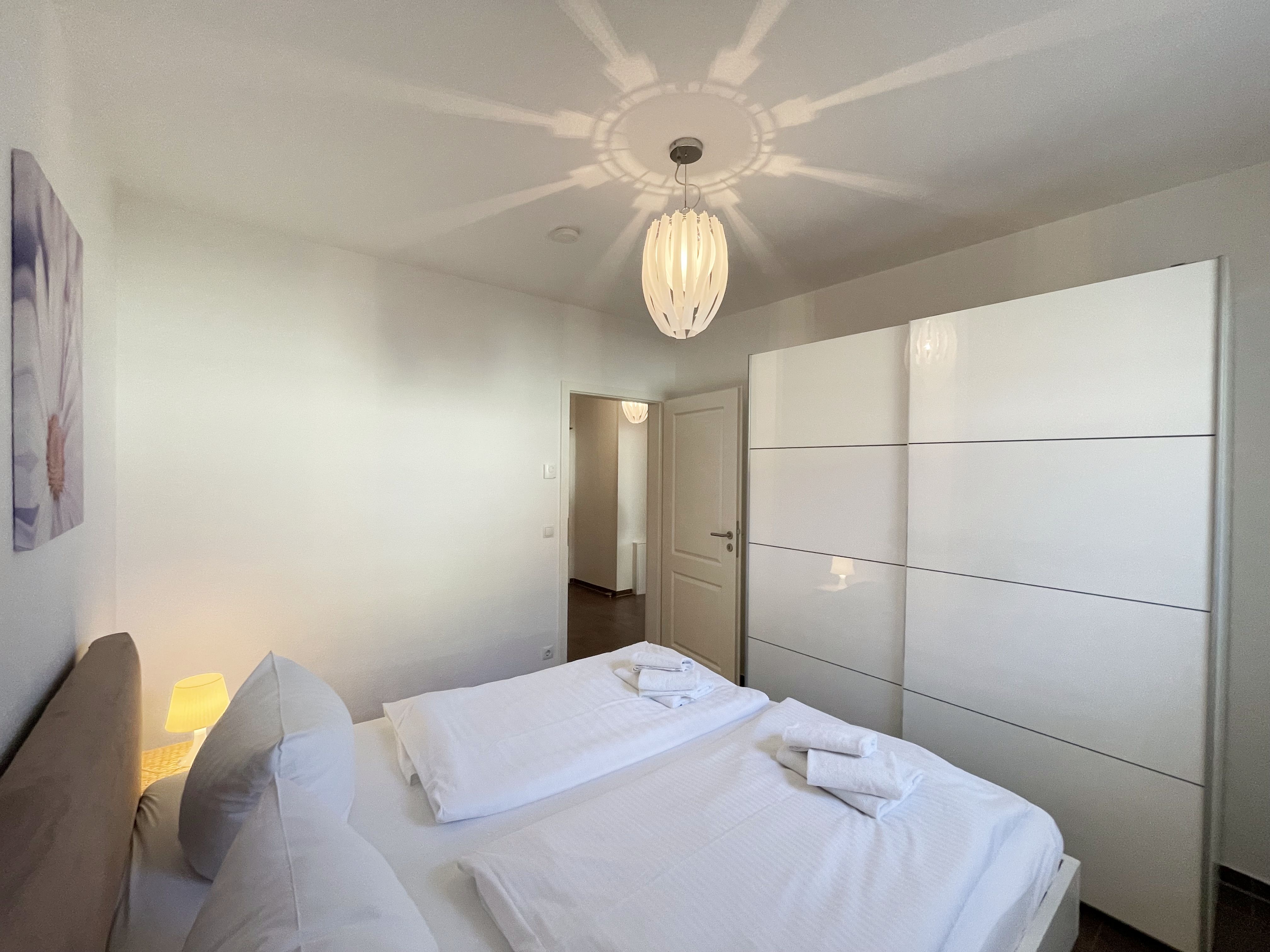 Die Nichtraucherferienwohnung Nr. 05 LEON befindet sich im Erdgeschoss des Hauses und verfügt über eine Wohnfläche von ca. 54 qm. Die Ferienwohnung ist für 2 bis max. 4 Personen ausgelegt. Im kombinierten Wohn- und Essbereich befindet sich eine integrierte Küchenzeile. Die komplett ausgestattete Küchenzeile verfügt über ein Cerankochfeld, Backofen, Dunstabzugshaube, Kühlschrank mit Gefrierfach, Spülmaschine, Kaffeemaschine, Mikrowelle, Wasserkocher, Toaster und weitere diverse Küchenutensilien. Der Esstisch mit Bestuhlung ist für 4 Personen geeignet. Das im Wohnbereich vorhandene Schlafcouch verfügt über eine Ausziehfunktion und kann von 2 Personen gut genutzt werden (1,48m x 1,95m). Ein kleiner Couchtisch, eine Mini-Stereoanlage mit DAB-Radio, USB-Anschluss, Bluetooth und ein Flachbildfernseher runden den Wohnbereich ab. Von hier aus gelangen Sie auf die nach Süd/West ausgerichtete Terrasse mit Tisch und 4 Stühlen. Die Terrassenfenster haben Außenjalousien. Auch im Urlaub brauchen Sie auf einen Internetanschluss (WLAN) nicht verzichten. Dieser ist für Sie inklusive. Das im Schlafbereich vorhandene Doppelbett hat eine Größe von 1,80 m x 2,00 m mit H2/H3 Matratzen sowie verstellbare Lattenroste. Außerdem verfügt das Zimmer über Nachttischkonsolen und einen Kleiderschrank, zur Unterbringung der Kleidung. Das komfortable Bad rundet mit einem WC, Waschtisch, Fön, Dusche und Handtuchwärmeheizkörper die Wohnung komplett ab. In allen Räumen sorgt eine Fußbodenheizung für angenehme Wärme. Die bestuhlte Terrasse erreichen Sie vom Wohnbereich, welche zusätzlich mit einem Sonnenschirm ausgestattet ist. Insektenschutzgitter sind vorhanden. Ein eigener PKW-Stellplatz (Nr.05) befindet sich auf dem Grundstück. Mitgebrachte oder gemietete Fahrräder können im wohnungseigenen Abstellraum untergestellt werden. Haustiere sind nicht erlaubt. Die Erstausstattung eines Wäschepaketes (komplette Bettwäsche, 1 Duschhandtuch, 2 kleine Handtücher) können Sie bis 14 Tage vor Anreise gegen einen Aufpreis dazu buchen oder durch eigene ergänzen. Ab 2 gebuchten Paketen erhalten Sie einmalig 1 Geschirrhandtuch und 1 Duschvorleger dazu.