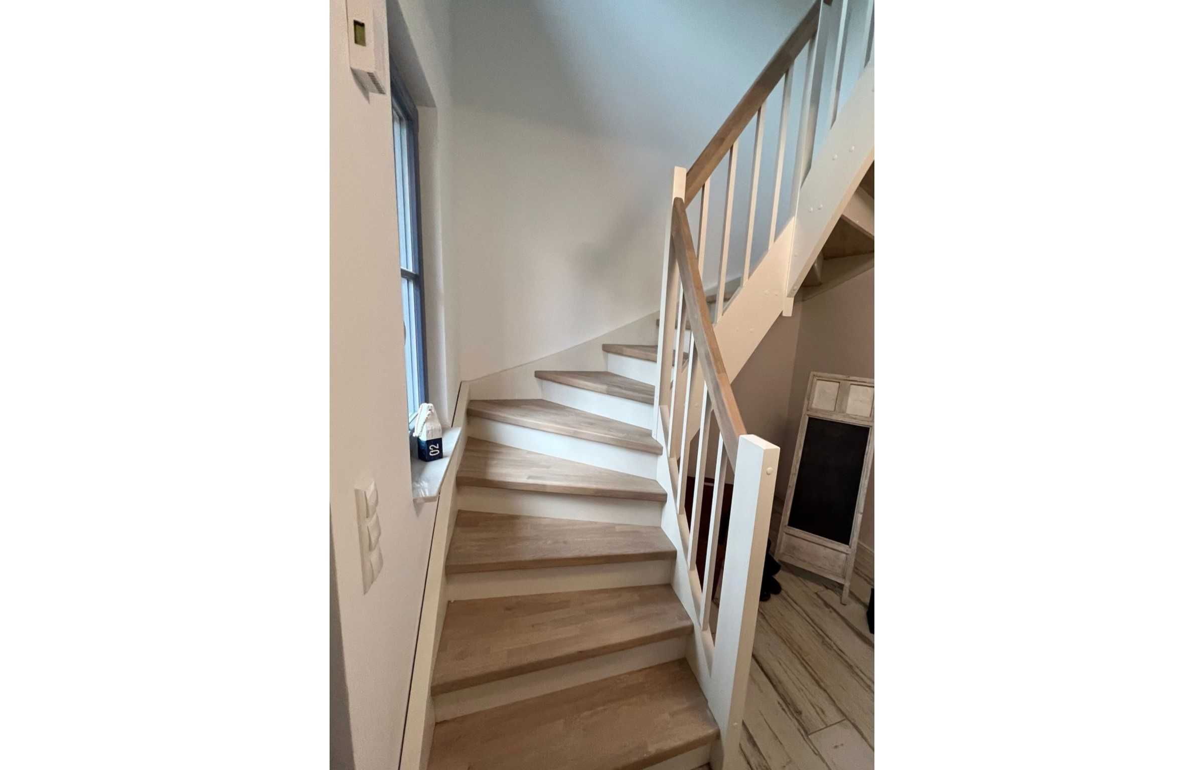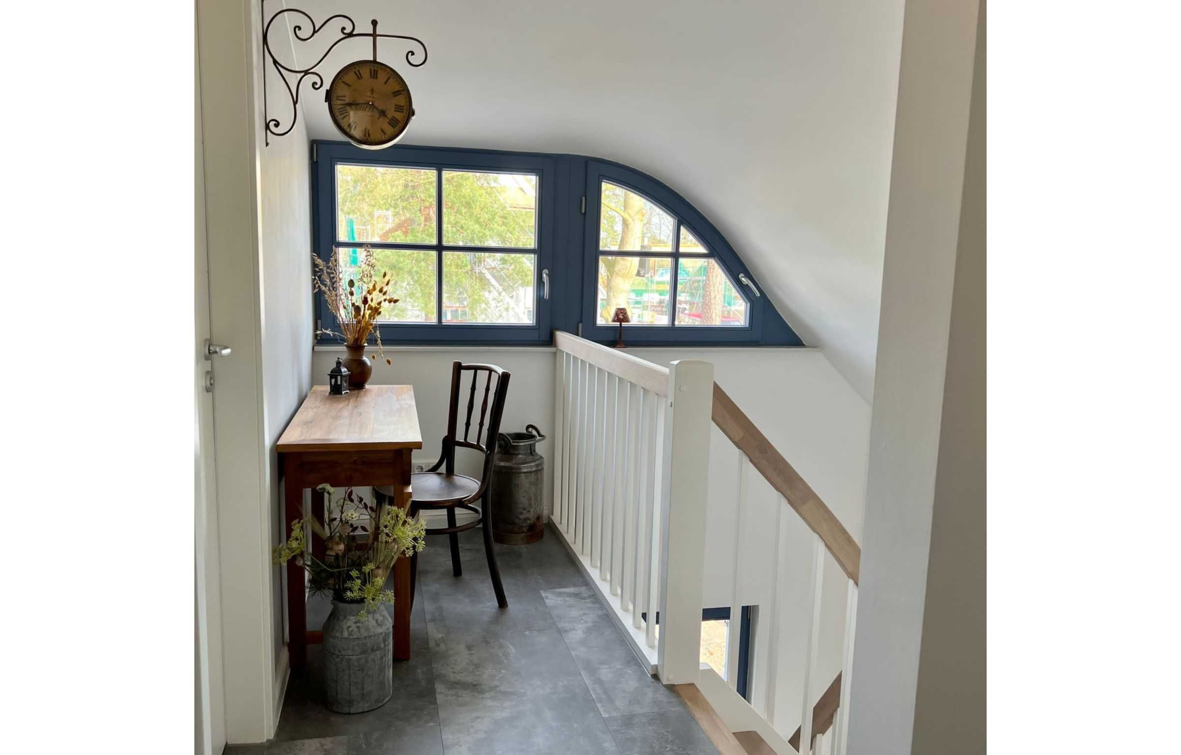 Beim Betreten des Hauses erwartet Sie ein heller, offener Flur mit großem Spiegel, viel Platz für Ihre Schuhe & Taschen sowie Ihre Garderobe. Über eine geschlossene Holztreppe gelangt man ins Obergeschoss.
