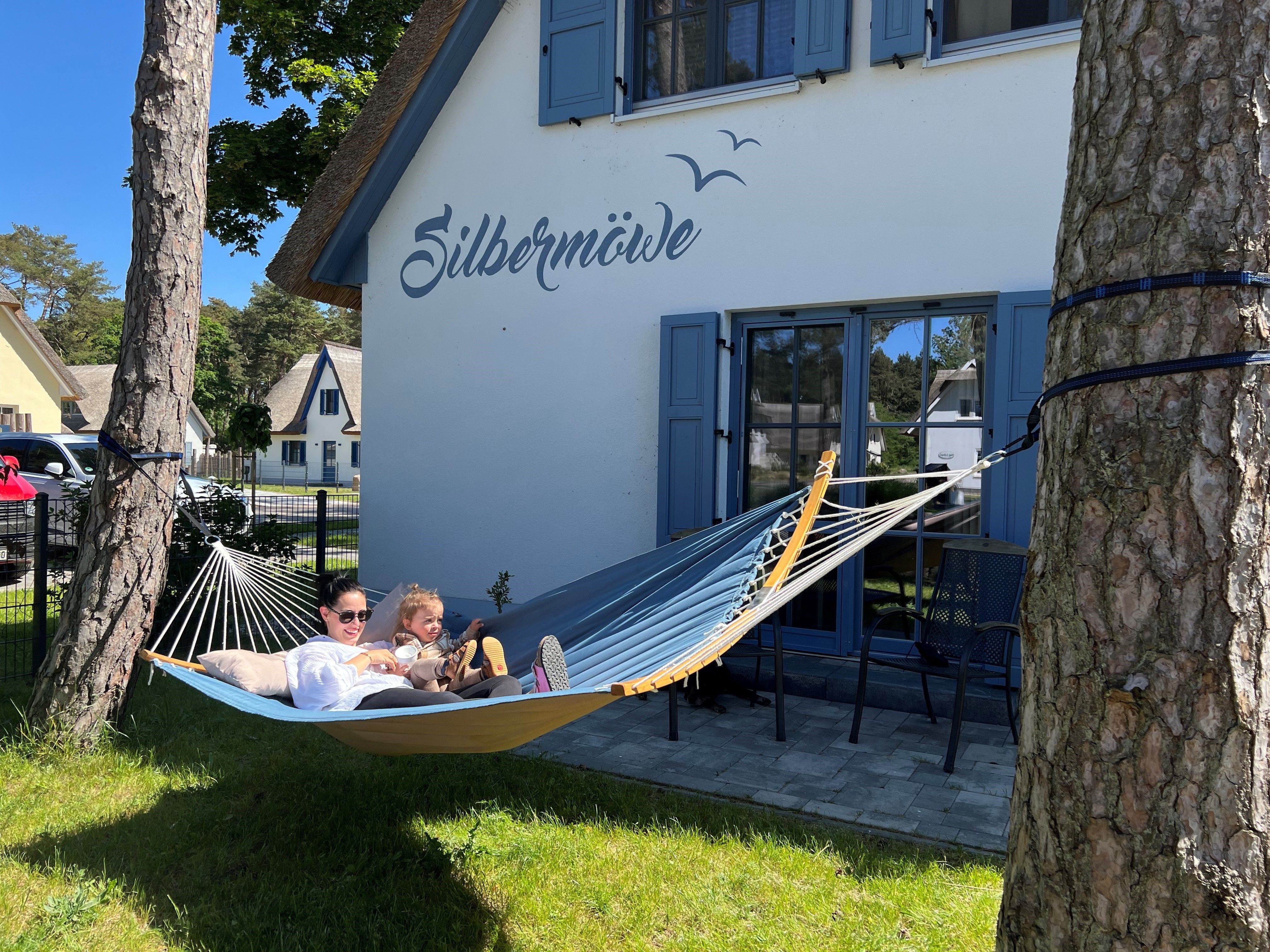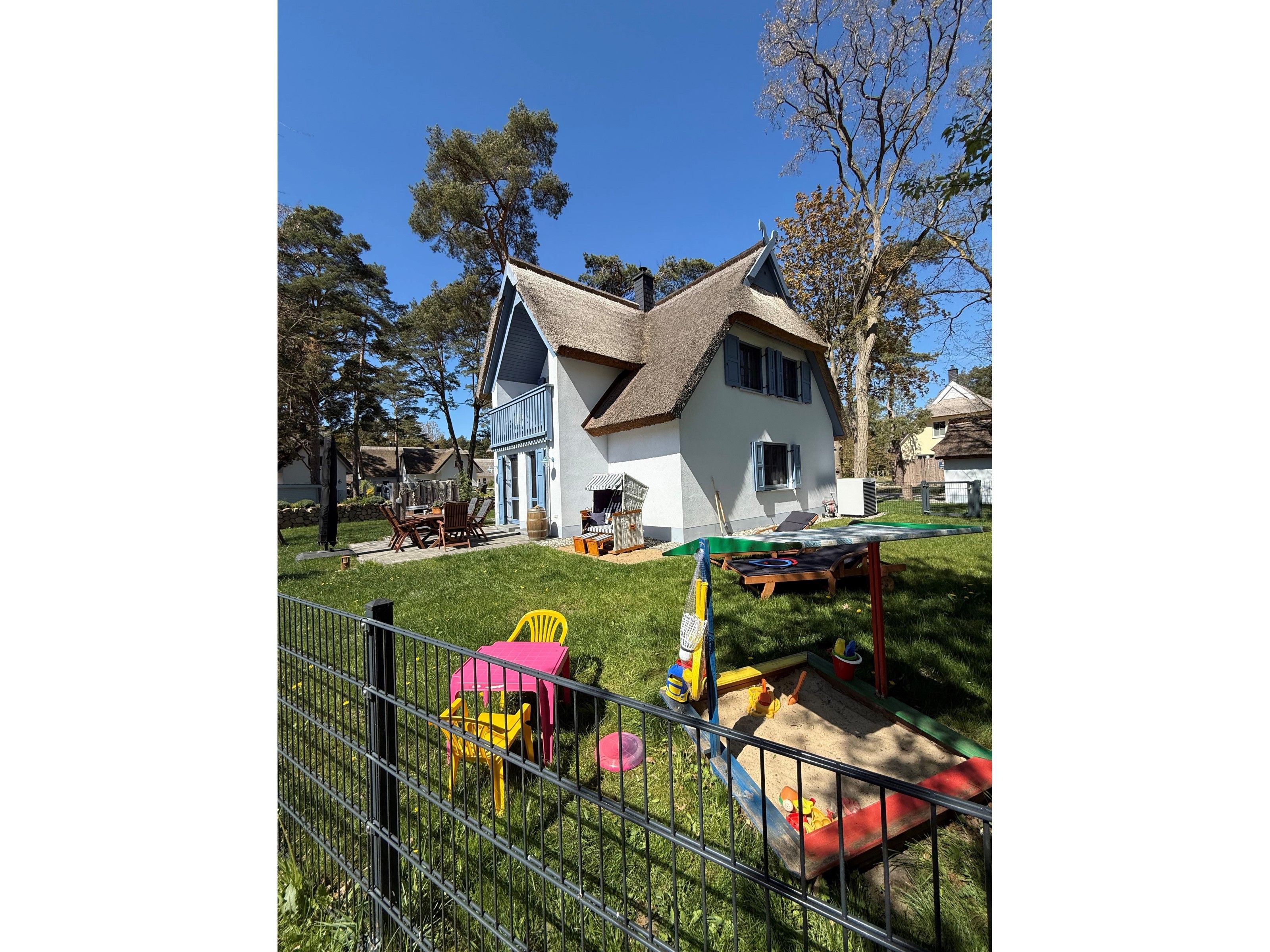 Die große Terrasse ist mit gemütlichen Massivholz- Gartenmöbeln großen 2m Tisch mit 6 Hochlehnen- Klappstühlen, 2 Sonnenliegen, Sonnenschirm, Strandkorb und Elektrogrill ausgestattet. Auch die kleine Terrasse und Balkon sind mit Möbeln ausgestattet. Im Garten gibt es einen Buddelkasten & Spielzeug für die kleinen.