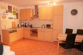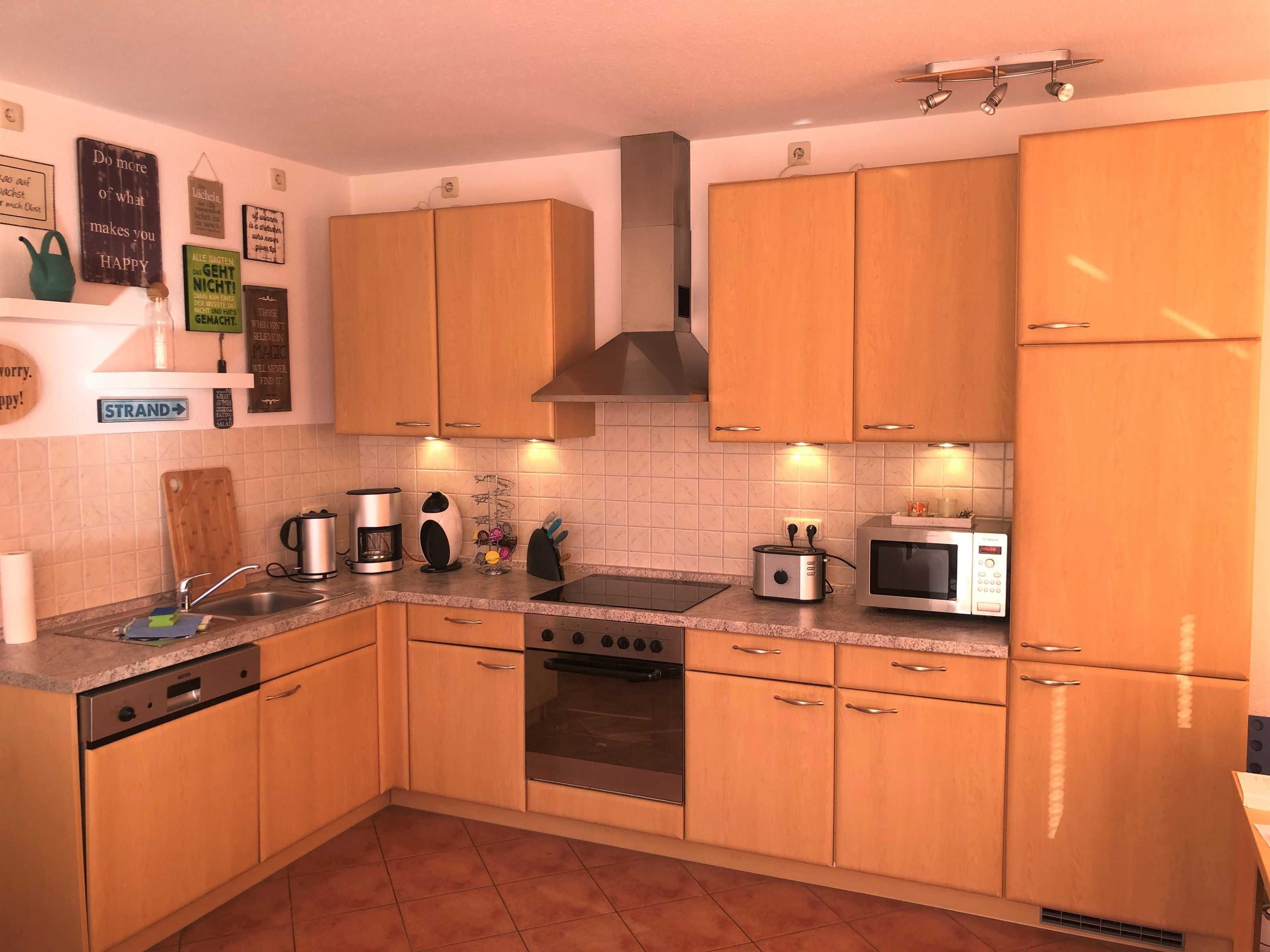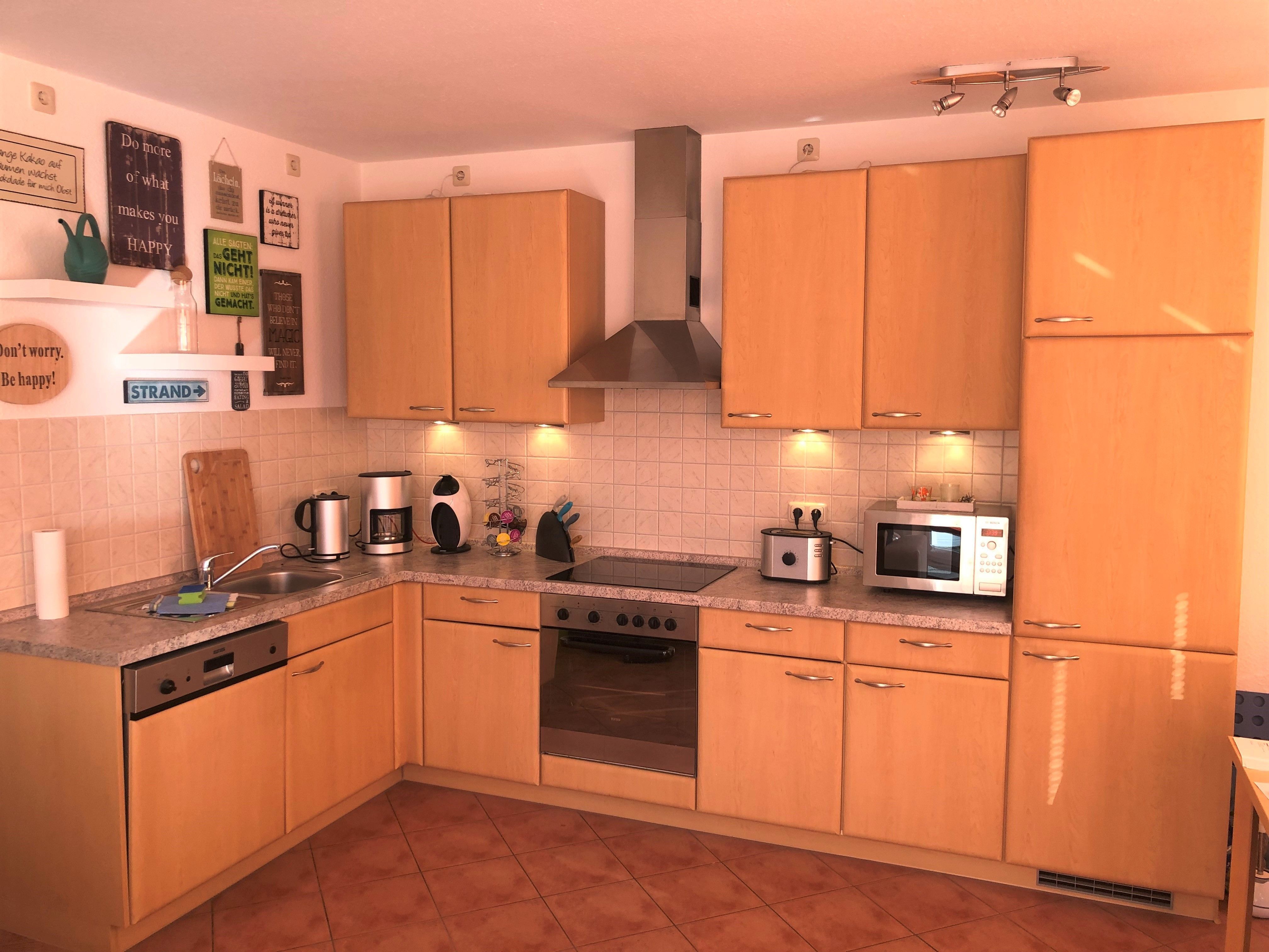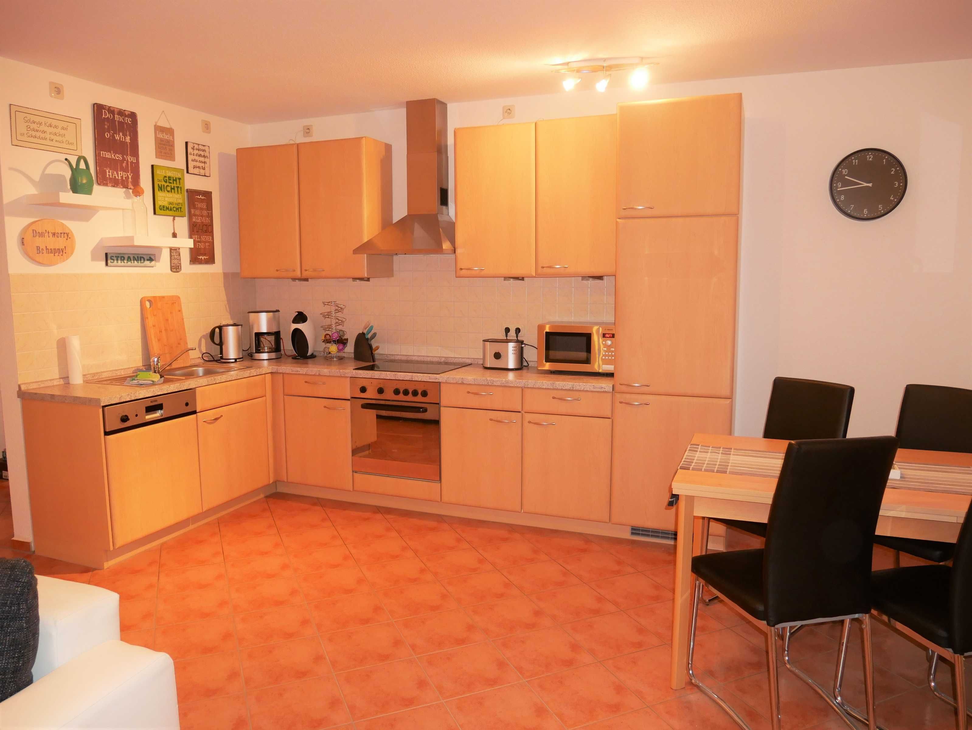 Die moderne und helle 2-Raum-Ferienwohnung verfügt über einen großzügigen Wohn-Essbereich mit gemütlicher Couch und FLAT-TV sowie einem Esstisch. Die offene Küche ist mit einem Cerankochfeld, Backofen, Geschirrspüler, Kühlschrank mit kleinem Gefrierfach, Mikrowelle, Toaster, Wasserkocher, Eierkocher und Filterkaffeemaschine ausgestattet. Das separate Schlafzimmer verfügt über ein Doppelbett, einen zusätzlichen FLAT-TV und einen großen Kleiderschrank für Ihre Urlaubsgarderobe. Ein verdunkelndes Plissee und Insektenschutzgaze sorgen für ungestörten Schlaf. Das moderne Badezimmer erwartet Sie mit einer bodengleichen Walk-In Dusche, Waschtisch, Handtuchheizung, WC und Fön. Vom Wohnbereich gelangen Sie auf die sonnige, möblierte Terrasse. Auf Wunsch spendet eine Markise Schatten. Ein PKW-Stellplatz steht Ihnen in der hauseigenen Tiefgarage zur Verfügung. Die Erstausstattung Bettwäsche & Handtücher ist inklusive.