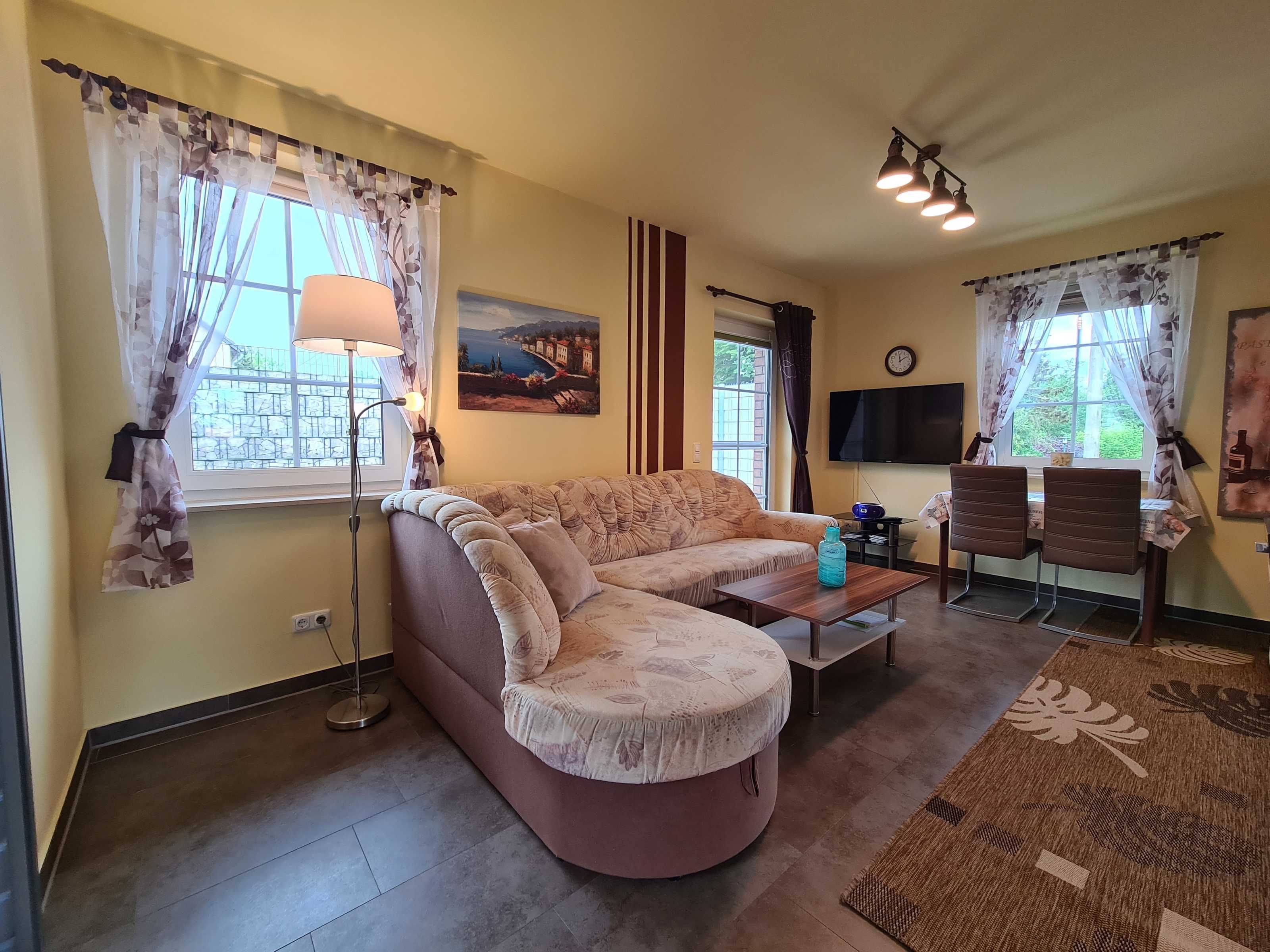 Offener Wohnbereich, voll ausgestattete Küchenzeile, Terrasse, zwei Schlafräume, Duschbad/WC, Fußbodenheizung. Insektenschutz/ Gaze.