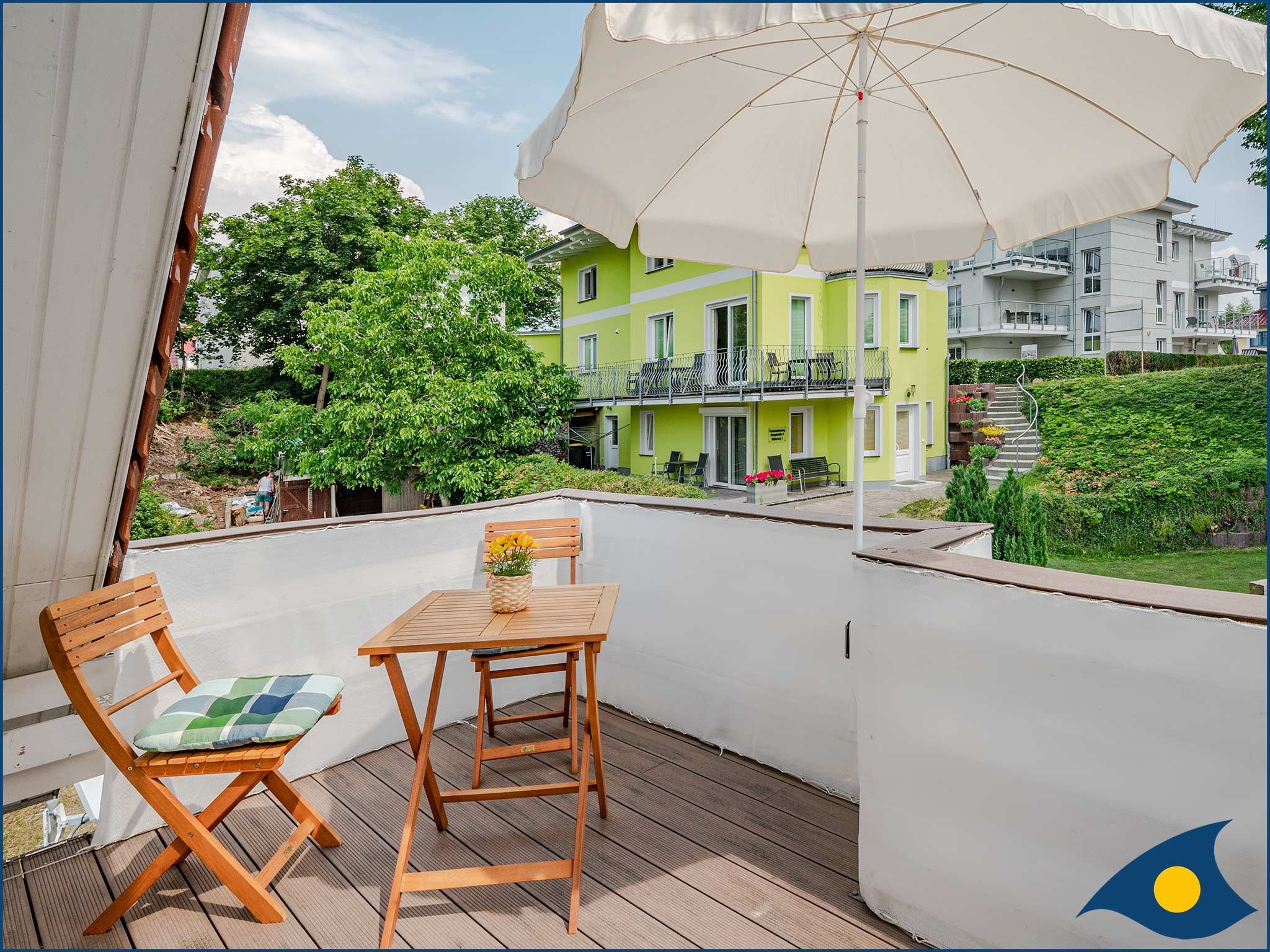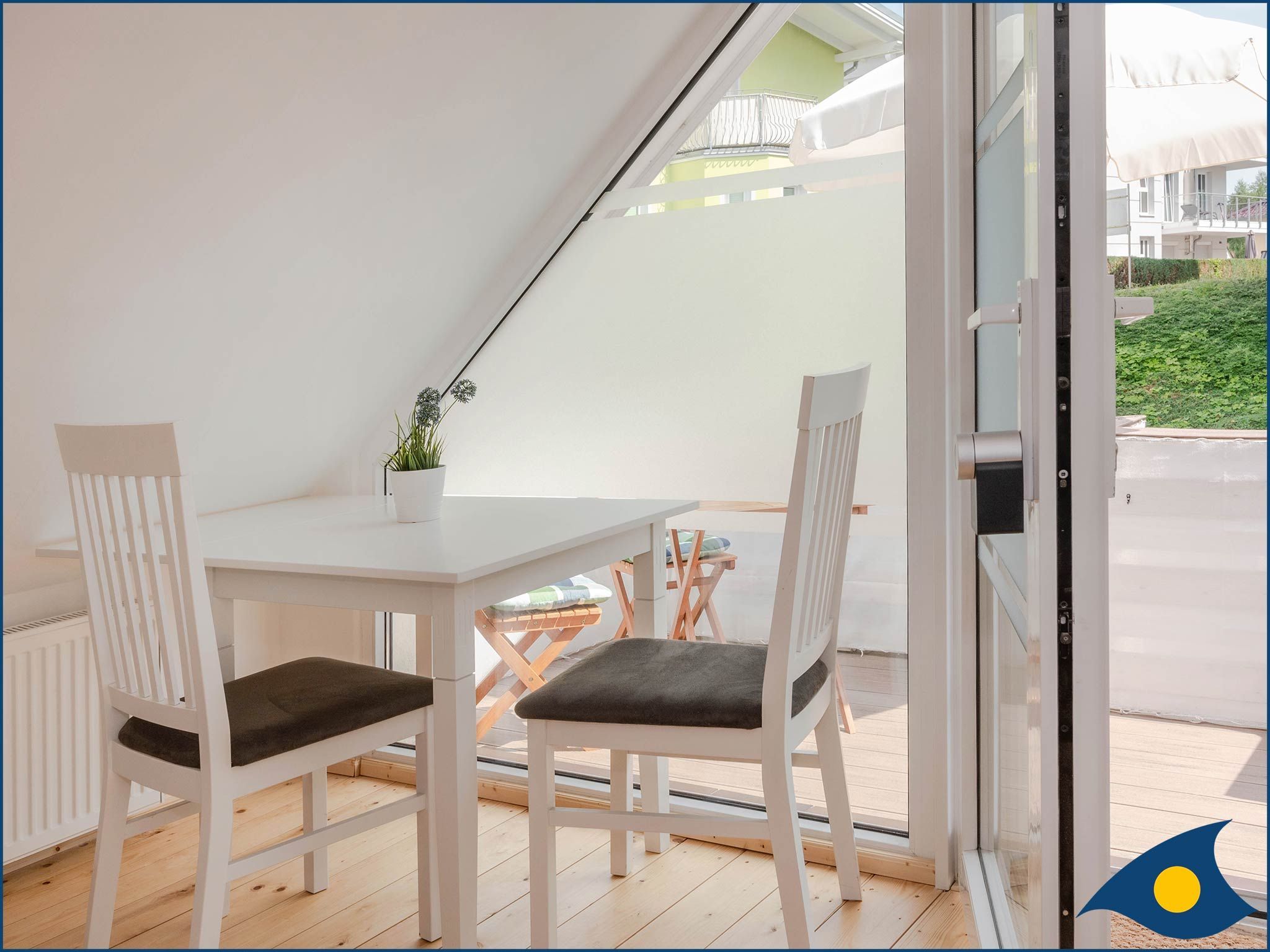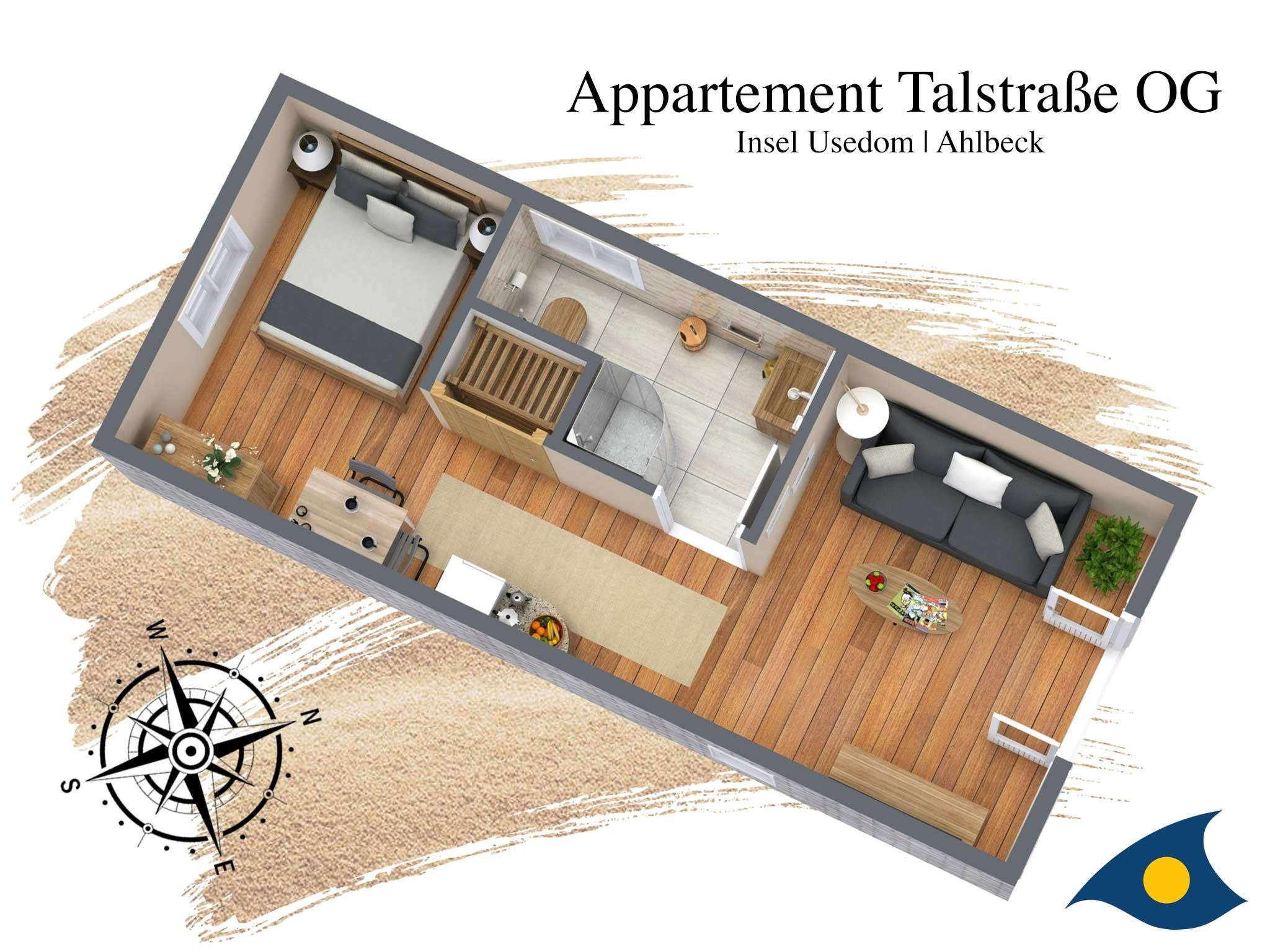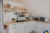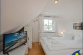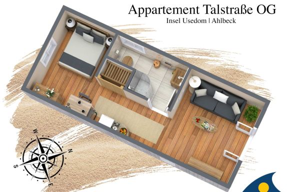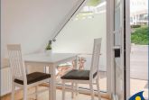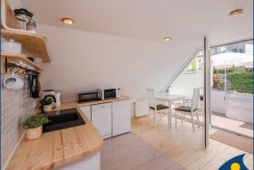 Das offene Atelier im Dachgeschoss, mit maritimer Einrichtung hat einen gemütlichen Wohnküchenbereich mit Balkon. Die Küche ist ausgestattet mit zwei Kochplatten, Geschirrspüler, Kühlschrank, Mikrowelle und Minibackofen. TV, WLAN und Klimaanlage sind vorhanden. Bitte beachten Sie, das aufgrund der Dachkonstuktion die Deckenhöhe maximal 2.12m beträgt.