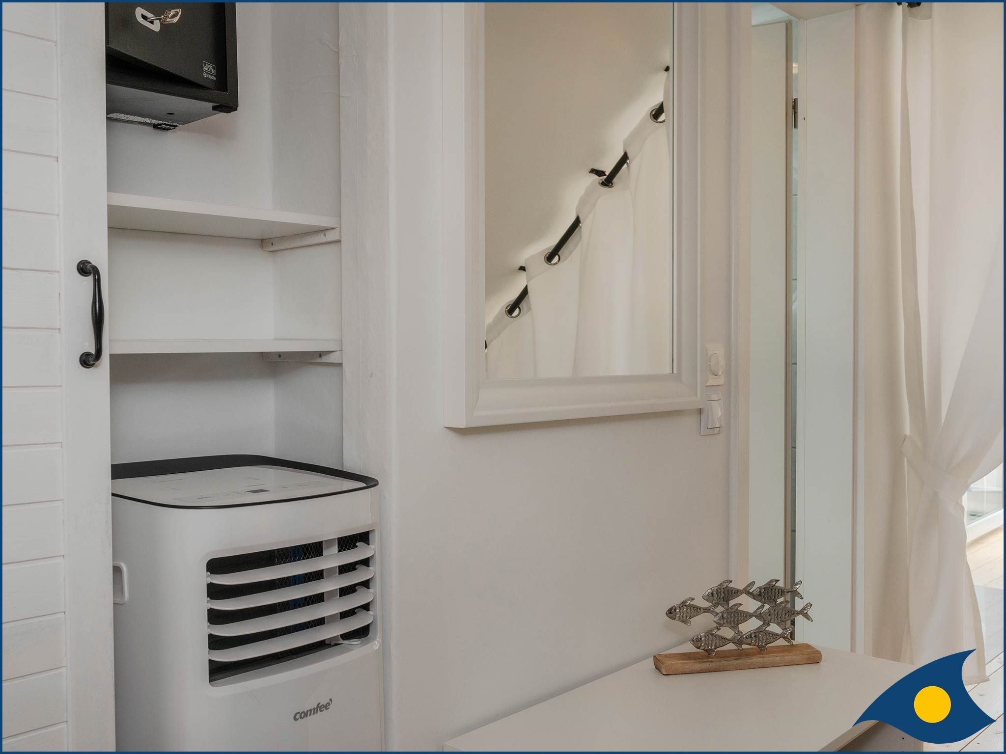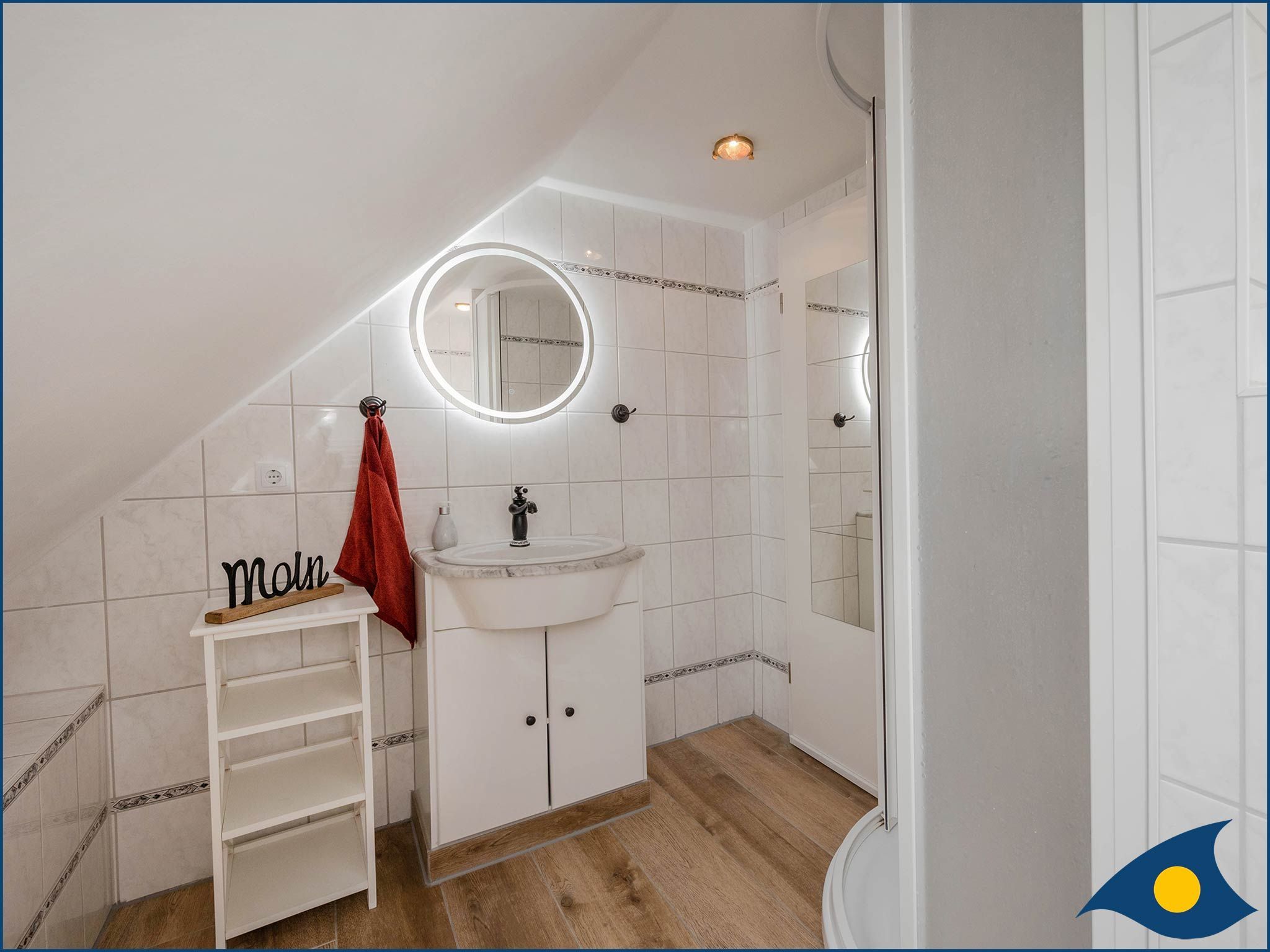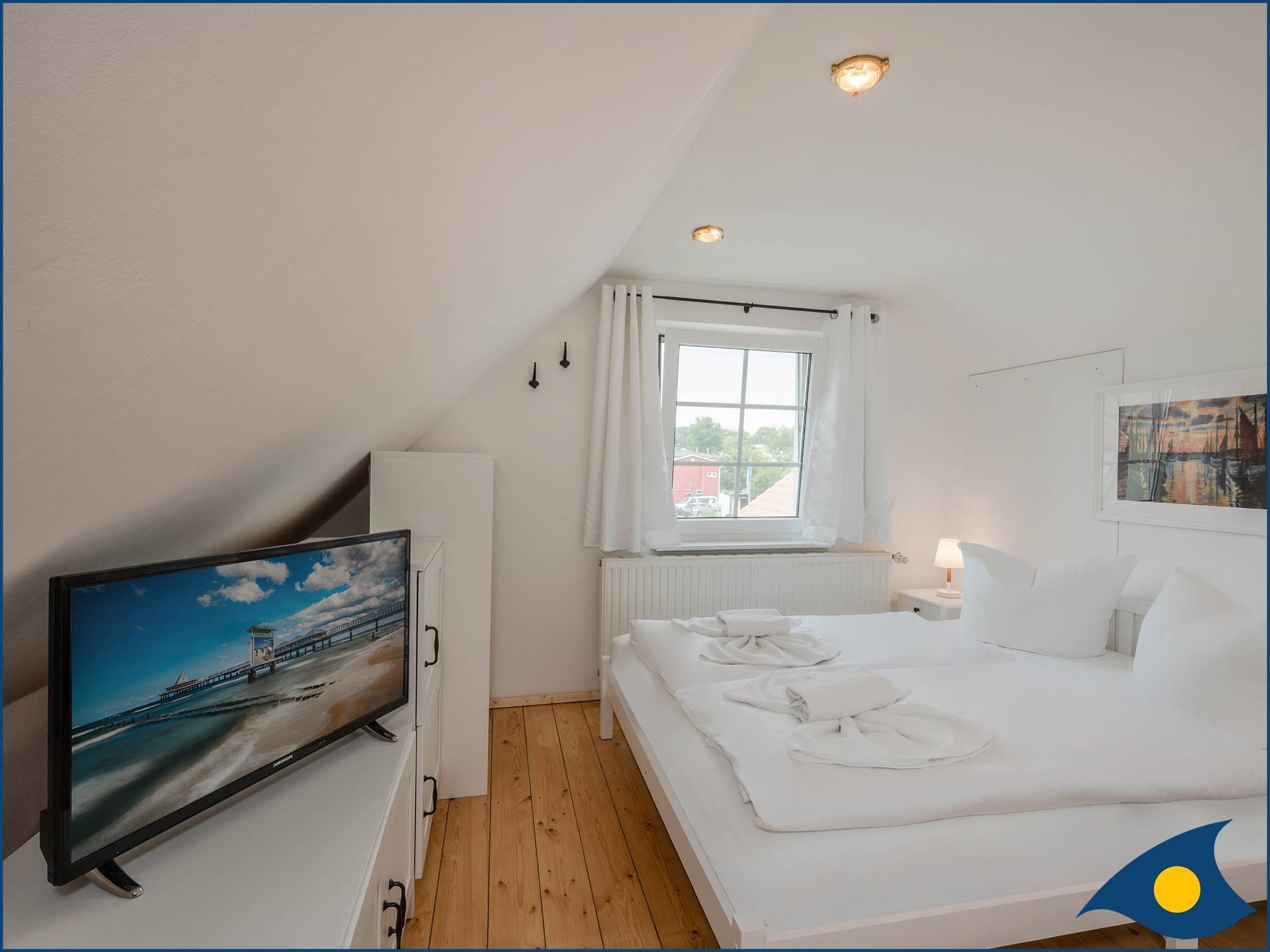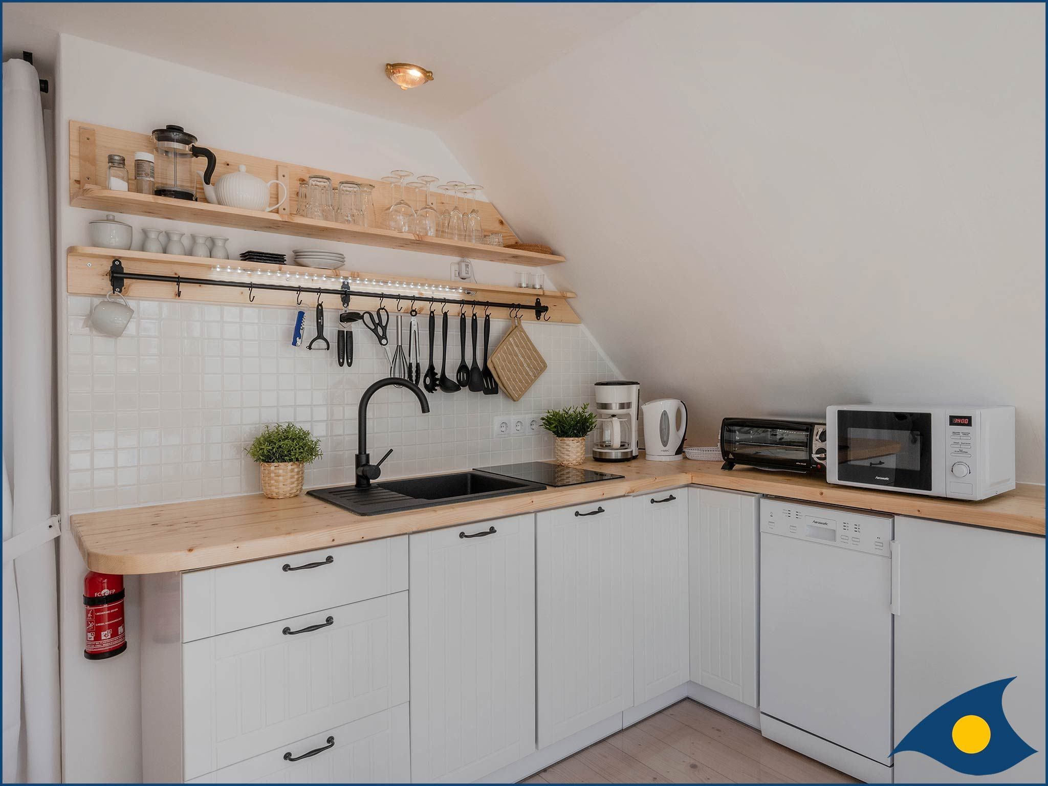 Das offene Atelier im Dachgeschoss, mit maritimer Einrichtung hat einen gemütlichen Wohnküchenbereich mit Balkon. Die Küche ist ausgestattet mit zwei Kochplatten, Geschirrspüler, Kühlschrank, Mikrowelle und Minibackofen. TV, WLAN und Klimaanlage sind vorhanden. Bitte beachten Sie, das aufgrund der Dachkonstuktion die Deckenhöhe maximal 2.12m beträgt.