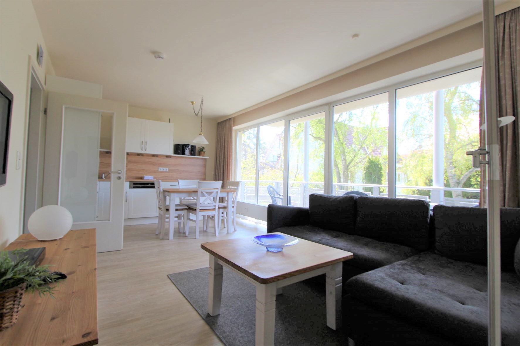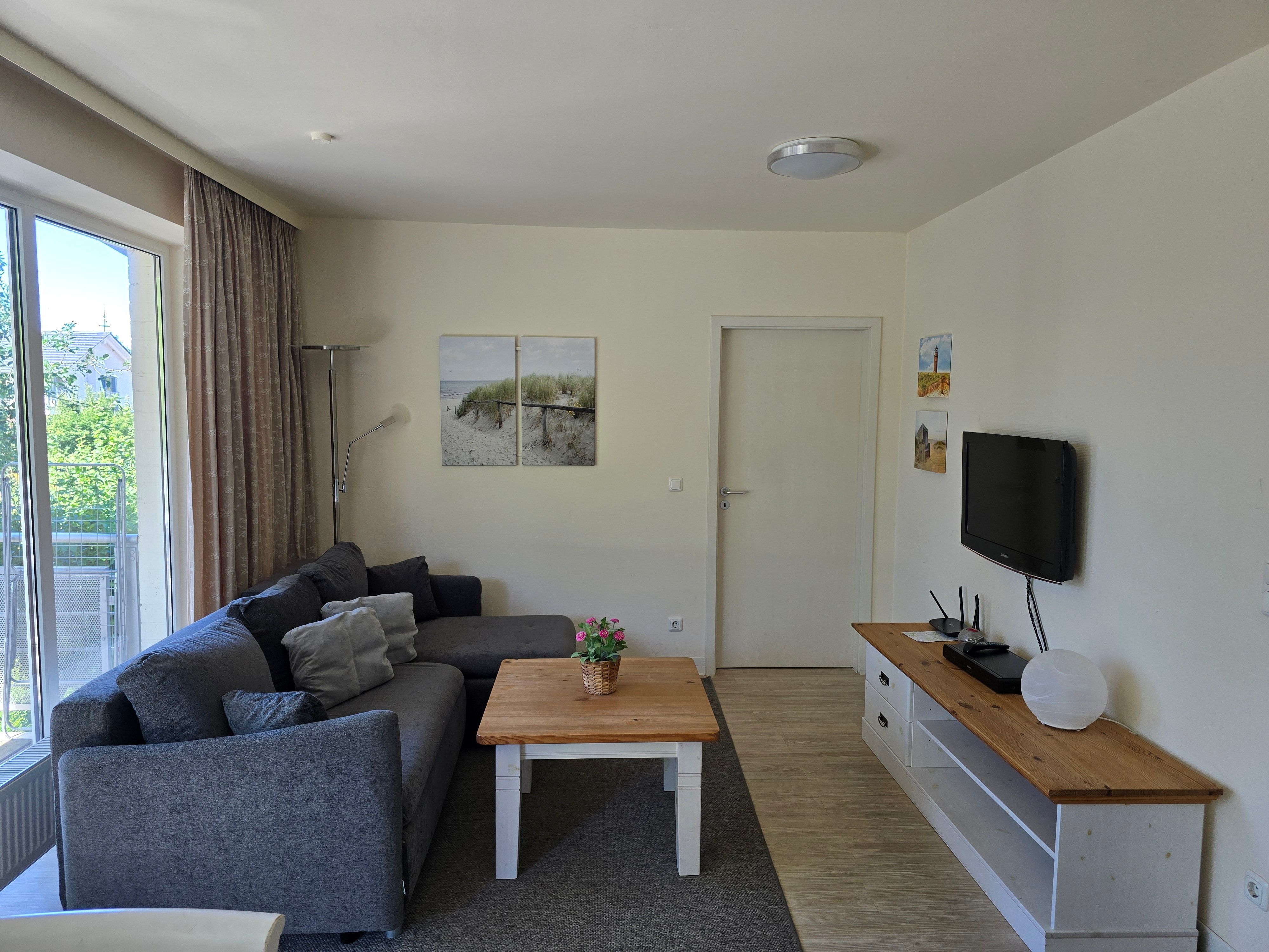 Sie wohnen in einem 2-Zimmer-Appartement für bis zu 3 Personen auf 45 m² Wohnfläche im 1. OG. Ein Schlafzimmer mit Doppelbett (mit TV-Gerät), Wohn-/Schlafraum mit bequemer Doppelbettcouch, separater Essplatz, voll ausgestatteter Küchenbereich mit Geschirrspüler und Mikrowelle, Dusche/WC, Balkon, SAT-TV mit Flachbildschirm, Telefon. KFZ-Stellplatz in der Tiefgarage.