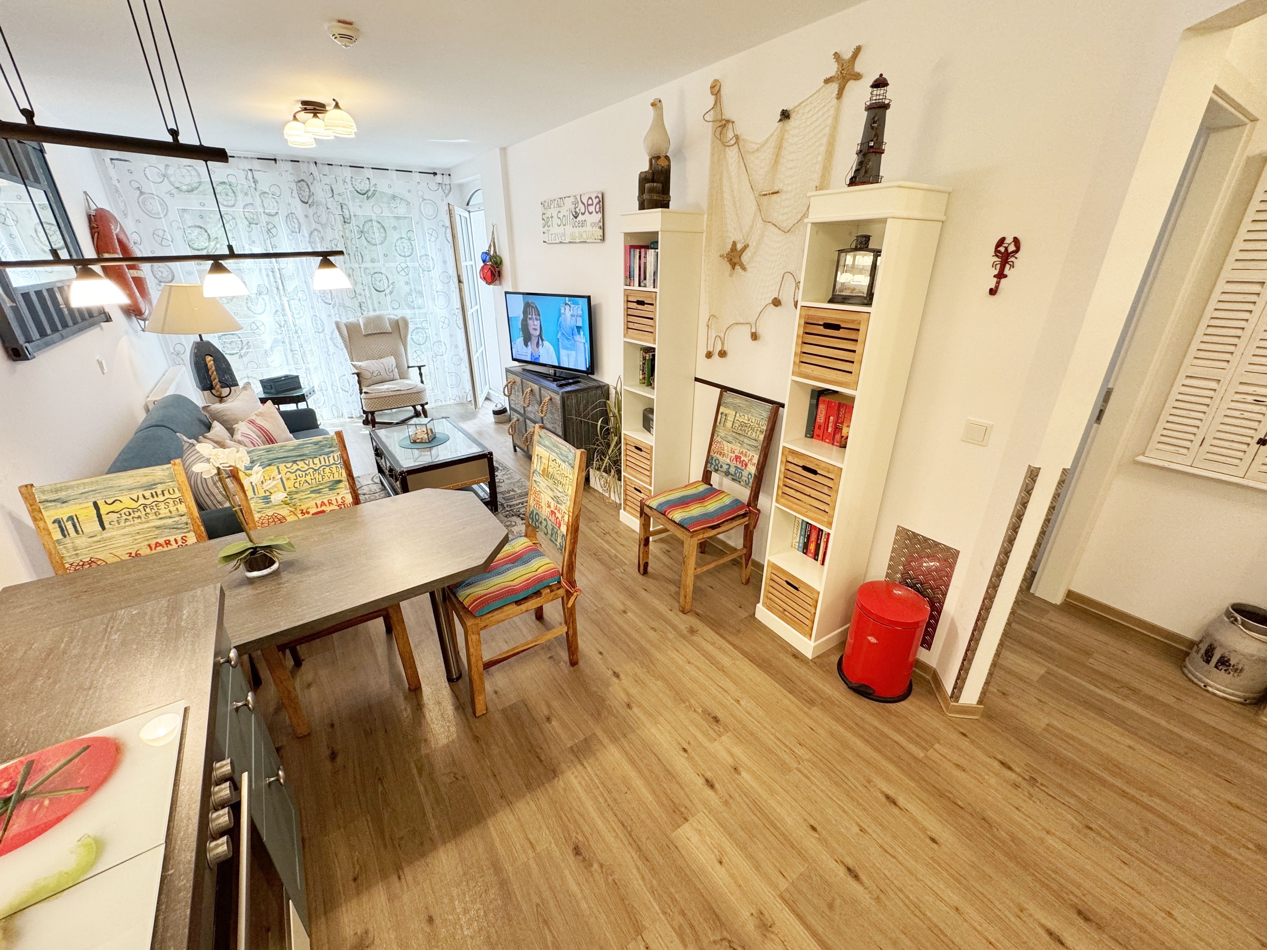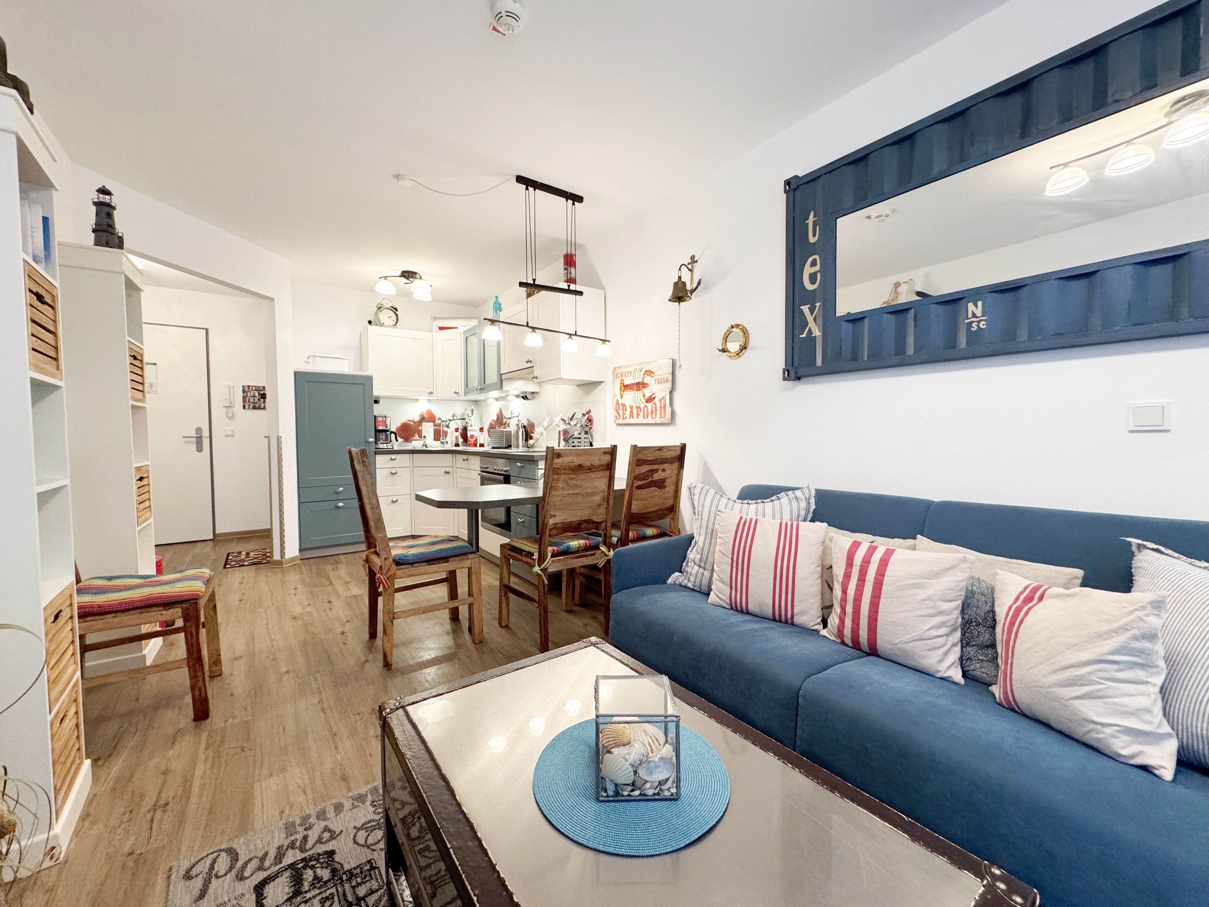 Dieses individuell eingerichtete Nichtraucher-Appartement mit separatem Schlafzimmer im zweiten Obergeschoss des Hauses Meeresblick bietet Ihnen ausreichend Platz. Auf ca. 41 m² fühlen Sie sich mit max. 2 Erwachsene + 1 Kleinkind bis 3 Jahre im Kinderreisebett wohl. Sie erwartet ein Wohn-/Essbereich mit integrierter Küchenzeile, die mit einem 4-Zonenkochfeld, einem Kühlschrank mit Gefrierfach, einer Geschirrspülmaschine, einer Kaffeemaschine, einen Toaster und einem Wasserkocher und allen Küchenutensilien vollwertig ausgestattet ist. Natürlich wurde auch an einen gemütlichen Essplatz gedacht. Im angrenzenden Wohnbereich lädt eine Couch zum Verweilen ein. Der gemütliche Sessel, ist der ideale Ort, um den Tag ausklingen zu lassen, oder auch mal, um zwischendurch zu relaxen. Zusätzlich finden Sie hier noch eine Stehlampe, einen Couchtisch sowie Regale wo etwas Urlaubslektüre auf Sie wartet. Ein Internetanschluss (WLAN/LAN) steht Ihnen inklusive zur Verfügung. Der technische Bereich wird durch einen Flachbild-TV sowie ein DAB-Radio abgerundet. Auf dem windgeschützten und bestuhlten Balkon (Nord) können Sie Ihre Ruhe finden, da er ist nur von einer Seite einsehbar ist. Diesen erreichen Sie vom Wohnbereich. Im separaten Schlafzimmer stört Sie in der Nacht höchstens das Geräusch des Windes, der durch die Kiefern weht. Ein 1,80 m x 2,00 m Doppelbett, mit Komfort- Wendematratzen (HG 3 & 4), Nachttischablagen einen geräumigen Kleiderschrank, ein Flachbild TV sowie Insektenschutzgitter runden die Ausstattung ab. Das moderne Duschbad verfügt über eine ebenerdige Glasdusche, ein WC, ein Waschplatz, einen Kosmetikspiegel, einen Fön sowie einem Schrank. Haustiere sind nicht erlaubt. Ein Tiefgaragen-Stellplatz (Nr. 16, Einfahrtshöhe 2,00m) steht unseren Feriengästen kostenlos zur Verfügung, von wo Sie Ihre Ferienwohnung bequem mit dem Aufzug erreichen können. Ein Ausweichstellplatz im Freien befindet sich hinter dem Café Zeit. Der Wellnessbereich, der exklusiv den Bewohnern des Haus Meeresblick vorbehalten ist, beinhaltet ein Schwimmbecken (ca. 8,00 x 4,00 m - 1,35 m tief), zwei Saunen (1 Bio-Sauna & 1 Finnische Sauna), eine Erlebnisdusche, drei Duschanlagen, eine Schneckendusche sowie Umkleiden für Damen und Herren, und natürlich WCs. Es findet sich hier auch eine schöne Außenterrasse, die es erlaubt, Sonne und Seeluft ohne den Trubel des Strandes zu genießen. Im Keller des Hauses haben Sie die Möglichkeit eine Waschmaschine/Trockner gegen Gebühr zu nutzen. Ein Kinderreisebett steht für unsere kleinen Gäste inklusive zur Verfügung. Einen Hochstuhl können gegen eine Gebühr dazubuchen. Die Erstausstattung eines Wäschepaketes (komplette Bettwäsche, 1 Duschhandtuch, 2 kleine Handtücher) können Sie bis 14 Tage vor Anreise gegen einen Aufpreis dazu buchen oder durch eigene ergänzen. Ab 2 gebuchten Paketen erhalten Sie einmalig 1 Geschirrhandtuch und 1 Duschvorleger hinzu.