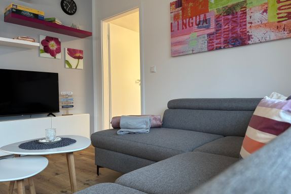 Im Wohnbereich erwartet Sie eine gemütliche Eckcouch mit Schlaffunktion und ein großer Flachbildschirm. Vom Wohnzimmer haben Sie direkten Zugang zum großen Balkon mit Meerblick (im Sommer durch die Bäume der Strandpromenade beeinträchtigt).