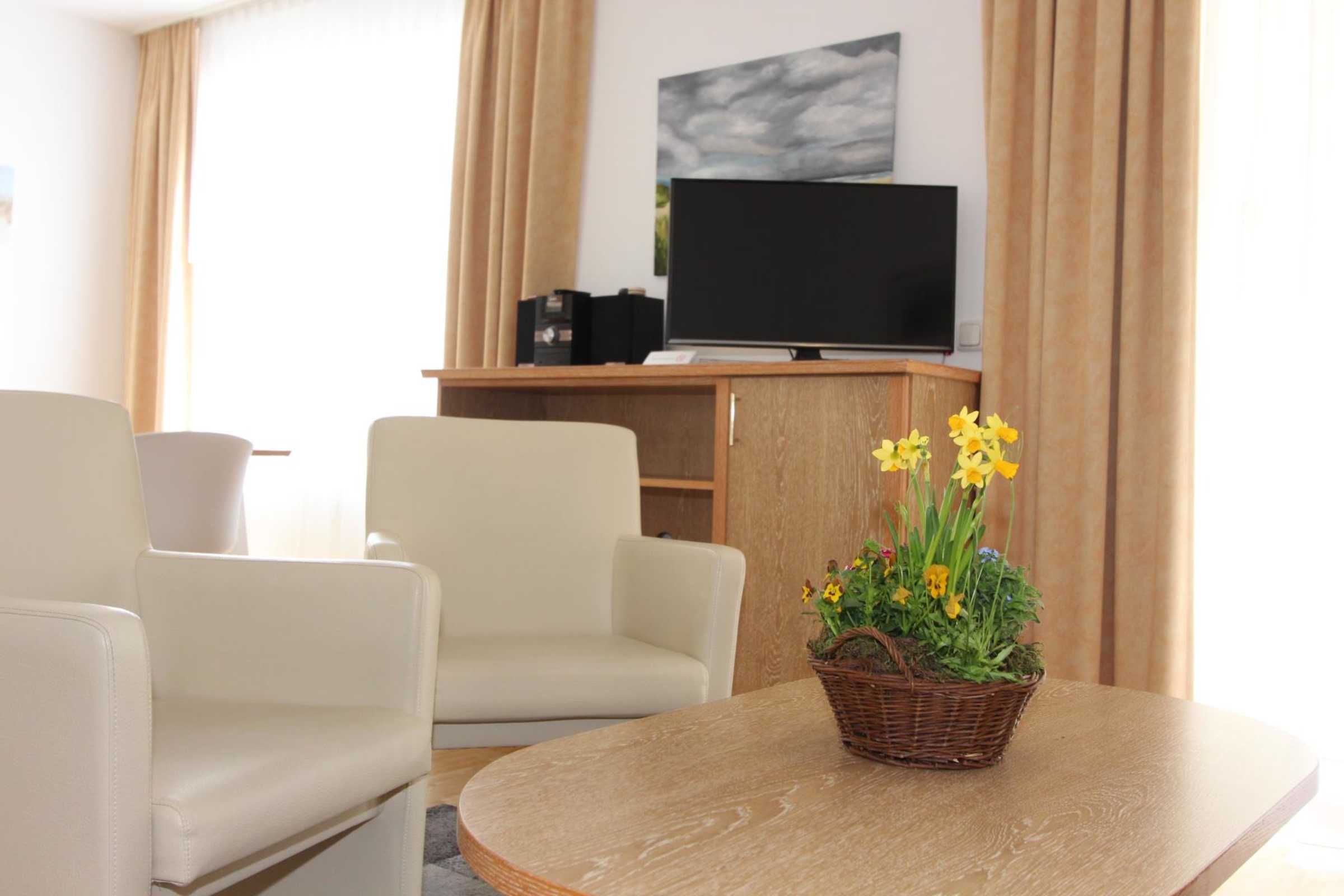 Der Wohn- und Schlafraum ist mit einer bequemen Doppelbettcouch, SAT-TV (kostenfreiem sky-TV) , kostenfreiem WLAN, Stereoanlage mit CD-Player, Telefon und Safe ausgestattet. Der Wohnraum verfügt weiterhin über einenvoll ausgestatteten Küchenbereich einschließlich Spülmaschine, Backofenund Mikrowelle sowie über einen großzügigen Essplatz. Der separate Schlafraum ist mit Doppelbett, SAT-TV, einschließlich kostenfreiem sky-TV und Radiowecker ausgestattet. Das Bad verfügt über Dusche, WC und Föhn.