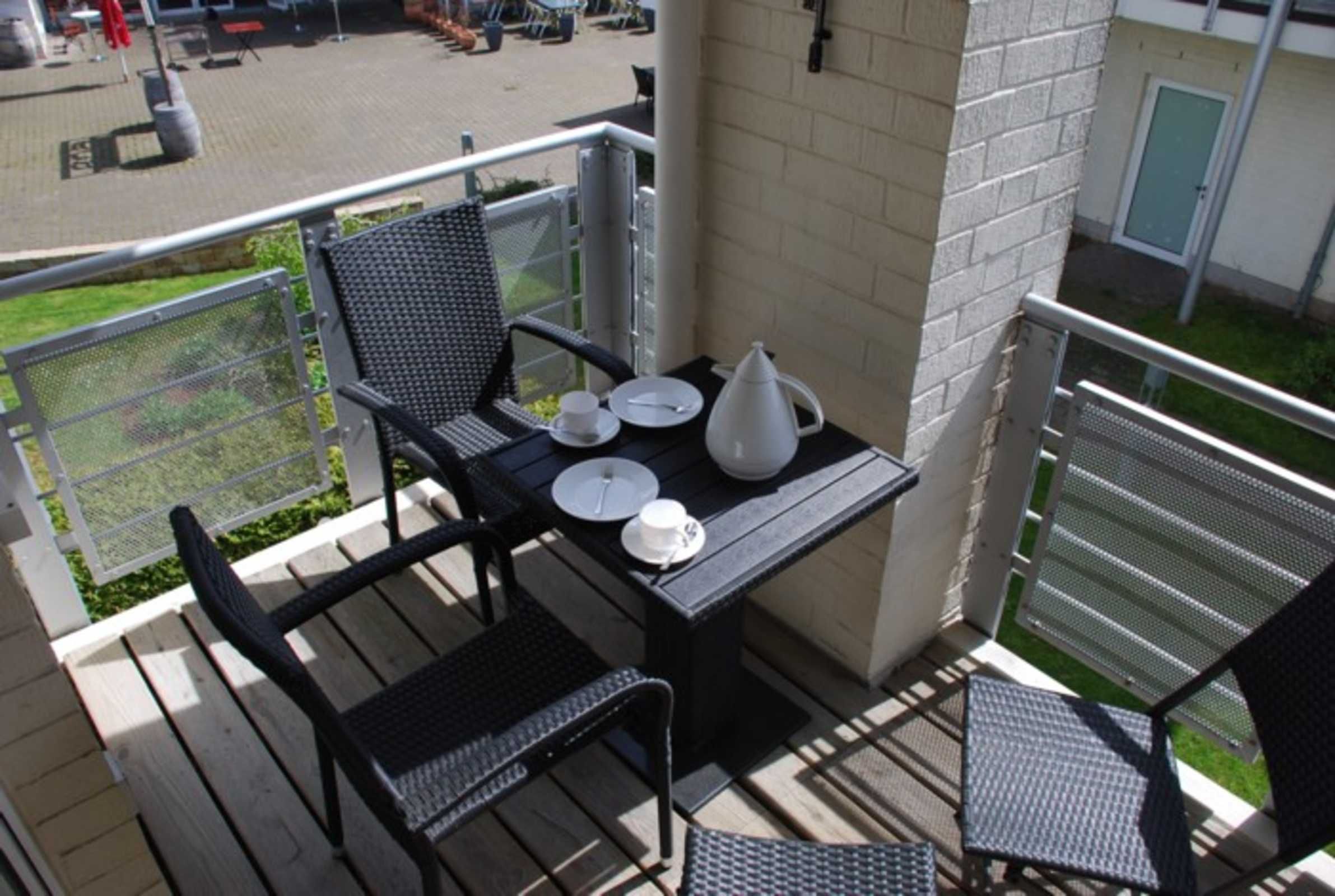 Sie wohnen im 1. OG einer 48 m² großen 2-Raum-Ferienwohnung für bis zu 4 Personen. Die Wohnung ist zum ruhigen Innenhof der Anlage ausgerichtet und verfügt über einen Balkon mit Morgensonne.