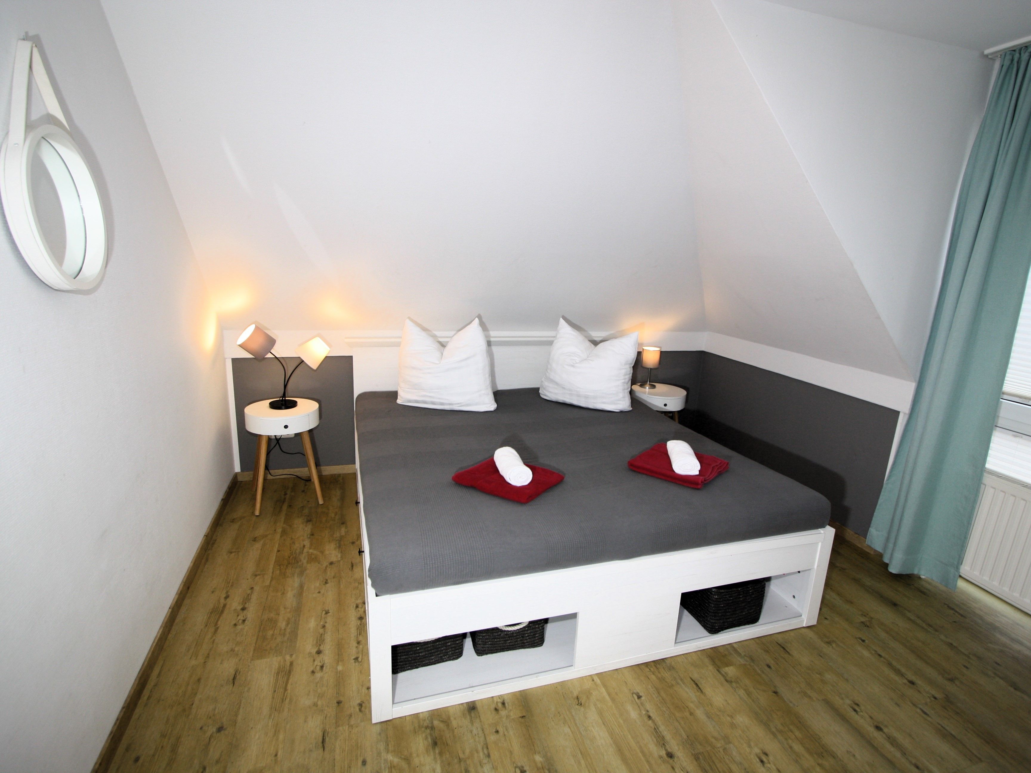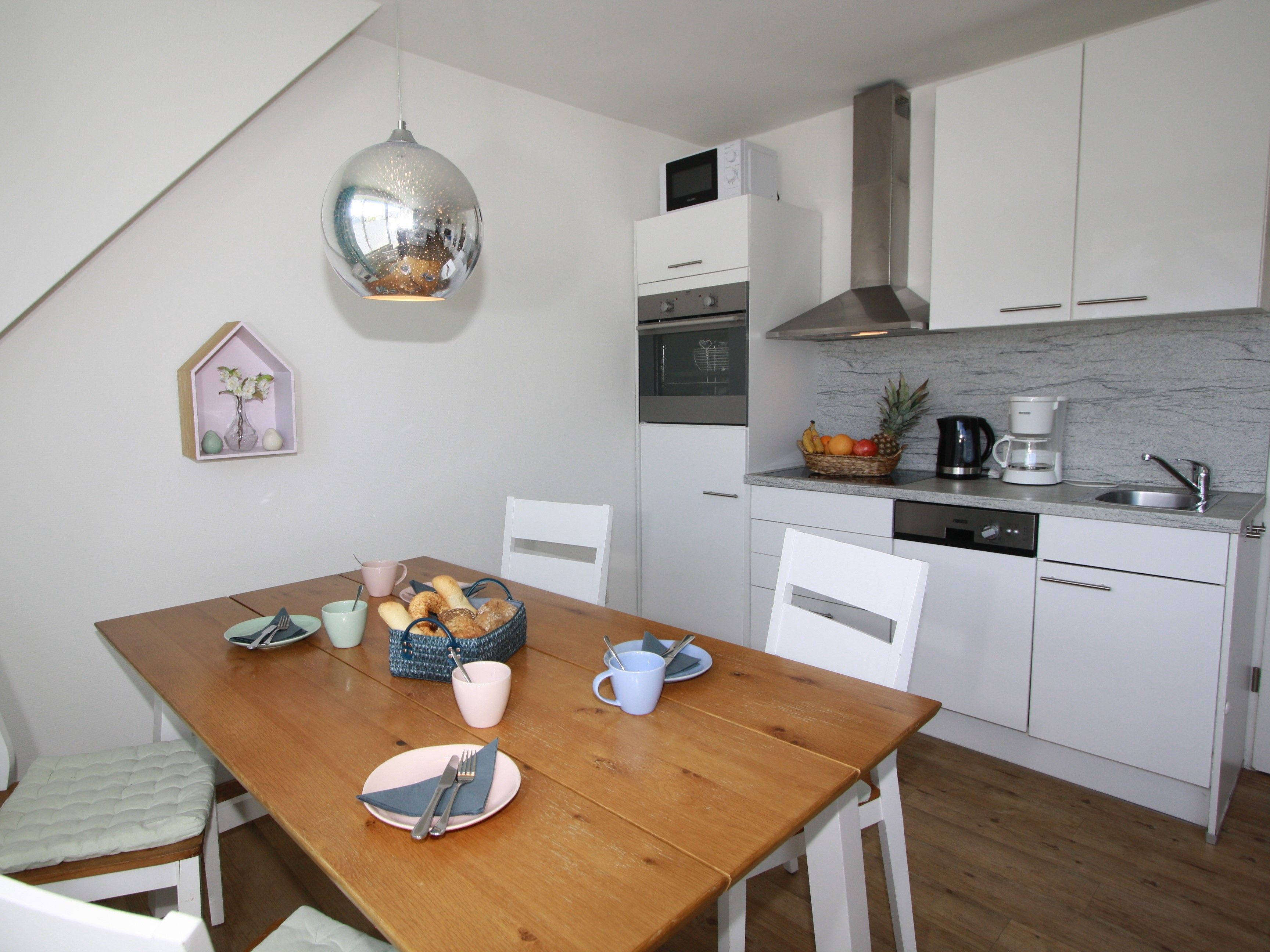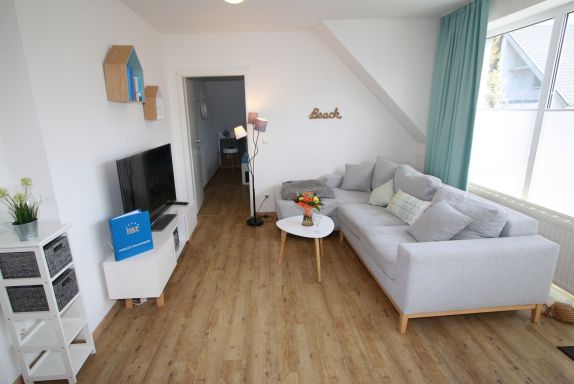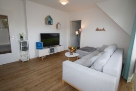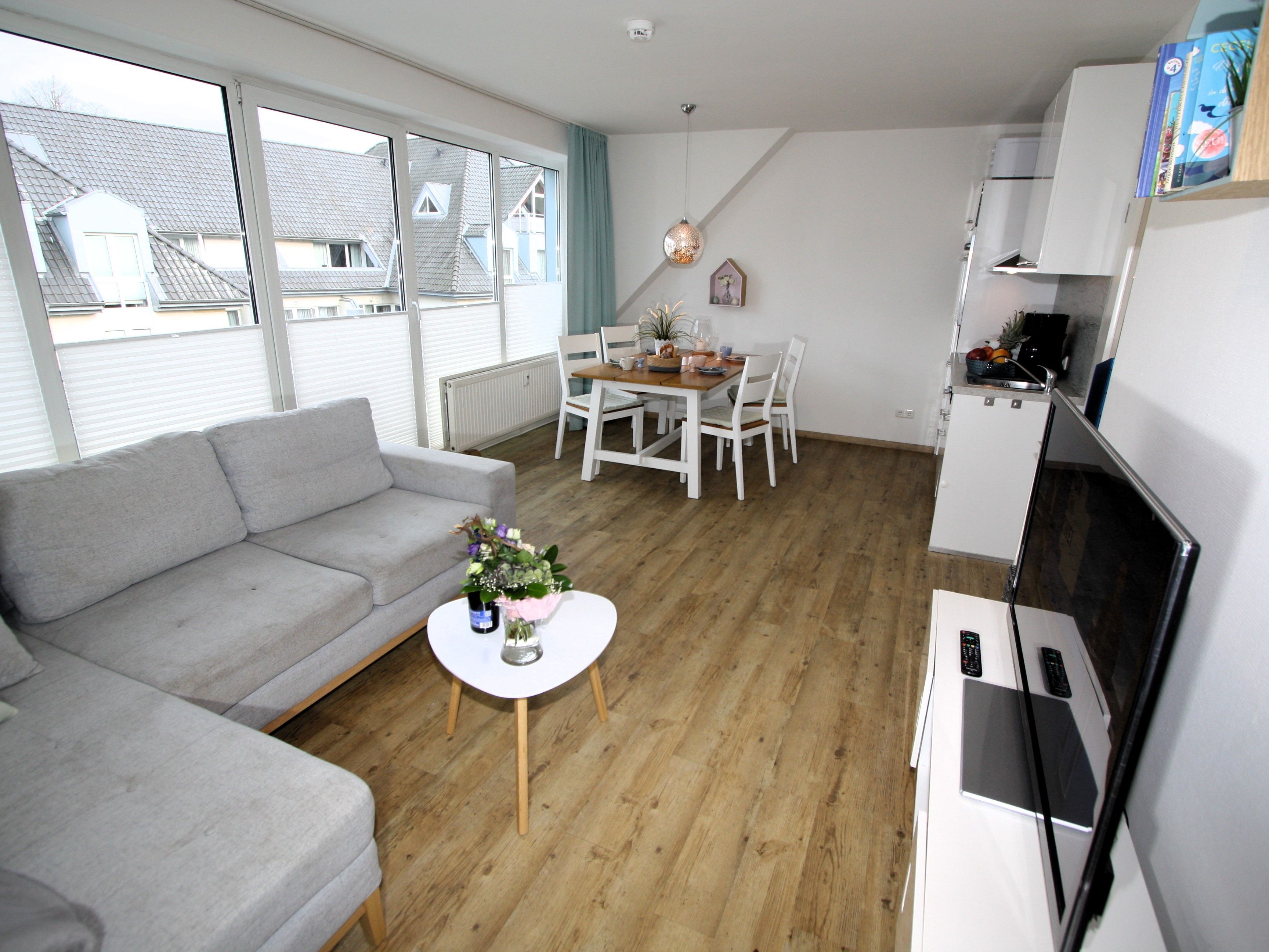 Sie wohnen in einem 2-Zimmer-Appartement für bis zu 4 Personen auf 42 m² sonnendurchfluteter Wohnfläche im Dachgeschoss. Ein Schlafzimmer mit Doppelbett, Wohn-/Schlafraum mit bequemer Doppelbettcouch, separater Essplatz, voll ausgestatteter Küchenbereich, Dusche/WC, sonniger Balkon, 47 Zoll TV + Sky, WLAN und Telefon.