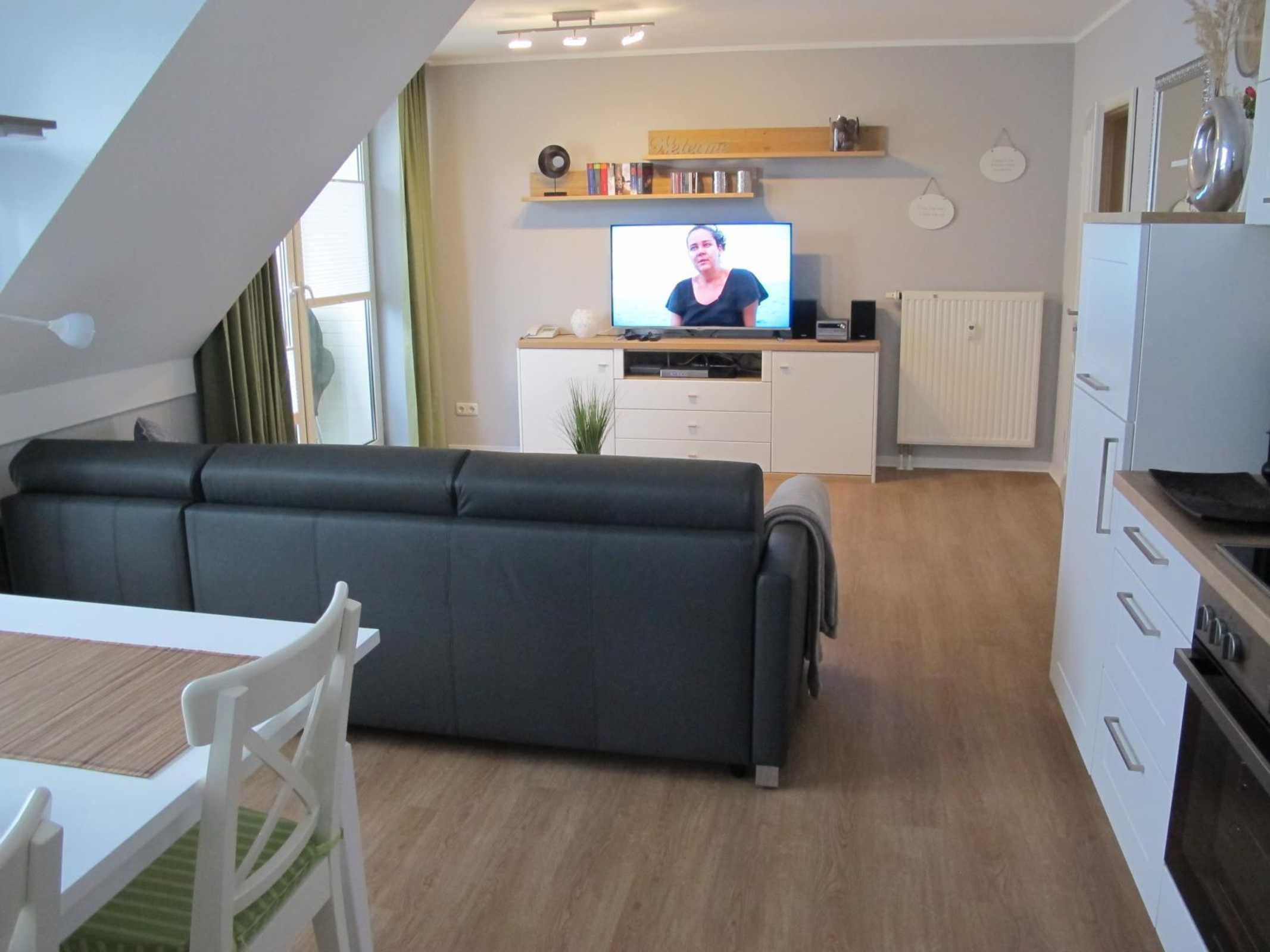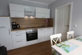 Im Wohn-/Essbereich finden Sie eine moderne Nolte Einbauküche mit einem Cerankochfeld, einem Backofen, einer Mikrowelle mit Ofenfunktion und einem Geschirrspüler. Eine Vielzahl an Küchenutensilien (z.B. Toaster, Kaffeemaschine, Wasserkocher, Geschirr etc.) komplettieren die Küche.