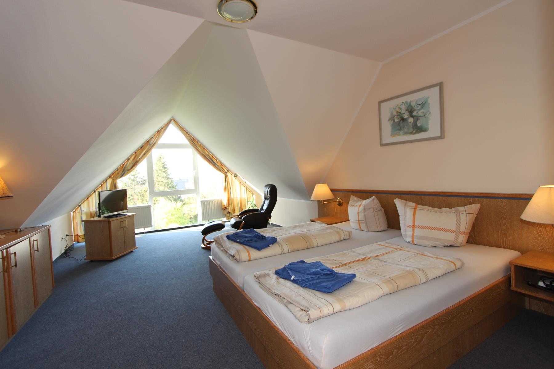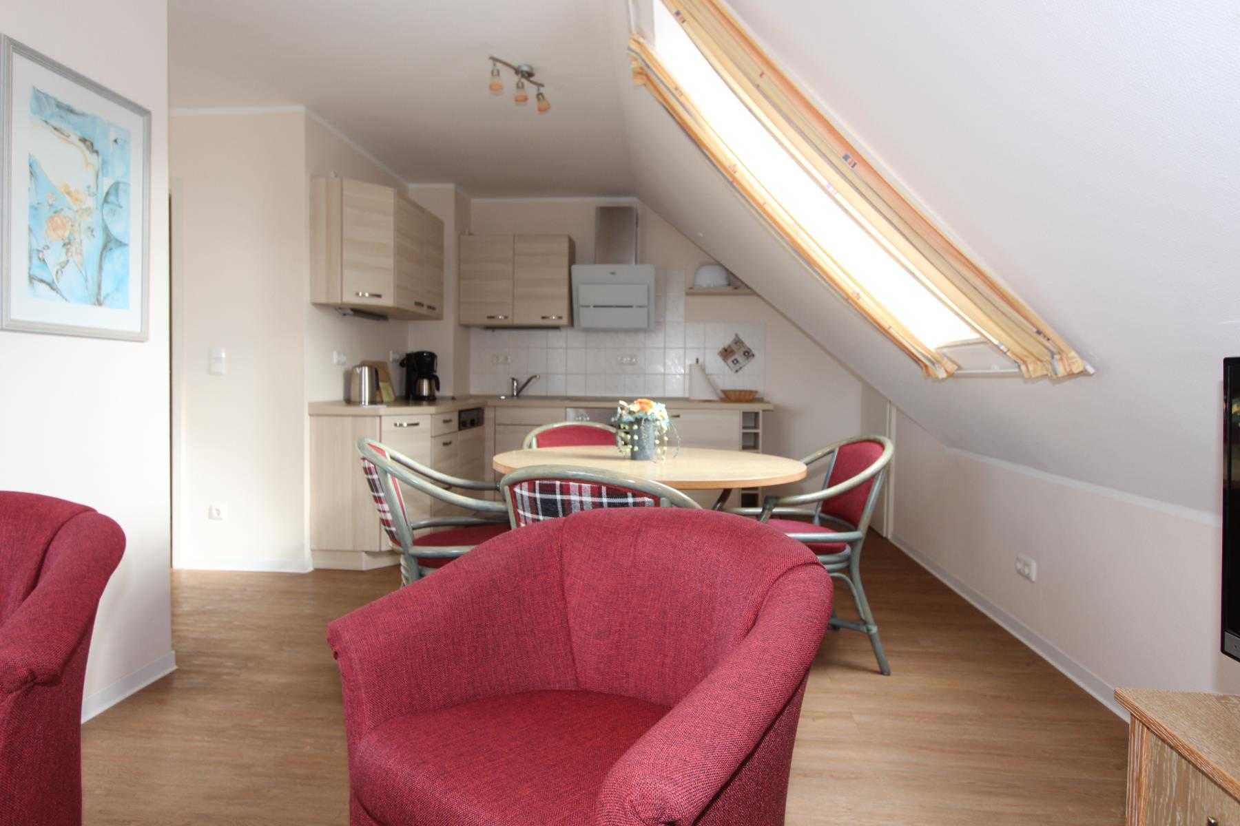 Sie wohnen in einem 2-Zimmer-Appartement für bis zu 4 Personen auf ca. 65 m² im Spitzboden der Residenz Seestern. Die Wohnung verfügt über ein großes Schlafzimmer mit Doppelbett und zusätlichen TV, ein großer heller Wohnraum mit bequemer Doppelbettcouch, separater Essplatz, voll ausgestatteter Küchenbereich mit Geschirrspüler und Mikrowelle, Dusche/WC, große Dachterrasse, SAT-TV und Telefon.