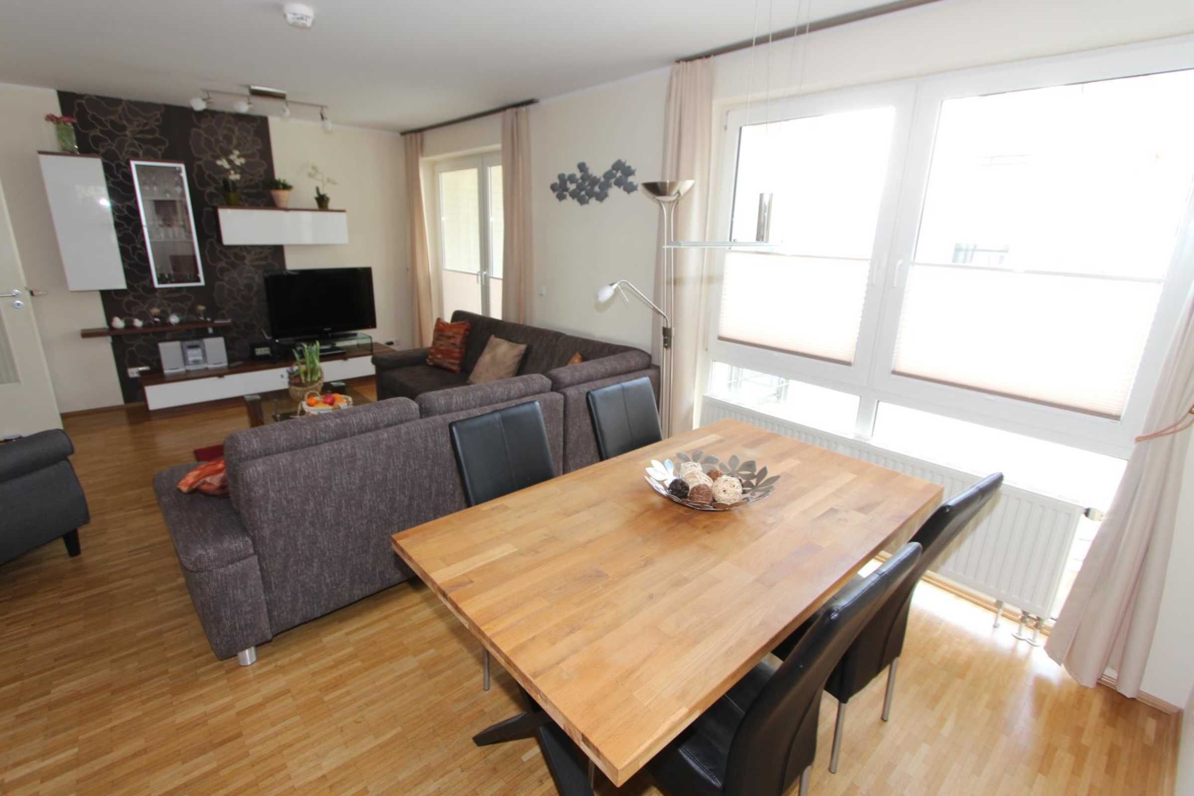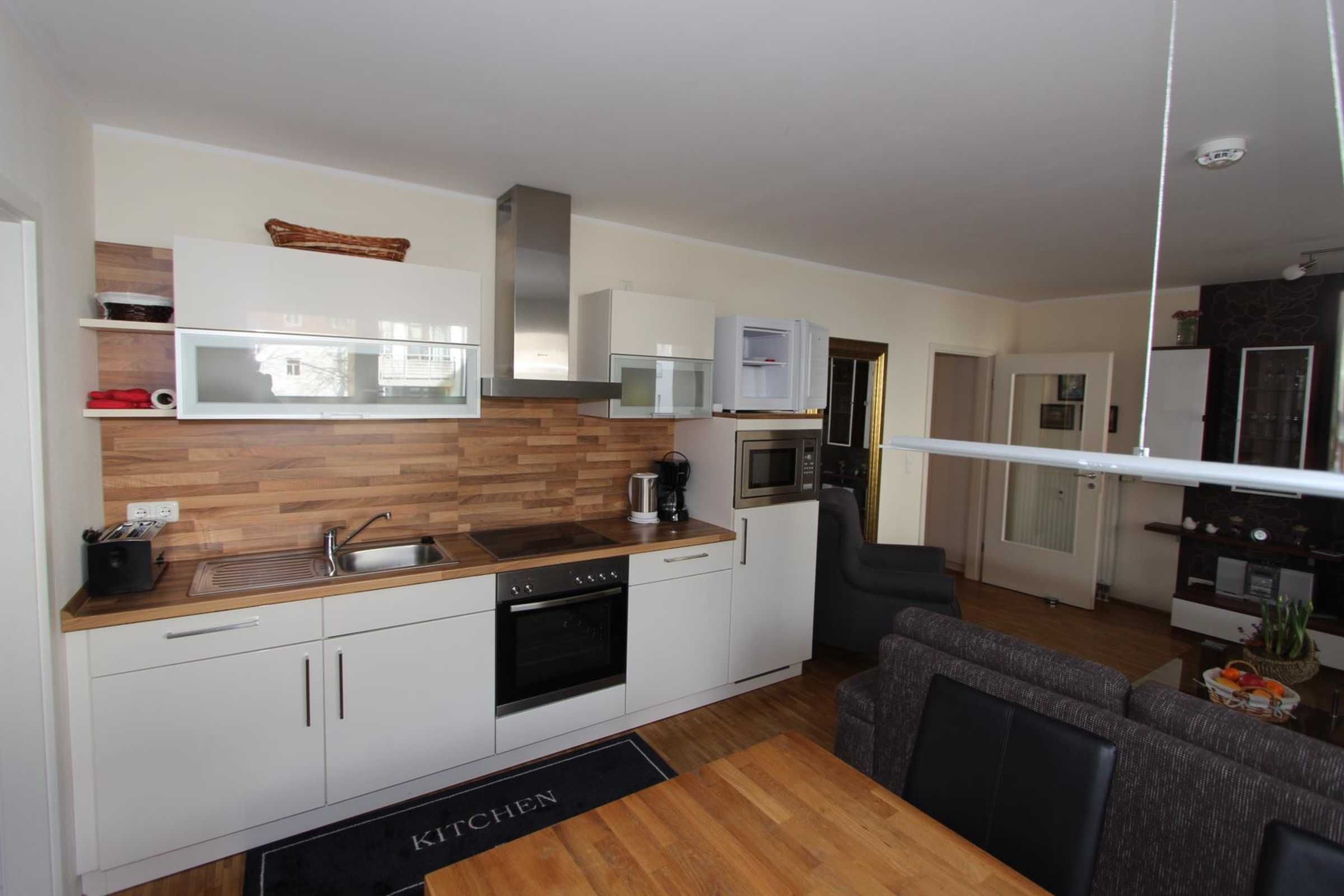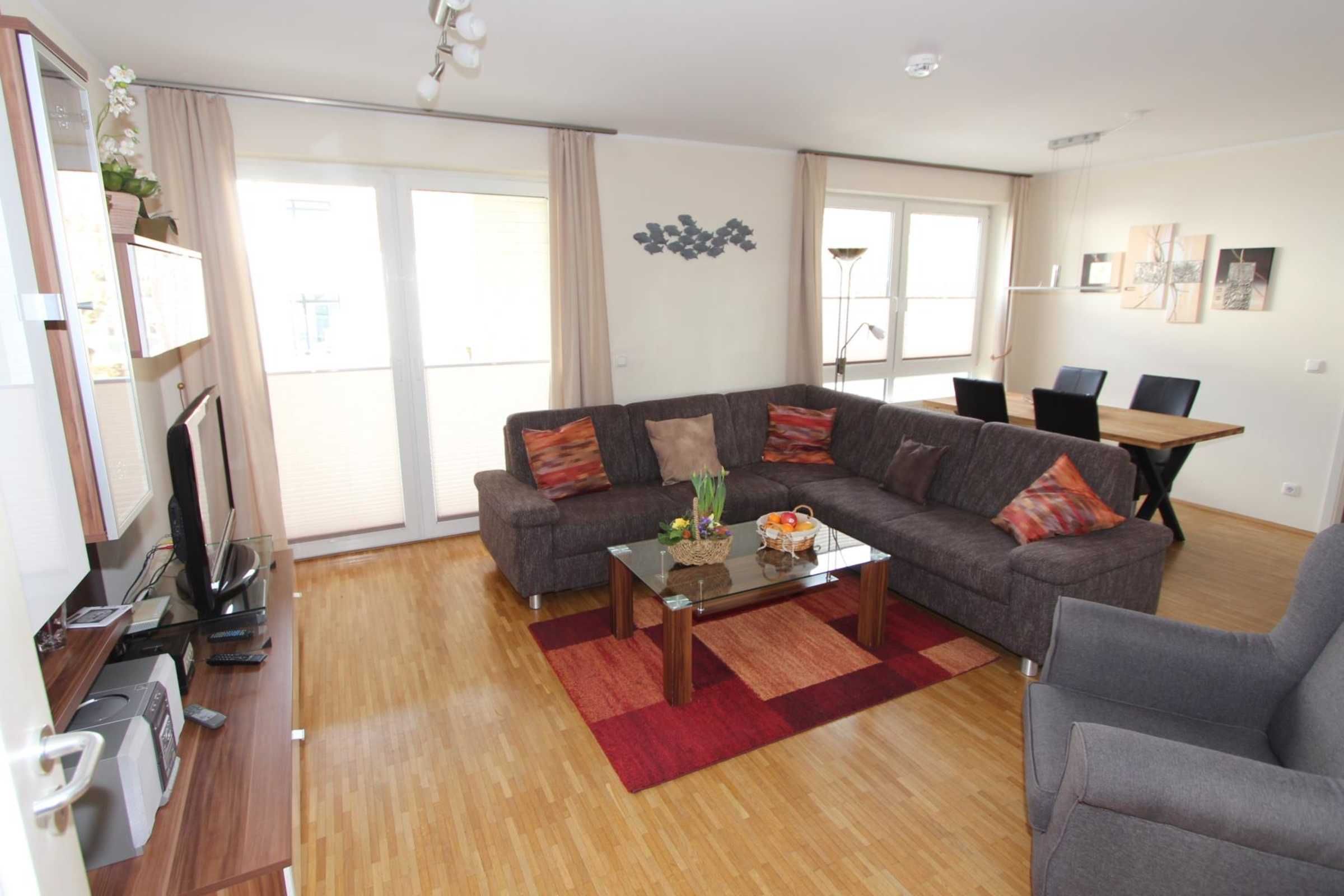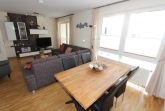 Im Wohn-/Essbereich finden Sie eine moderne Schrankwand mit LCD-TV, DVD Player und Spielekonsole. Die gemütliche Eckcouch lädt nicht nur zum Sitzen und Verweilen, sondern bei Bedarf auch zum Schlafen ein. Die hochwertige Nolte Einbauküche mit Geschirrspüler, Mikrowelle, Cerankochfeld und Backofen sowie ein geschmackvoller Esstisch runden das Gesamtbild ab.