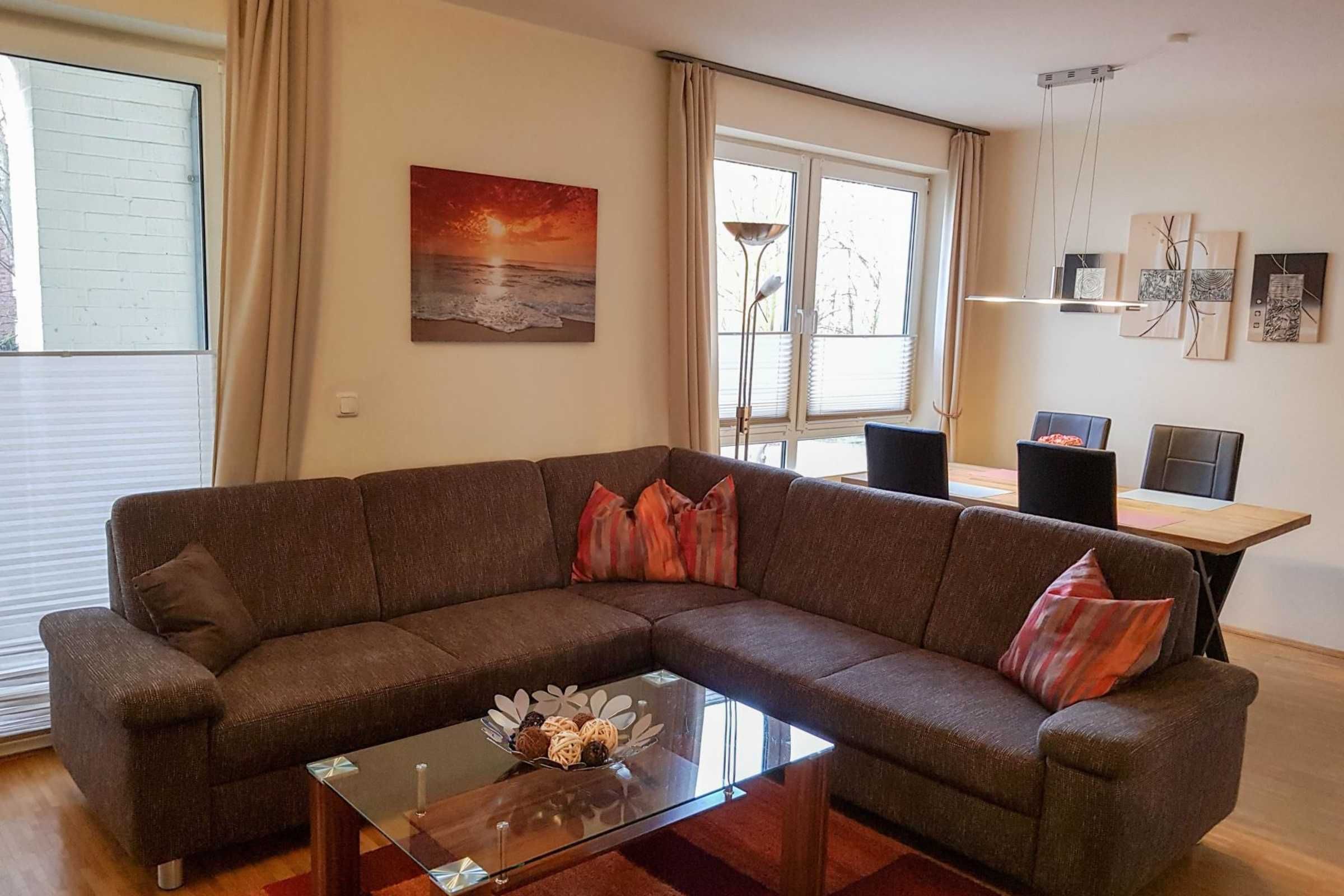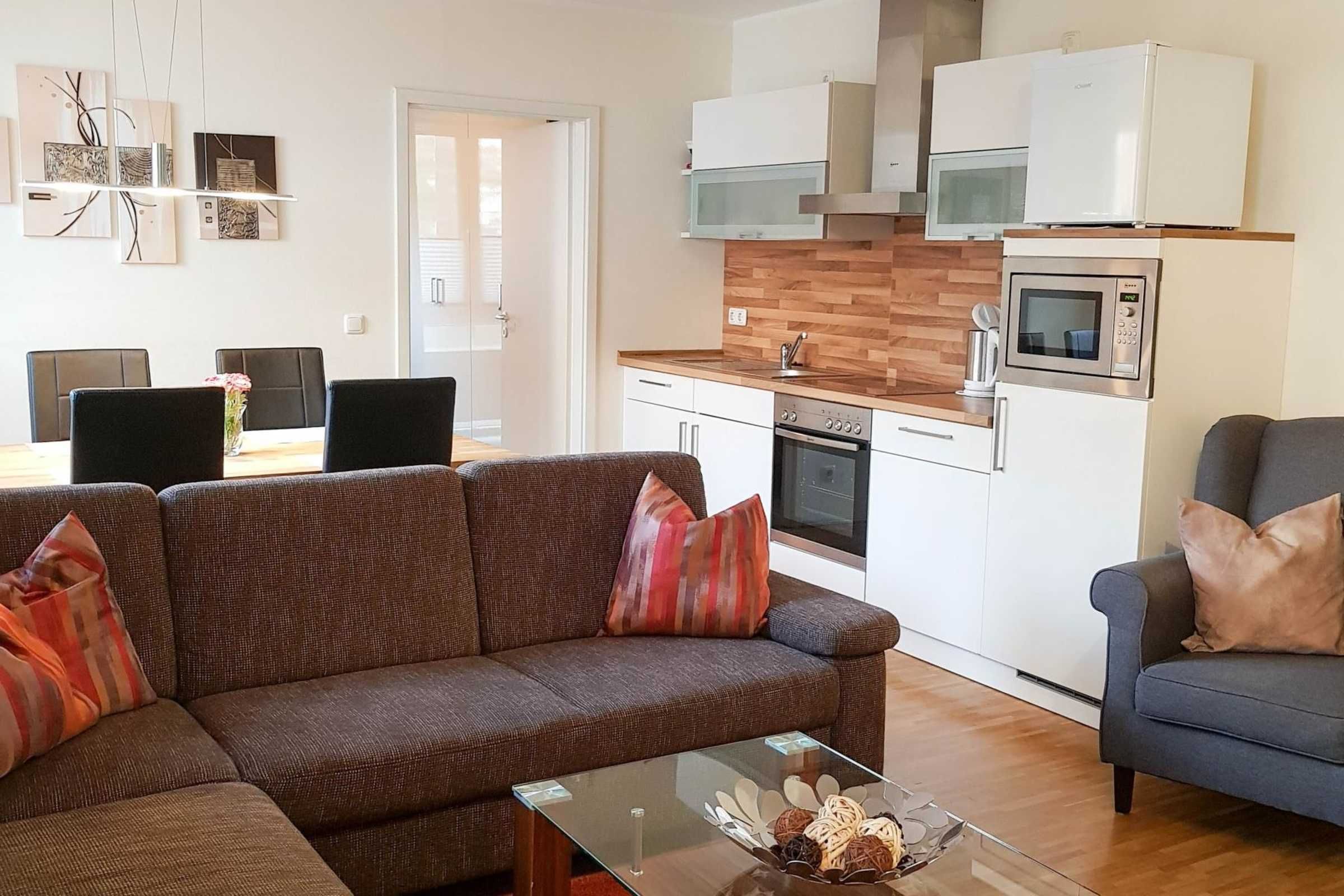 Ihre gut ausgestattete Zwei-Zimmer-Ferienwohnung für bis zu vier Personen verfügt über einen Balkon oder Terrasse, kostenfreies WLAN und sky-Empfang. Sie erreichen die Wohnung bequem mit dem Aufzug, für Ihren PKW steht ein Platz in der Tiefgarage zur Verfügung. Dort befindet sich zudem ein Waschraum mit Münzwaschmaschinen und Münzwäschetrockner und ein Platz für Ihre Fahrräder.