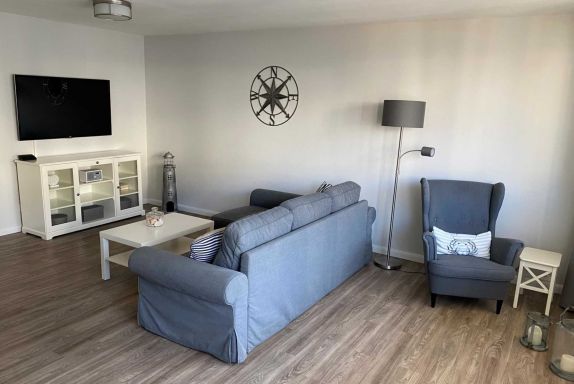 Im Wohnbereich mit maritimem Flair erwartet Sie eine gemütliche Eckcouch mit Schlaffunktion und ein