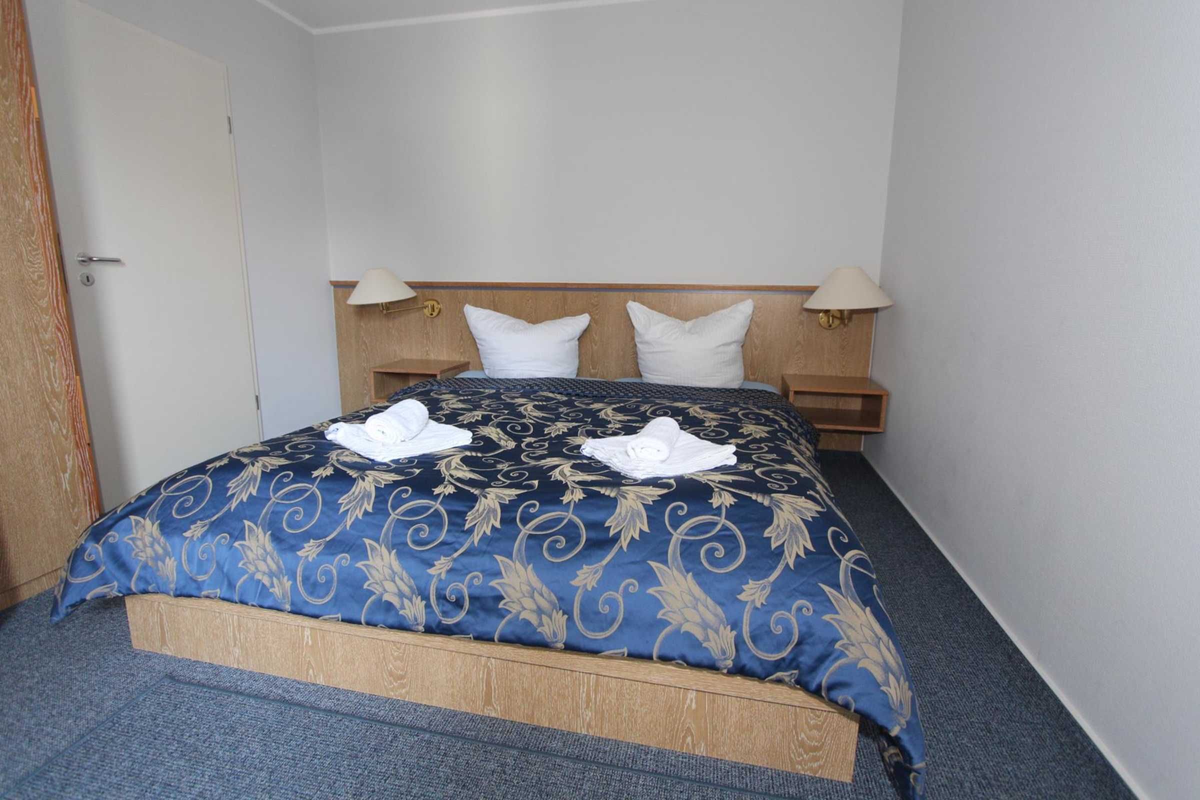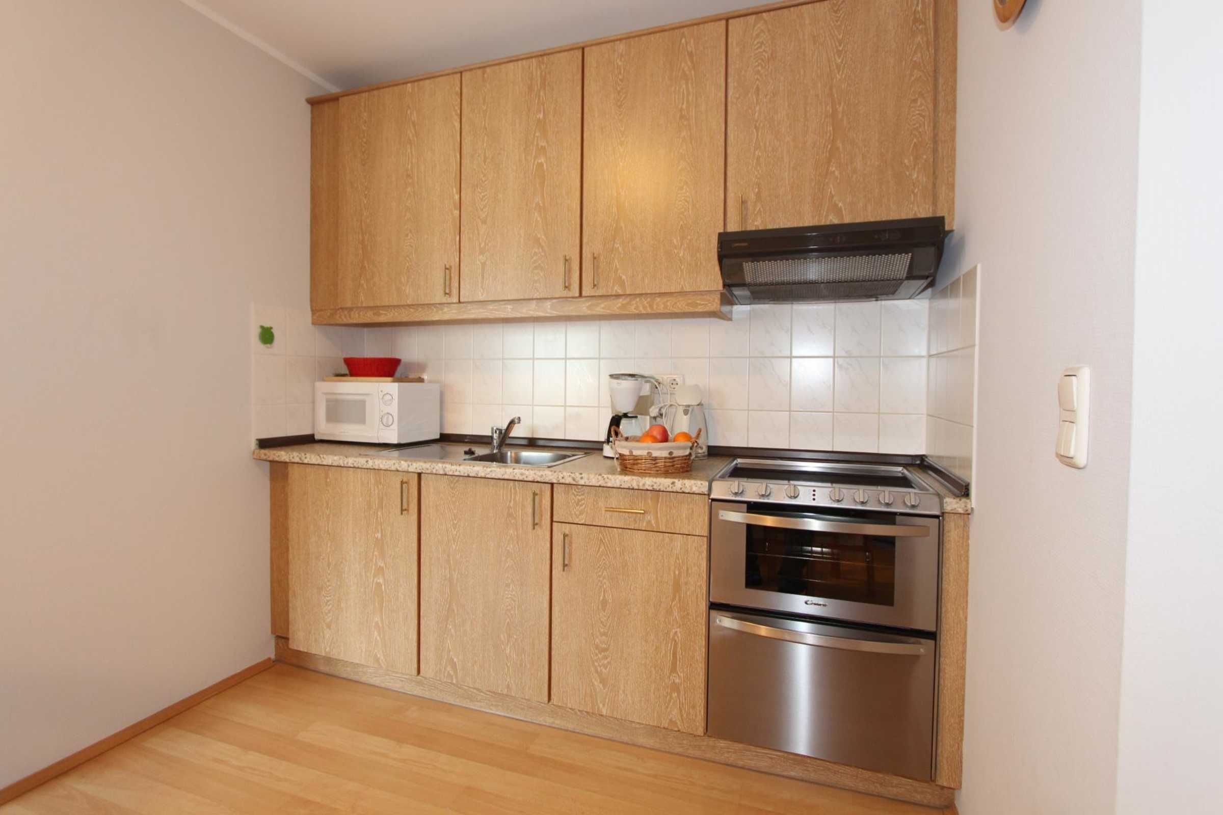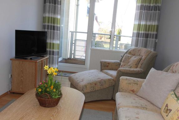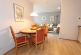 Sie wohnen in einem 2-Zimmer-Appartement für bis zu 4 Personen auf 48 m² Wohnfläche im Obergeschoss. Ein Schlafzimmer mit Doppelbett, Wohn-/Schlafraum mit bequemer Doppelbettcouch, separater Essplatz, voll ausgestatteter Küchenbereich mit Geschirrspüler und Backofen, Dusche/WC, Balkon, SAT-Farb-TV mit sky-Empfang und Telefon. PKW-Stellplatz in der Tiefgarage.