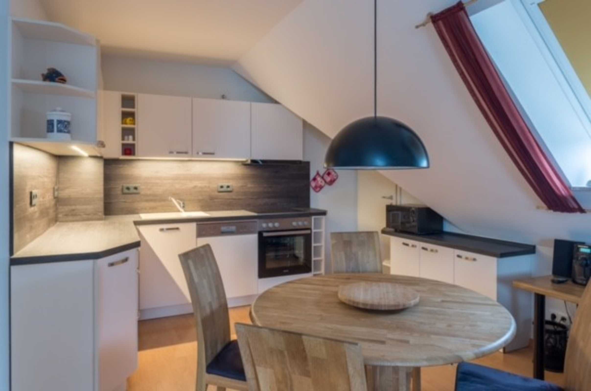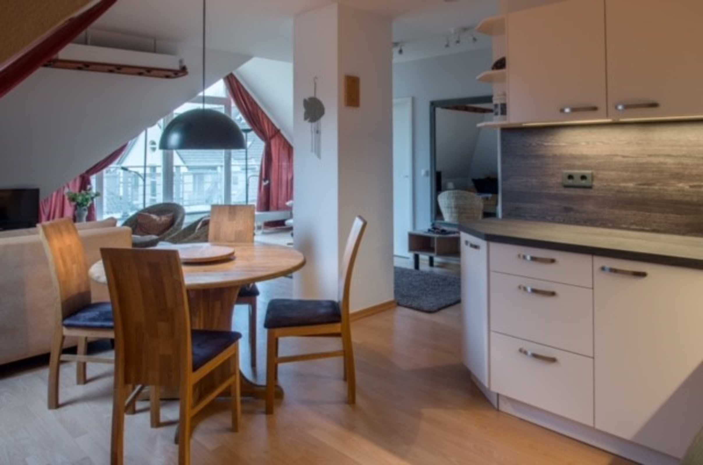 Sie wohnen in einem 2-Zimmer-Appartement für bis zu 4 Pers. auf ca. 60 m² im Spitzboden der Residenz Seestern. Die Wohnung verfügt über ein großes Schlafzimmer mit Doppelbett und Flachbild-TV, einen großen hellen Wohnraum mit bequemer Doppelbettcouch, Flachbild-TV und Telefon, sep. Essplatz, voll ausgestattetem Küchenbereich mit Geschirrspüler, Mikrowelle, Herd mit Backofen und Ceranfeld, sowie reichhaltigem Schrankraum im Küchenbereich, Dusche/WC und über eine große Dachterrasse (Südseite). Zugang zum Hallenbad innerhalb des Gebäudekomplexes. Tiefgaragenplatz innerhalb des Hauses.