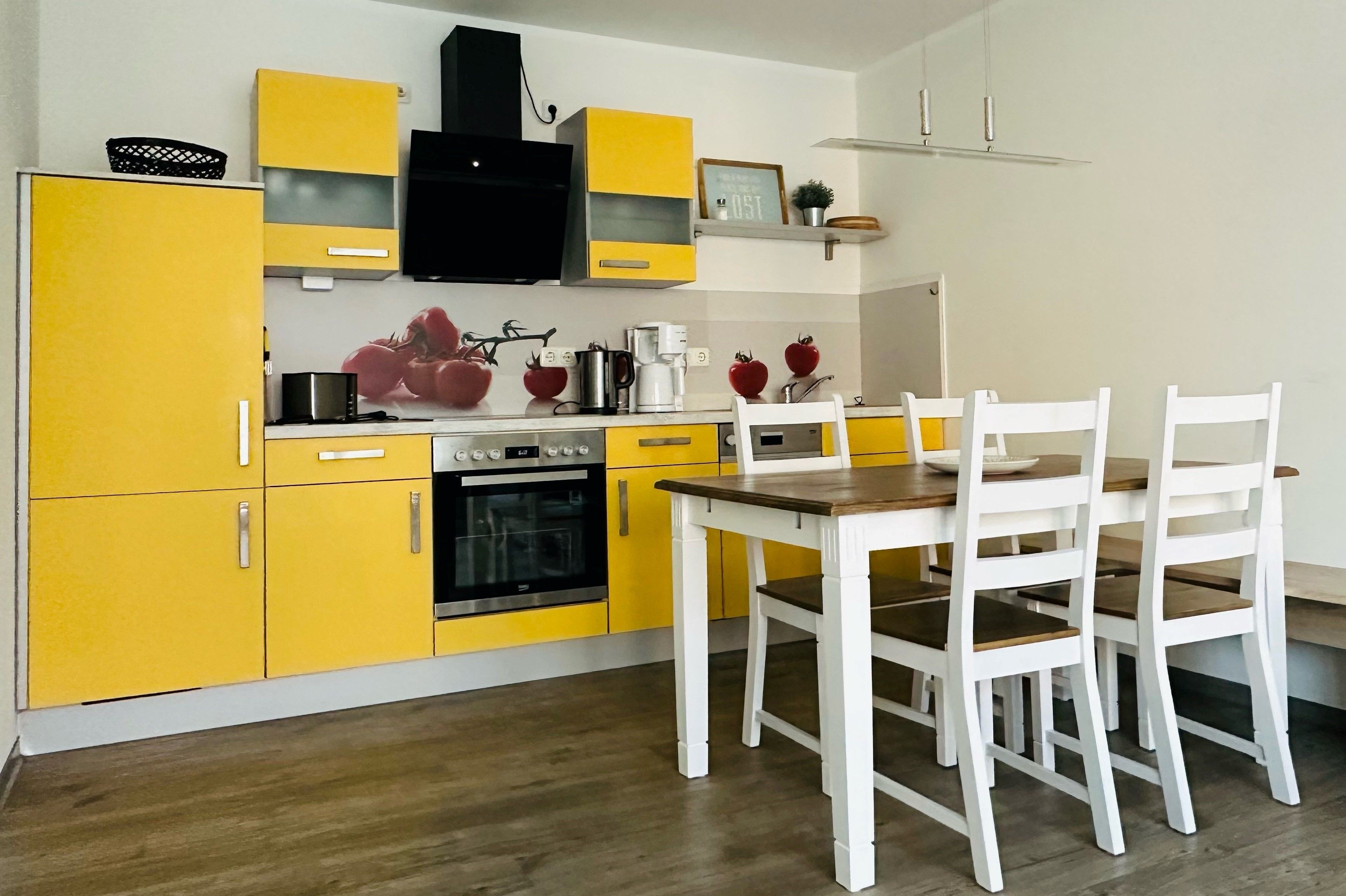 - voll ausgestattete Küche mit kombiniertem Backofen inkl. Mikrowelle und Spülmaschine