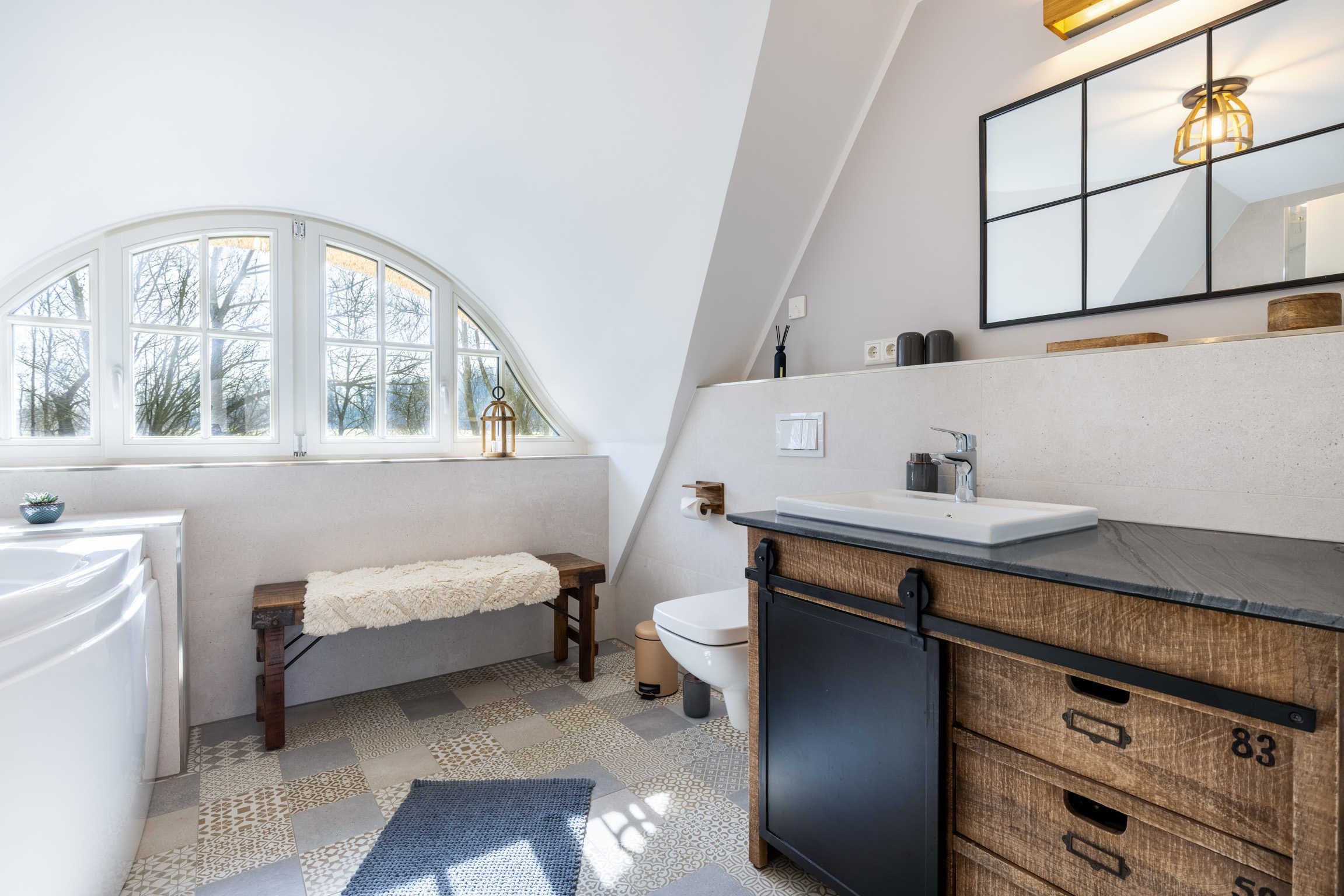 Das Wellnessbad mit Blick in die unverbaute Natur lädt zu Wohlfühlzeiten im Whirlpool und der großen Dusche mit Regenbrause ein.