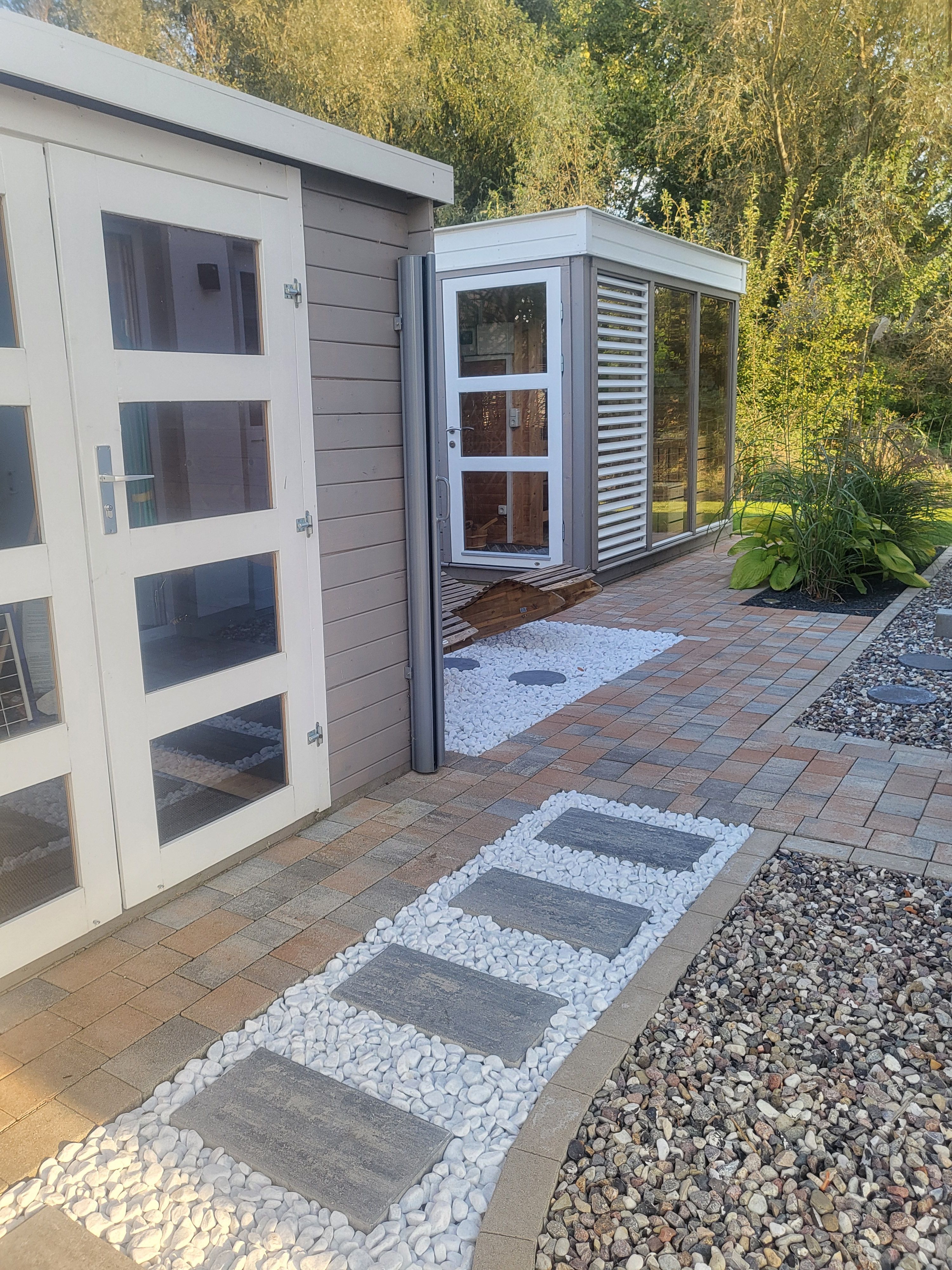 Das Haus hat einen in sich geschlossenen Außenbereich mit einem exklusiven Saunahaus und Relaxbereich im Garten und Außendusche (Nutzung von Ende April bis Ende Oktober). Es gibt Terrassenbereiche rund um das Haus, um immer ein passendes Plätzchen in der Sonne oder auch im Schatten genießen zu können. Gartenmöbel und ein Strandkorb laden zum gemeinsamen Entspannen im Freien ein. Zusätzlich gibt es ein separates Gartenhaus für Fahrräder und Outdoor Equipment (verfügbar ab Sommer 2022).