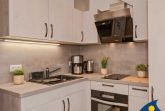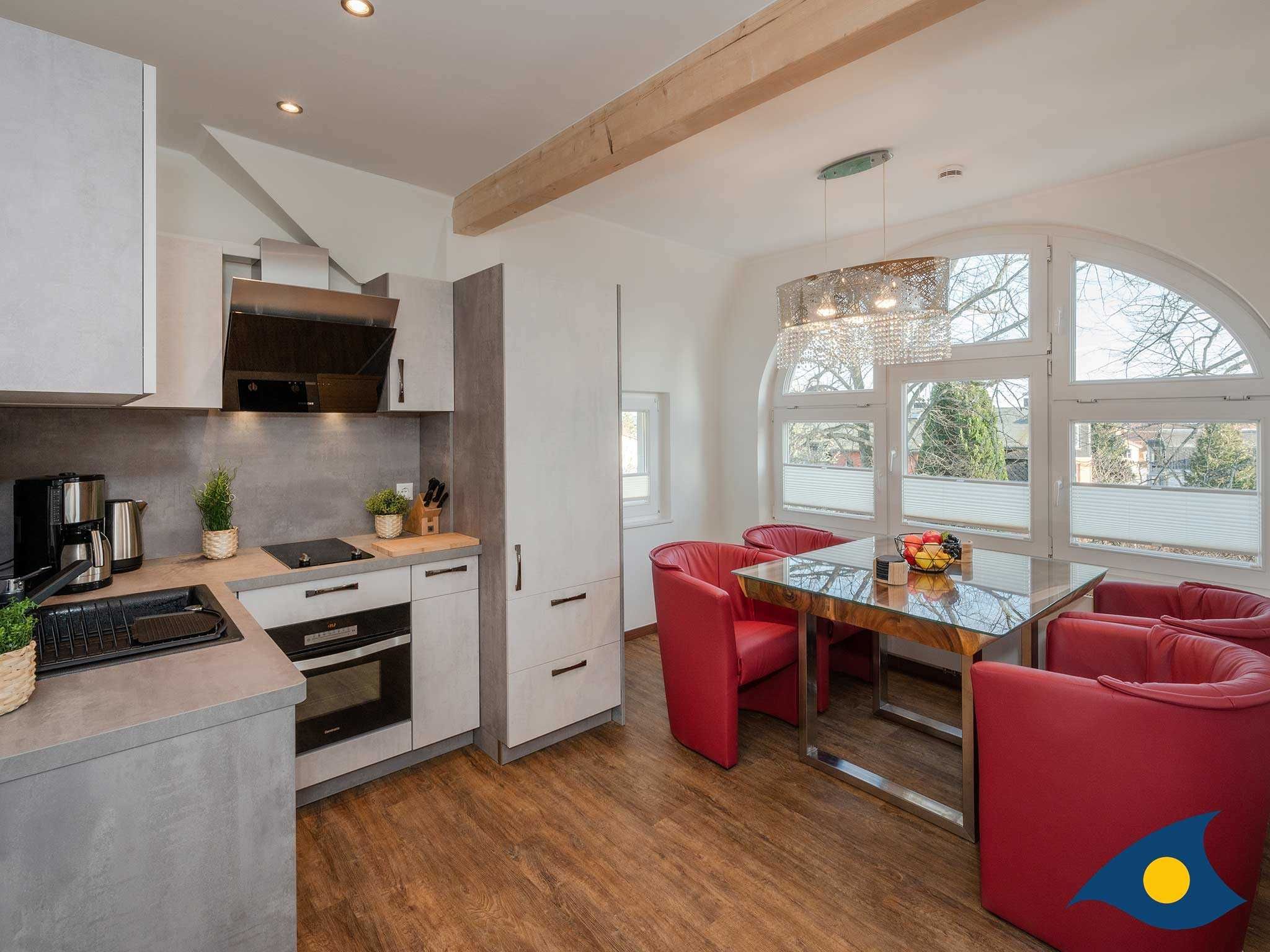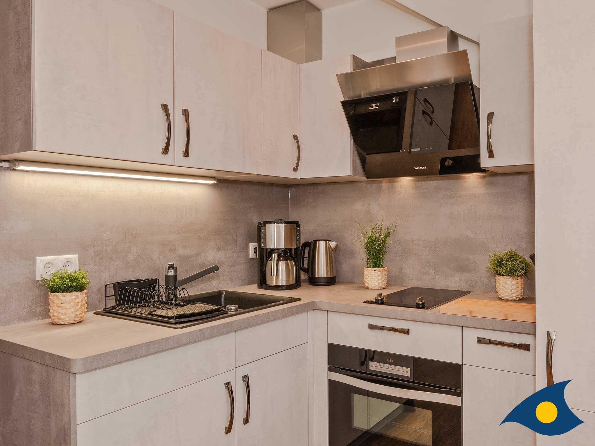 Eine komplett ausgestattete, offene Küche mit Kaffeemaschine, Herd, und Toaster, ein modernes Badezimmer mit Dusche sowie ein großzügiges Schlafzimmer mit Doppelbett, bieten Ihnen alles, was Sie für einen perfekten Usedom Urlaub in Seebad Bansin benötigen.