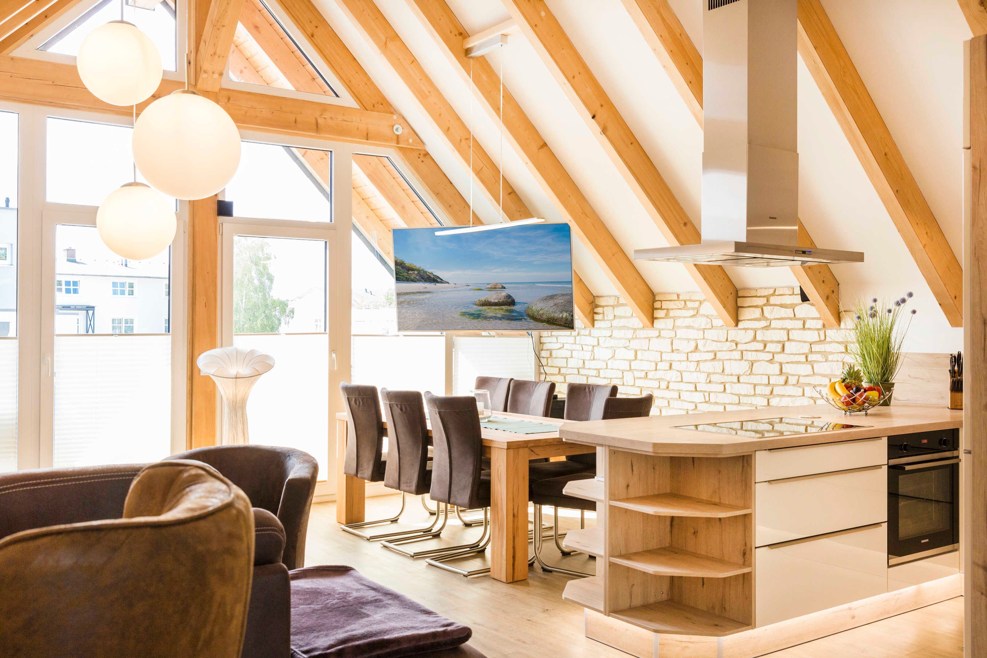 Schon in der großzügigen Diele erwartet Sie eine helle Leseecke mit Relaxstuhl. Im großen Wohn- und Küchenbereich mit direkter Sicht auf die hohe Kathedralen-Decke befindet sich die offene, voll ausgestattete Küche mit vielen Extras. Perfekt geplant lädt Freunde der kulinarischen Unabhängigkeit zu ausgiebigen Kochabenden ein.