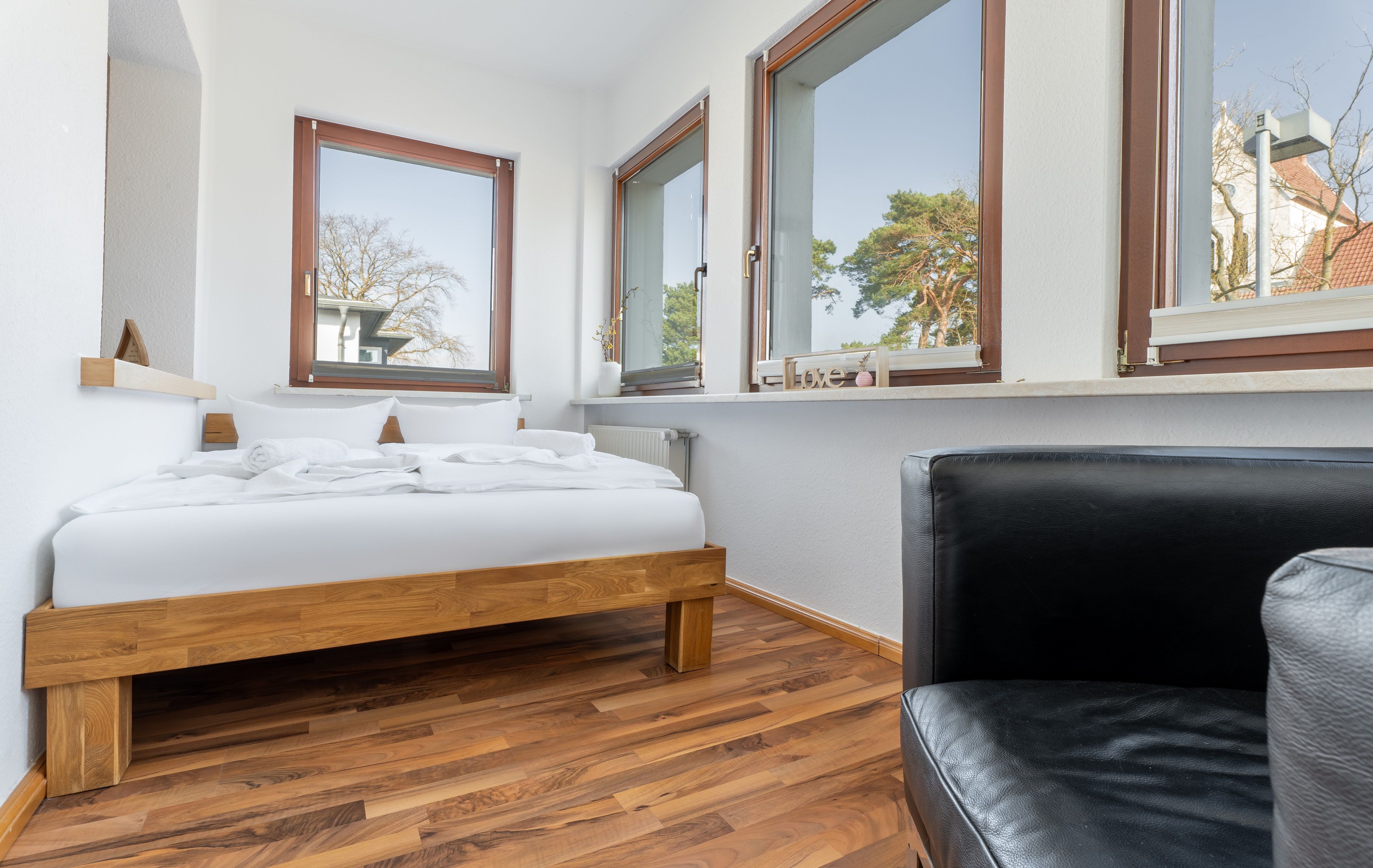 Auf 65 qm finden Sie Ruhe und Entspannung. Zu zweit, mit Kindern oder Freunden - bis zu vier Personen (Doppelbett (160x200) im Schlafzimmer, ein Doppelbett (140x200) in der offenen Veranda) finden bei uns Platz.