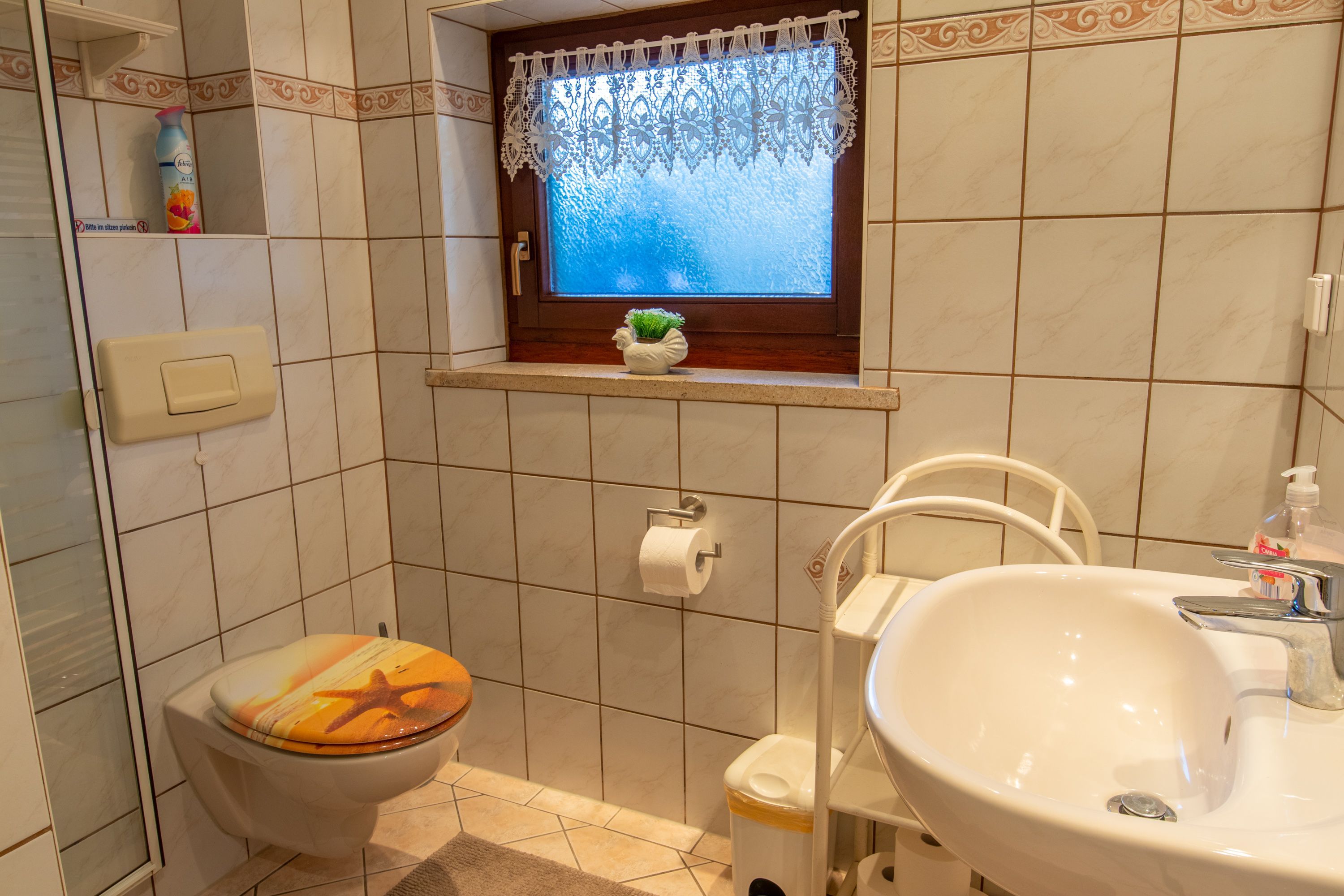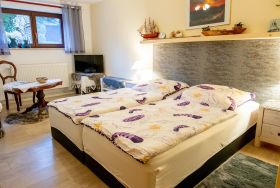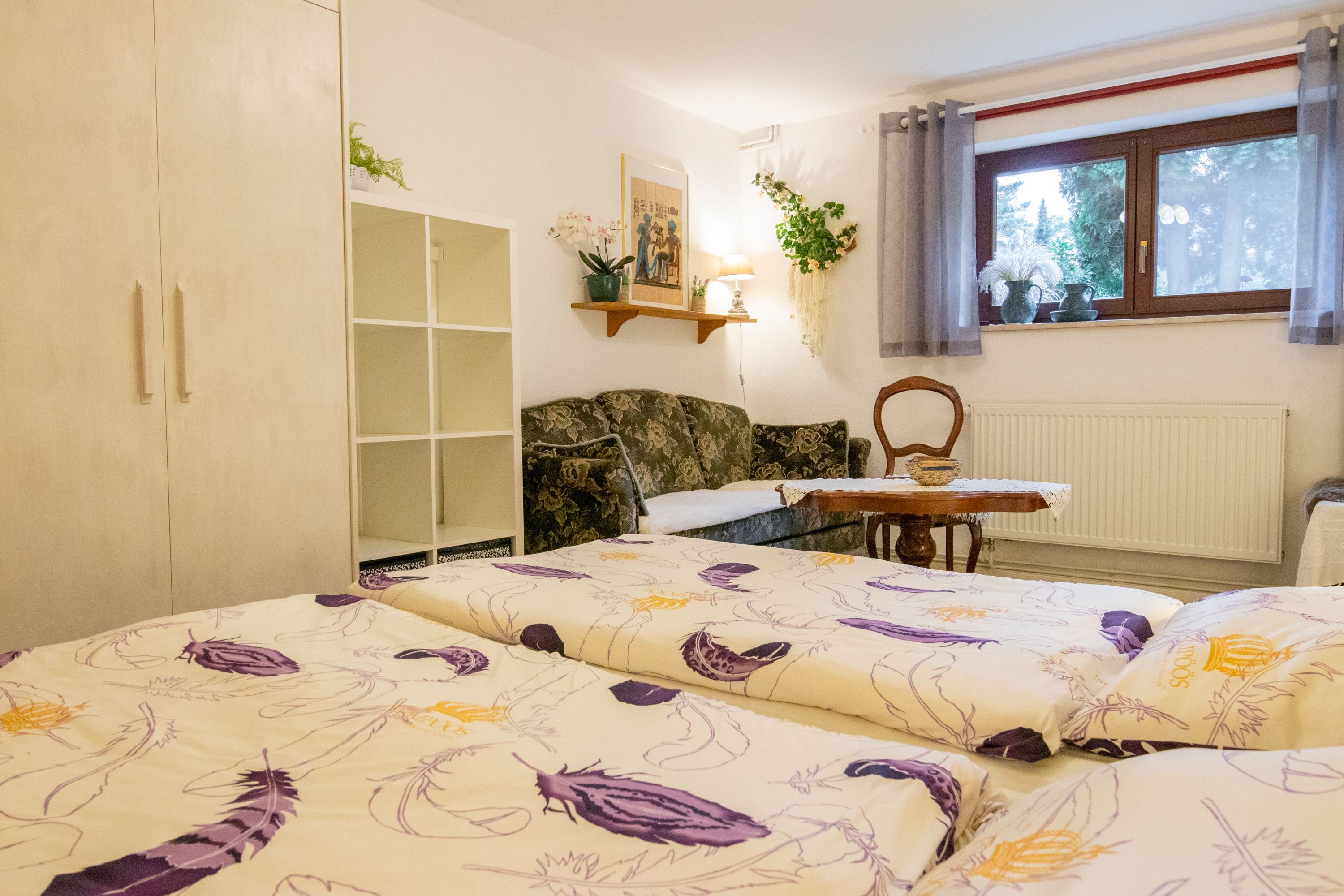 Die 55 m² Souterrain-Wohnung Timmy in Lubmin besteht aus einem Schlafzimmer, einem Wohnzimmer, einer separaten Küche und einem Badezimmer mit Dusche für 3 Personen. Das Schlafzimmer verfügt über einen TV, Kleiderschrank und einer Sitzecke mit Couch sowie zwei Einzelbetten (90x200) die auch als Doppelbett zusammengeschoben werden können. Im Wohnzimmer befinden sich ein Sofa, ein Schlafsofa (140x200), ein TV und ein Kleiderschrank. Zu der voll ausgestatteten Einbauküche gehört ein Kühlschrank mit Gefrierfach, eine Abzugshaube, ein Ceranfeld, ein Backofen sowie eine Mikrowelle, Wasserkocher und Kaffeemaschine. In der Küche befindet sich zusätzlich eine Sitzecke für 3 Personen. Die freundlich eingerichtete Ferienwohnung am Küstenwald, 400 m vom Badestrand entfernt, ist über einen separaten Eingang erreichbar. Eine Terrasse mit Gartenmöbeln und Grill sowie PKW-Stellplatz befinden sich auf dem Hof, auf dem auch Fahrräder untergestellt werden können. Da sich auf dem Hof auch ein unbewachter, nicht umzäunter Teich befindet, können wir Buchungen mit Kindern bis 17 Jahren leider nicht realisieren. Eigene Haustiere dürfen nicht mitgebracht werden, aber der hauseigene Hund freut sich über jeden Gast.