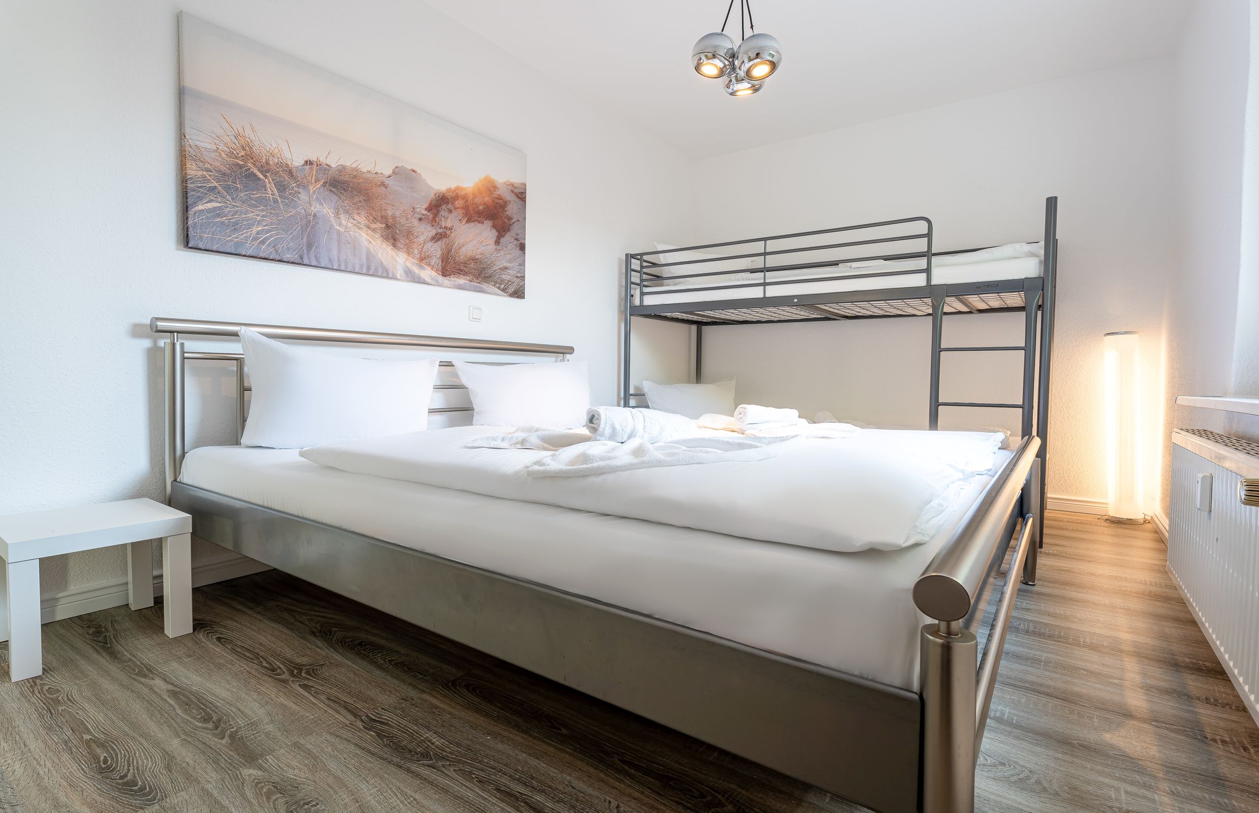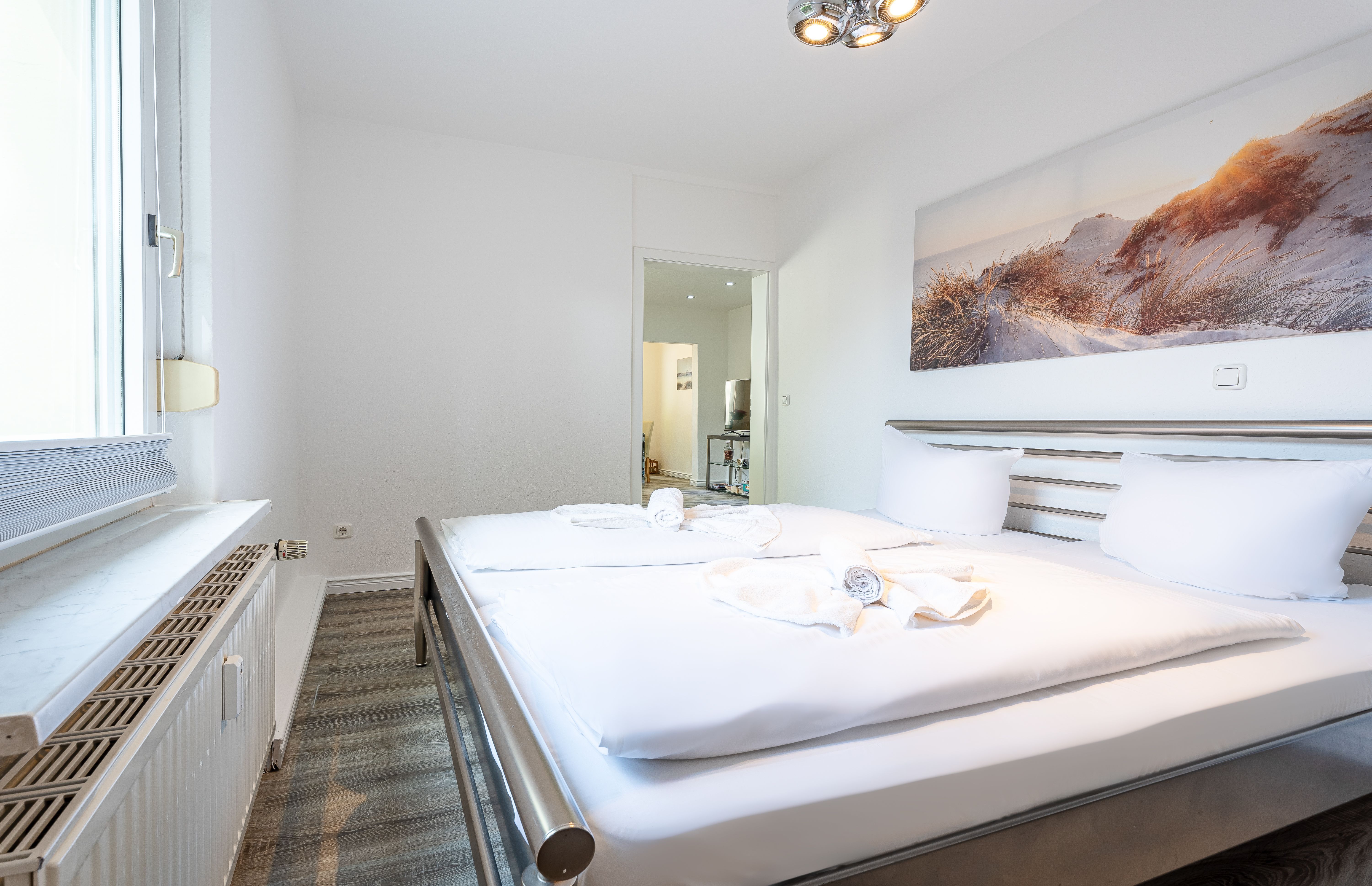 Im Erdgeschoss der liebevoll sanierten Villa Helga finden Sie als Paar oder in Familie genügend Raum mit sechs Schlafplätze. Im Schlafzimmer befinden sich ein großes 180 cm breites Doppelbett und ein Etagenbett mit zwei 90 cm breiten Matratzen. Für etwas mehr Ruhe haben wir auch ein zweites Schlafzimmer mit einem 140 cm breiten Doppelbett zu bieten.