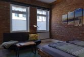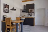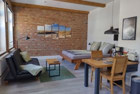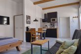 Die Ferienwohnung besteht aus einem großen Wohn-/Schlafbereich mit einer offenen Küche, einem Badezimmer mit WC und Dusche, einem Essbereich mit Tisch und 2 Stühlen und einer Garderobe.